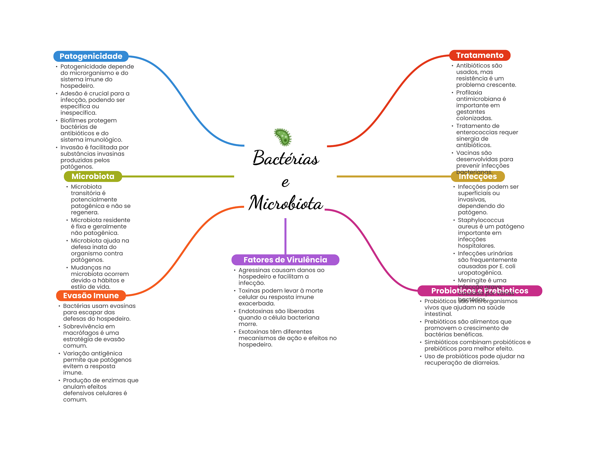 Patogenicidade Tratamento Patogenicidade depende Antibióticos são do microrganismo e do usados, mas sistema imune do resistência é um hospedeiro. problema crescente. Adesão é crucial para a Profilaxia infecção, podendo ser antimicrobiana é específica ou importante em inespecífica. gestantes Biofilmes protegem colonizadas. bactérias de Tratamento de antibióticos e do enterococcias requer sistema imunológico. sinergia de Invasão é facilitada por antibióticos. substâncias invasinas Bactérias Vacinas são produzidas pelos desenvolvidas para patógenos. prevenir infecções bacterianas Microbiota Infecções Microbiota e Infecções podem ser transitória é superficiais ou potencialmente patogênica e não se Microbiota invasivas, dependendo do regenera. patógeno. Microbiota residente Staphylococcus é fixa e geralmente aureus é um patógeno não patogênica. importante em Microbiota ajuda na infecções defesa inata do hospitalares. organismo contra Infecções urinárias patógenos. Fatores de Virulência são frequentemente Mudanças na causadas por E. coli Agressinas causam danos ao microbiota ocorrem uropatogênica. hospedeiro e facilitam a devido a hábitos e infecção. Meningite é uma estilo de vida. Toxinas podem levar à morte Probioticos e Prebioticos Evasão Imune celular ou resposta imune exacerbada. Probióticos Bactérias usam evasinas Endotoxinas são liberadas vivos que ajudam na saúde para escapar das intestinal. defesas do hospedeiro. quando a célula bacteriana Sobrevivência em morre. Prebióticos são alimentos que macrófagos é uma Exotoxinas têm diferentes promovem crescimento de bactérias benéficas. estratégia de evasão mecanismos de ação e efeitos no comum. hospedeiro. Simbióticos combinam probióticos e prebióticos para melhor efeito. Variação antigênica Uso de probióticos pode ajudar na permite que patógenos evitem a resposta recuperação de diarreias. imune. Produção de enzimas que anulam efeitos defensivos celulares é comum.