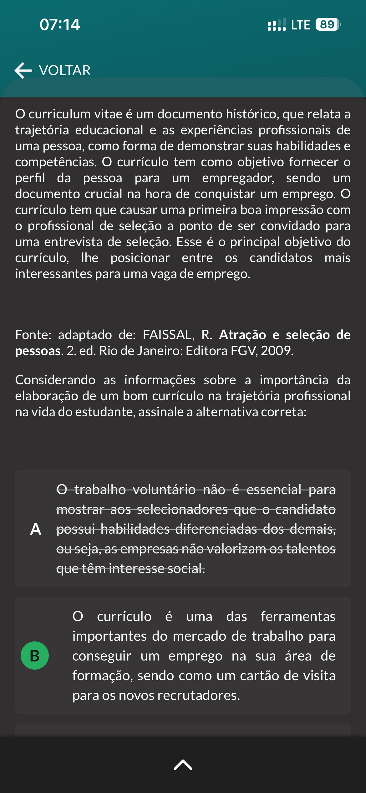 07:14 LTE 89 VOLTAR curriculum vitae é um documento histórico, que relata a trajetória educacional e as experiências profissionais de uma pessoa, como forma de demonstrar suas habilidades e competências. currículo tem como objetivo fornecer perfil da pessoa para um empregador, sendo um documento crucial na hora de conquistar um emprego. currículo tem que causar uma primeira boa impressão com profissional de seleção a ponto de ser convidado para uma entrevista de seleção. Esse é principal objetivo do currículo, lhe posicionar entre os candidatos mais interessantes para uma vaga de emprego. Fonte: adaptado de: FAISSAL, R. Atração e seleção de pessoas. 2. ed. Rio de Janeiro: Editora FGV, 2009. Considerando as informações sobre a importância da elaboração de um bom currículo na trajetória profissional na vida do estudante, assinale a alternativa correta: trabalho voluntário não é essencial para mostrar aos selecionadores que candidato possui habilidades diferenciadas dos demais, ou seja, as empresas não valorizam talentos que têm interesse social. currículo é uma das ferramentas importantes do mercado de trabalho para B conseguir um emprego na sua área de formação, sendo como um cartão de visita para os novos recrutadores.
