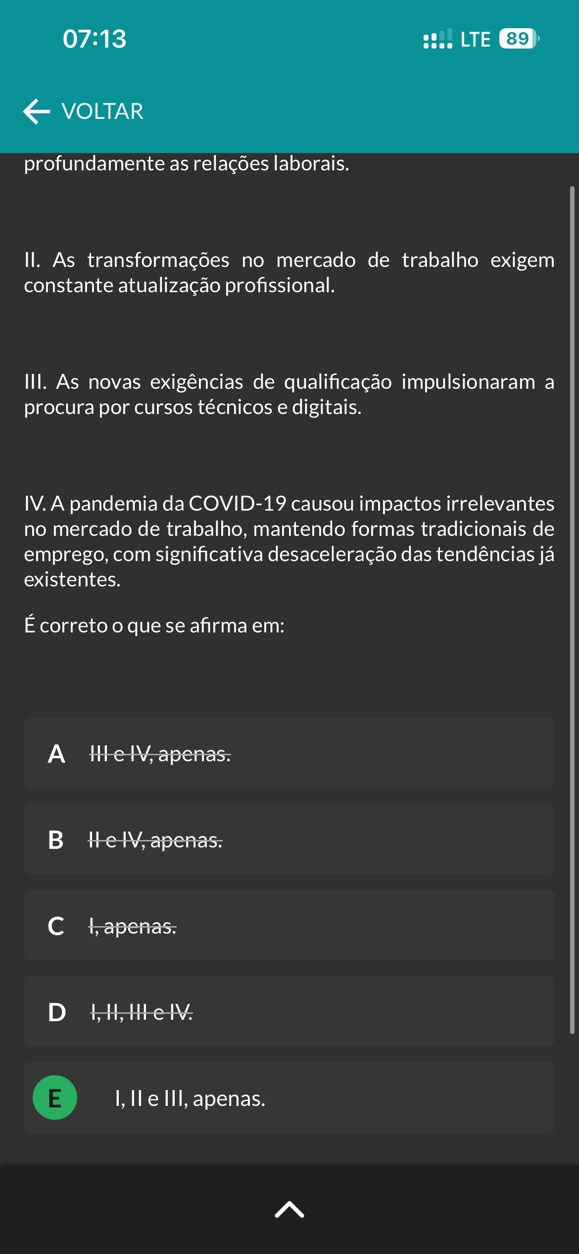 07:13 LTE 89 VOLTAR profundamente as relações laborais. II. As transformações no mercado de trabalho exigem constante atualização profissional. III. As novas exigências de qualificação impulsionaram a procura por cursos técnicos e digitais. IV. pandemia da COVID-19 causou impactos irrelevantes no mercado de trabalho, mantendo formas tradicionais de emprego, com significativa desaceleração das tendências já existentes. É correto que se afirma em: A c D E III, apenas.