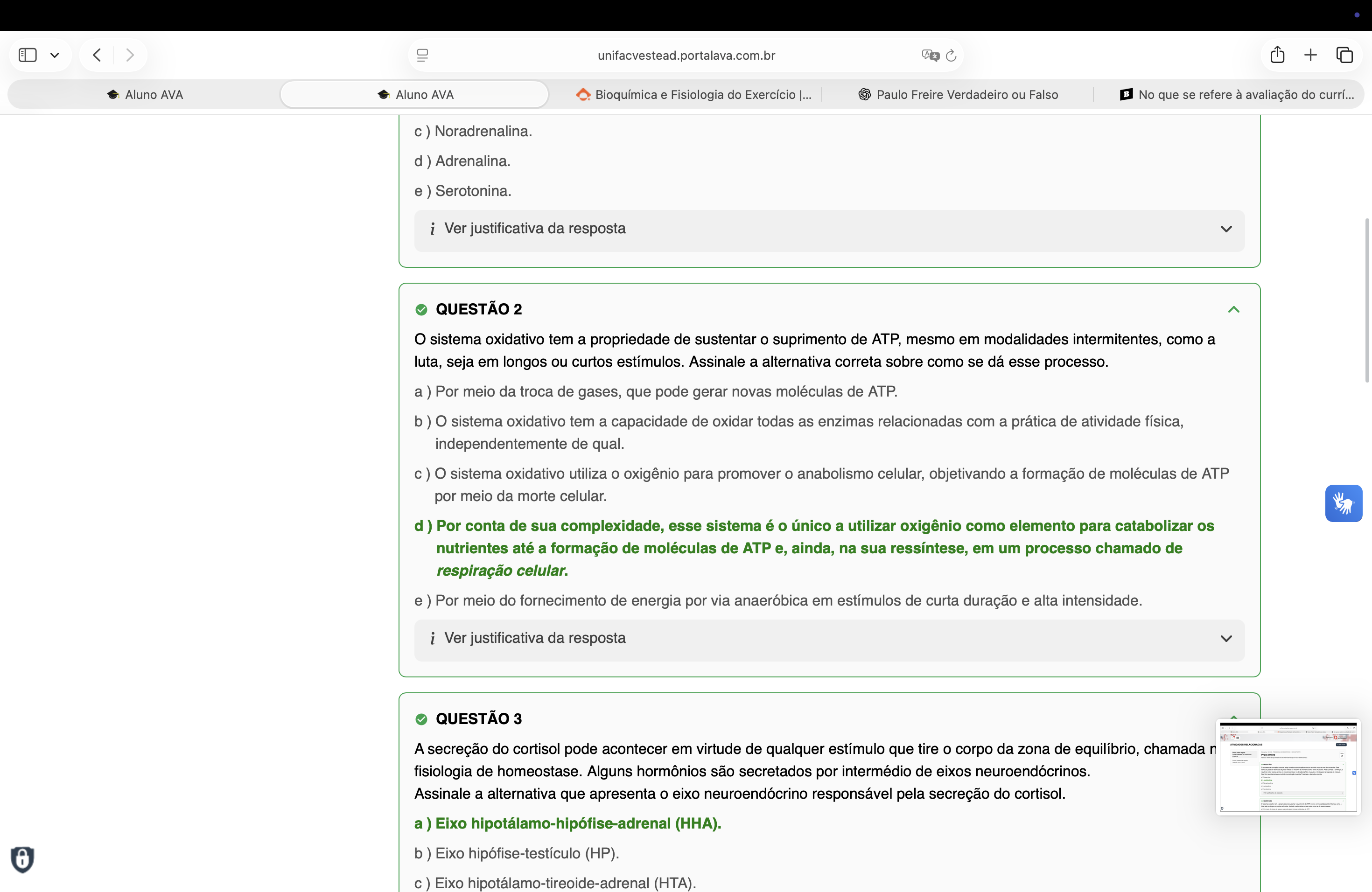 unifacvestead.portalava.com.br + Aluno AVA Aluno AVA Bioquímica e Fisiologia do Exercício |... Paulo Freire Verdadeiro ou Falso No que se refere à avaliação do currí... c) Noradrenalina. d) Adrenalina. e) Serotonina. i Ver justificativa da resposta QUESTÃO 2 sistema oxidativo tem a propriedade de sustentar o suprimento de ATP, mesmo em modalidades intermitentes, como a luta, seja em longos ou curtos estímulos. Assinale a alternativa correta sobre como se dá esse processo. a) Por meio da troca de gases, que pode gerar novas moléculas de ATP. b) sistema oxidativo tem a capacidade de oxidar todas as enzimas relacionadas com a prática de atividade física, independentemente de qual. c) sistema oxidativo utiliza o oxigênio para promover o anabolismo celular, objetivando a formação de moléculas de ATP por meio da morte celular. d) Por conta de sua complexidade, esse sistema é único a utilizar oxigênio como elemento para catabolizar os nutrientes até a formação de moléculas de ATP e, ainda, na sua ressíntese, em um processo chamado de respiração celular. e) Por meio do fornecimento de energia por via anaeróbica em estímulos de curta duração e alta intensidade. i Ver justificativa da resposta QUESTÃO 3 A secreção do cortisol pode acontecer em virtude de qualquer estímulo que tire o corpo da zona de equilíbrio, chamada n fisiologia de homeostase. Alguns hormônios são secretados por intermédio de eixos neuroendócrinos. Assinale a alternativa que apresenta o eixo neuroendócrino responsável pela secreção do cortisol. a) Eixo hipotálamo-hipófise-adrenal (HHA). b) Eixo (HP). c) Eixo hipotálamo-tireoide-adrenal (HTA).