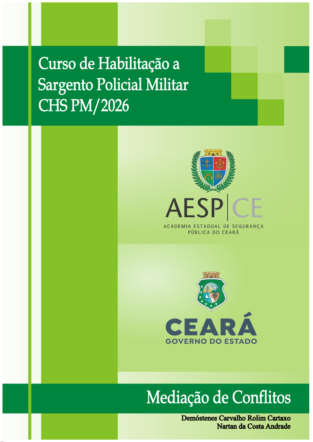GOVERNO DO ESTADO DO CEARÁ ELMANO de FREITAS da Costa GOVERNADOR DO ESTADO DO CEARÁ SECRETARIA DA SEGURANÇA PÚBLICA E DEFESA SOCIAL - SSPDS Antonio ROBERTO Cesário de SÁ - DPF SECRETÁRIO DA SSPDS ACADEMIA ESTADUAL DE SEGURANÇA PÚBLICA DO CEARÁ – AESP|CE LEONARDO D`Almeida Couto BARRETO - DPC DIRETOR-GERAL DA AESP|CE CIRO de Assis Lacerda – DPC DIRETOR-GERAL ADJUNTO DA AESP|CE EVANDRO Queiroz de Assunção – Cel PM DIRETOR DE ENSINO POLICIAL MILTAR DA AESP|CE Pâmela Costa LANDIM Saboya – Maj PM SECRETÁRIA ACADÊMICA DA AESP|CE CURSO DE HABILITAÇÃO A SARGENTO POLICIAL MILITAR - CHS PM/2026 DISCIPLINA MEDIAÇÃO DE CONFLITOS CONTEUDISTAS Demóstenes Carvalho Rolim Cartaxo Nartan da Costa Andrade FORMATAÇÃO JOELSON Pimentel da Silva – ST PM • 2026 • SUMÁRIO MEDIAÇÃO DE CONFLITOS ................................................................................................. 1 INTRODUÇÃO ..................................................................................................................... 1 UNIDADE 1 – CONTEXTUALIZAÇÃO HISTÓRICA E OS MECANISMOS ALTERNATIVOS DE RESOLUÇÃO PACÍFICA DE CONFLITOS SOCIAIS .................................................................... 2 1.1. Antecedentes Históricos ........................................................................................... 2 1.2. Mecanismos Alternativos ou Consensuais de Resolução dos Conflitos Sociais .......... 6 1.3. A Arbitragem ............................................................................................................. 8 1.4. Negociação ............................................................................................................. 10 1.5. Conciliação .............................................................................................................. 11 UNIDADE 2 – A MEDIAÇÃO COMO ALTERNATIVA CONSENSUAL À RESOLUÇÃO DOS CONFLITOS: ...................................................................................................................... 13 2.1. Noções e Conceitos Gerais de Mediação de Conflitos ............................................. 13 2.2. Princípios da Mediação de Conflitos ....................................................................... 17 2.3. Objetivos de Mediação de Conflitos ........................................................................ 19 2.4. Características do Mediador ................................................................................... 20 2.5. Procedimentos da Mediação de Conflitos ............................................................... 22 UNIDADE 3 – FORMAS DE EXPRESSÃO E MODELOS DA MEDIAÇÃO DE CONFLITOS: ......... 25 3.1. Abrangência da Mediação de Conflitos ................................................................... 25 3.2. Modelos e técnicas de mediação de conflitos ......................................................... 26 3.3. Espécies de Mediação De Conflitos ......................................................................... 27 UNIDADE 4 – AS EXPERIÊNCIAS PRÁTICAS DA CRIAÇÃO DA MEDIAÇÃO DE CONFLITOS NA SEARA DA SEGURANÇA PÚBLICA: ..................................................................................... 28 UNIDADE 5 – A JUSTIÇA RESTAURATIVA: .......................................................................... 33 CONCLUSÃO ..................................................................................................................... 37 REFERÊNCIAS ................................................................................................................... 38 ANEXO ÚNICO .................................................................................................................. 39 1 MEDIAÇÃO DE CONFLITOS INTRODUÇÃO A disciplina de MEDIAÇÃO DE CONFLITOS tem por desiderato apresentar ao aluno, a importância da utilização de tal mecanismo alternativo ou consensual na resolução dos conflitos sociais, e os seus reflexos no âmbito da Segurança Pública do Estado do Ceará. Sob tal ótica, há de se salientar que tal Disciplina é de extrema importância à formação dos profissionais de Segurança Pública, na medida em que possam ter uma noção exata da eficiência de utilização dos mecanismos consensuais ou alternativos de resolução de conflitos existentes no Ordenamento Jurídico, ressaltando, sobretudo, a utilização da mediação de conflitos que consolida-se cada vez mais como um meio eficaz e célere na solução de controvérsias. Eis que no trabalho que se apresenta procurou-se conferir a devida relevância ao festejado mecanismo que vem avançando cada vez mais nos mais diversos ambientes como empresas, escolas e instituições públicas como, por exemplo, as que compõem o sistema de Segurança Pública no Brasil. Sendo assim, na Unidade I apresentar-se-á de uma forma rápida a evolução histórica dos estudos dos conflitos sociais desde os primórdios da humanidade e as formas de solução, até atingir o momento da preponderância da jurisdição e do surgimento dos denominados mecanismos alternativos de resolução de conflitos, tais como, a arbitragem, a conciliação, a negociação e a mediação, inclusive procurando conceituar tais institutos. Na Unidade II, adentrar-se-á mais especificamente no estudo da mediação de conflitos, ressaltando, assim, o seu surgimento e a sua consolidação como mecanismo consensual ou alternativo de resolução pacífica do conflito social. Na Unidade III, serão tratadas as Formas de expressão e, ainda, modelos e as técnicas de mediação de conflitos, bem como as suas fases. Na Unidade IV, serão mostradas as experiências práticas de utilização da mediação de conflitos na seara policial encontradas atualmente no Brasil, como também a forma que órgãos públicos tratam a mediação de conflitos em nosso país, bem como no arcabouço normativo que está se formando visan