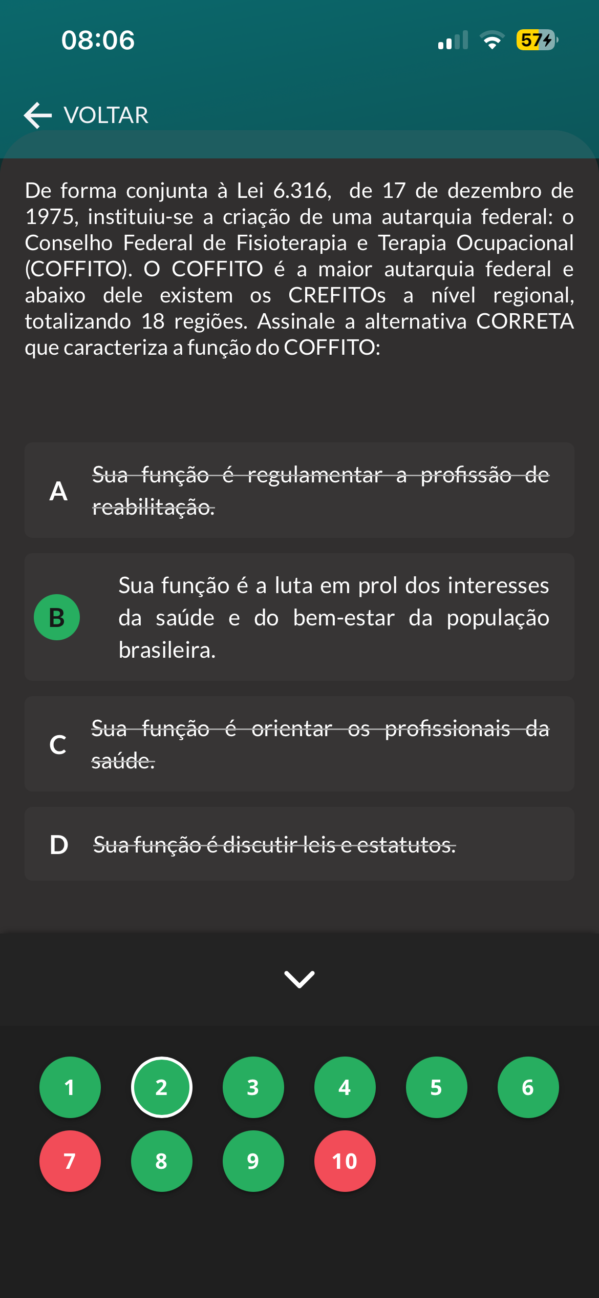 08:06 574 VOLTAR De forma conjunta à Lei 6.316, de 17 de dezembro de 1975, instituiu-se a criação de uma autarquia federal: Conselho Federal de Fisioterapia e Terapia Ocupacional (COFFITO). COFFITO é a maior autarquia federal e abaixo dele existem os CREFITOs a nível regional, totalizando 18 regiões. Assinale a alternativa CORRETA que caracteriza a função do COFFITO: Sua função é regulamentar a profissão de A reabilitação. Sua função é a luta em prol dos interesses B da saúde e do bem-estar da população brasileira. Sua função é orientar profissionais da c saúde. D Sua função é discutir leis e estatutos. 1 2 3 4 5 6 7 8 9 10