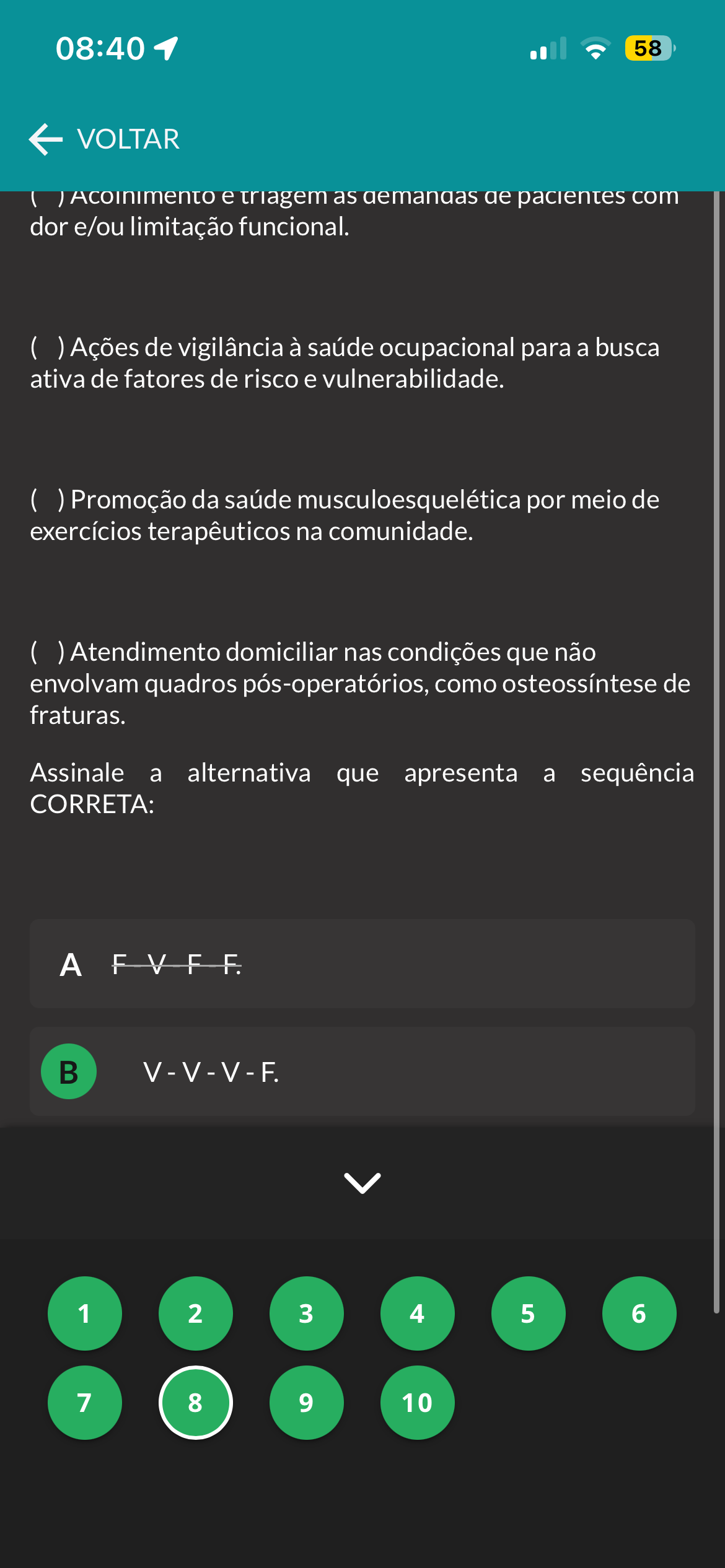08:40 58 VOLTAR Acoinimento e triagem as demandas pacientes com dor e/ou limitação funcional. Ações de vigilância à saúde ocupacional para a busca ativa de fatores de risco e vulnerabilidade. Promoção da saúde musculoesquelética por meio de exercícios terapêuticos na comunidade. Atendimento domiciliar nas condições que não envolvam quadros pós-operatórios, como osteossíntese de fraturas. Assinale a alternativa que apresenta a sequência CORRETA: A B V-V-V-F. 1 2 3 4 5 6 7 8 9 10