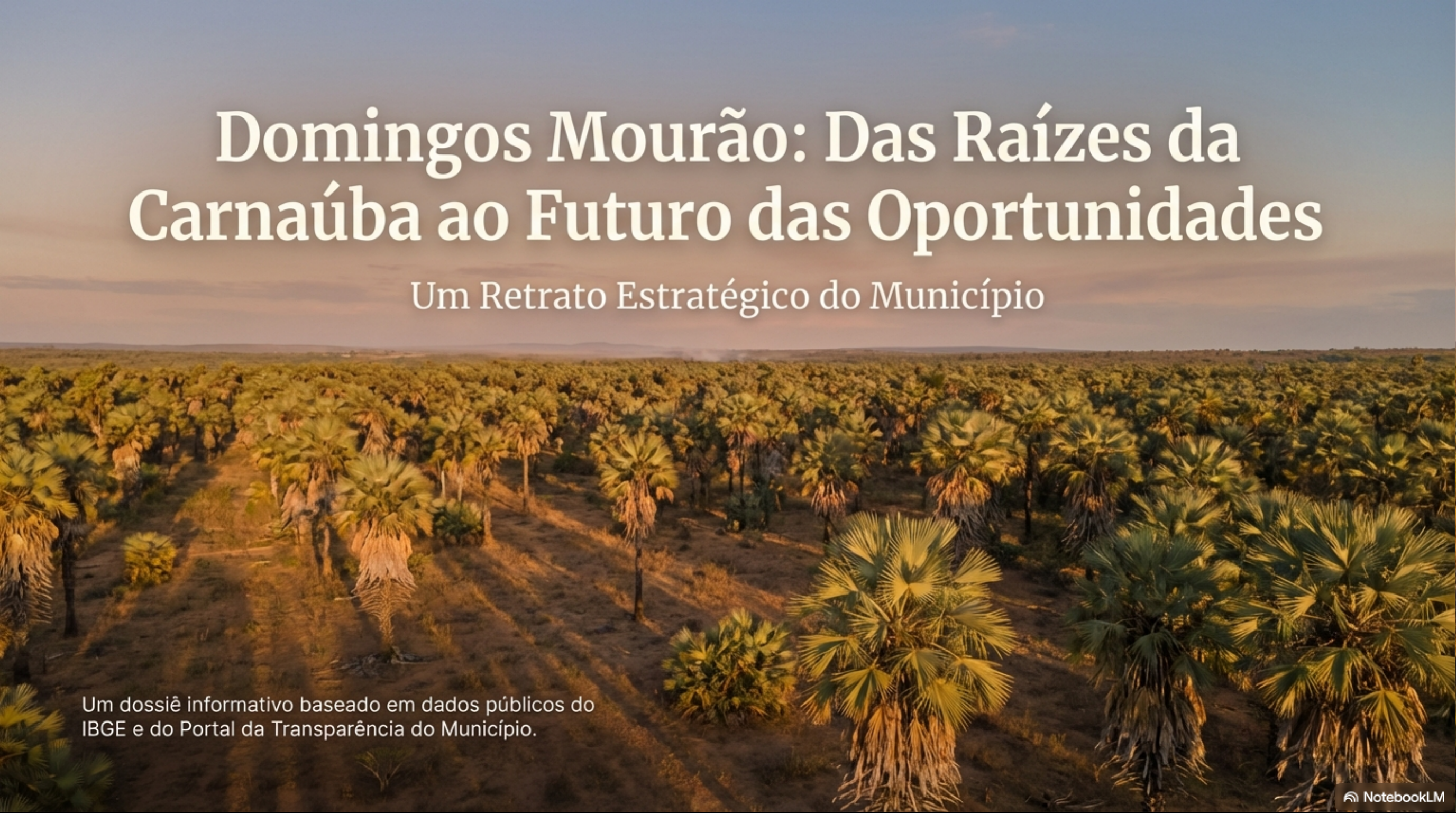 Domingos Mourão: Das Raízes da Carnaúba ao Futuro das Oportunidades Um Retrato Estratégico do Município Um dossiê informativo baseado em dados públicos do IBGE e do Portal da Transparência do Município. NotebookLMConhecendo Domingos Mourão: Uma Jornada pelo Coração do Piauí Localização Esta apresentação traça a trajetória de Latitude 04°15'14" S, Domingos Mourão, um município piauiense cuja Longitude 41°16'13" história e dados revelam uma identidade única. Domingos Partindo de suas origens como Olho d'Água Mourão Grande, exploramos seu presente através de um retrato demográfico, social e administrativo, Altitude Área Territorial culminando em uma análise de suas 150 metros 848,705 km² potencialidades econômicas. É a história de uma comunidade em evolução, ancorada em sua terra e cultura. NotebookLMPARTE I: PASSADO As Raízes de uma Identidade: Terra, Povo e HistóriaDe Olho d'Água Grande a 1930 Início do povoado com a Domingos Mourão: construção da capela de Nossa Senhora do Carmo. Formação de um Município Povoadores pioneiros: Antônio Benício Filho, Urias Raimundo de Oliveira, entre outros. povoado nasceu em 1930, impulsionado pela 1962 fé e pelo pioneirismo de Antônio Benício Filho. Elevado à categoria de município A jornada de simples capela a município em 5 de dezembro, com nome emancipado reflete a resiliência e o de Olho Grande, desmembrado de Pedro II. crescimento da comunidade. 1973 Gentílico Pela lei estadual n° 3188, de 8 de junho, município passa a se domingos-mouronense denominar oficialmente Domingos Mourão. NotebookLMTerra que Sustenta: Biodiversidade e Recursos Naturais A base da identidade e da economia de Domingos Mourão reside em sua rica biodiversidade. A vegetação predominante é a caatinga, com "Várias são as possibilidades manchas de Cerrado, sustentada por uma diversidade de solos que vão ecológicas encontradas dentro de areias quartzosas a latossolos e massapê, garantindo a nutrição dos limites do município." para as mais variadas culturas. Areias Quartzosas Latossolos Massapê NotebookLMPARTE II: PRESENTE Retrato Fiel de uma Comunidade: Pessoas, Governança e CulturaUm Raio-X de Domingos Mourão: TAXA DE ESCOLARIZAÇÃO Demografia e Capital (6 A 14 ANOS) Humano 99,64% Uma base educacional sólida, com escolarização quase universal no ensino fundamental, posiciona 4.075 4,80 0,550 município para 0 desenvolvimento futuro. População (2022) Densidade Demográfica IDHM (2010) (2022) Fonte: Instituto Brasileiro de Geografia e Estatística (IBGE), Censo 2010 e 2022. NotebookLMA Realidade Fiscal e Econômica em Números PIB per capita (2023) Receitas Realizadas Despesas Empenhadas (2024) (2024) R$ 13.728,32 R$ 39,7 milhões milhões Análise Estratégica: Dependência de Fontes Externas perfil de receitas, com 99% de origem em fontes externas (dado de 99% 2015), evidencia a importância das transferências governamentais e reforça a necessidade de fomentar as potencialidades econômicas locais para diversificar a base de arrecadação. Fontes: IBGE / Siconfi (2024), Portal da Transparência (2015). NotebookLMGovernança Aberta: Compromisso com a Transparência A gestão de Domingos Mourão se estrutura sobre a Lei de Acesso à Informação, oferecendo aos cidadãos uma plataforma completa para fiscalização e consulta. Portal da Transparência organiza as informações de forma clara e acessível. GESTÃO FISCAL RECURSOS HUMANOS ACESSO À INFORMAÇÃO Servidores Estrutura $ Receitas Ativos/Inativos Organizacional $ Despesas Remunerações i SIC Relatórios RREO/RGF Diárias Legislação Local $ Licitações NotebookLMA Vida que Pulsa: Cultura e Comunidade em Celebração Mais do que números, Domingos Mourão é uma comunidade vibrante. A celebração do 62° aniversário de emancipação política é um exemplo vivo da sinergia entre poder público e a população. Destaques da Programação do Aniversário (2024) Valorização da História: Homenagem ao fundador Antônio Benício Filho. Fomento à Economia Local: Feira da S Agricultura Familiar e Exposição de Artesanato. Cultura e Educação: Mostra Educacional e Exposição de Arte e Cultura Local. Civismo e Fé: Santa Missa em ação de graças e Momento Cívico na Prefeitura. NotebookLMPARTE III: FUTURO Sementes de Oportunidade: As Vocações Econômicas do MunicípioVocação da Terra: Extrativismo Sustentável e Pecuária A carnaúba é a espinha dorsal econômica e cultural. Seu extrativismo não é apenas uma herança histórica, mas uma atividade de grande importância no presente, gerando emprego e renda significativa durante a estiagem, quando a agricultura se torna impraticável. Pontos Chave Carnaúba: Fonte de renda estratégica no período do verão. Pecuária: Bovinocultura e Caprinocultura como atividades fortes e complementares. Sustentabilidade: A atividade extrativista aproveita a biodiversidade local de forma resiliente. NotebookLMMãos que Criam Valor: Artesanato como Motor de Renda e Turismo talento dos artesãos de Domingos Mourão se traduz em peças de qualidade impressionante. Este trabalho, inteiramente manual, é uma forma poderosa de fomentar potencial turístico, permitindo que visitante leve um pedaço autêntico do município. adquirir um artesanato local, visitante tem a possibilidade de levar um pedacinho do município e ainda gerar emprego e renda a diversas famílias." NotebookLMDomingos Mourão: Identidade Sólida, Futuro Promissor UM PASSADO de raízes UM PRESENTE de comunidade UM FUTURO de oportunidades profundas, que alicerça uma vibrante, com capital humano sustentáveis, ancorado na identidade cultural e uma qualificado (99,6% de vocação para extrativismo da relação íntima com a terra. escolarização) e uma gestão carnaúba, na pecuária e na comprometida com a riqueza do artesanato local. transparência. A trajetória de Domingos Mourão demonstra que é possível construir um futuro prósper