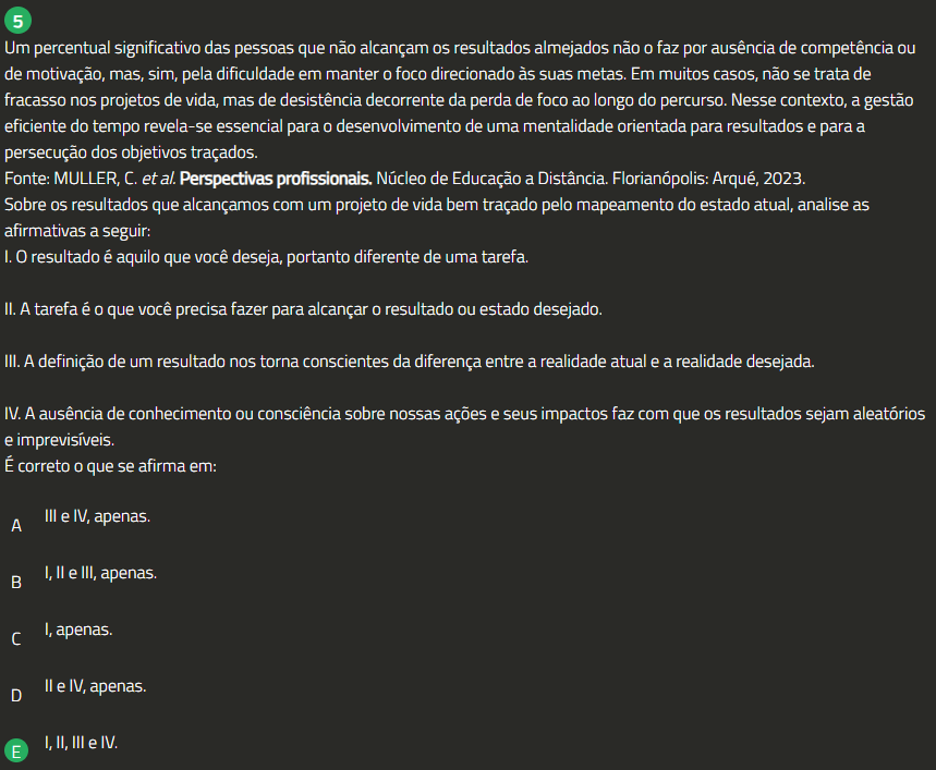5 Um percentual significativo das pessoas que não alcançam resultados almejados não 0 faz por ausência de competência ou de motivação, mas, sim, pela dificuldade em manter 0 foco direcionado às suas metas. Em muitos casos, não se trata de fracasso nos projetos de vida, mas de desistência decorrente da perda de foco ao longo do percurso. Nesse contexto, a gestão eficiente do tempo revela-se essencial para 0 desenvolvimento de uma mentalidade orientada para resultados e para a persecução dos objetivos traçados. Fonte: MULLER, C. et al. Perspectivas profissionais. Núcleo de Educação a Distância. Florianópolis: Arqué, 2023. Sobre OS resultados que alcançamos com um projeto de vida bem traçado pelo mapeamento do estado atual, analise as afirmativas a seguir: 0 resultado é aquilo que você deseja, portanto diferente de uma tarefa. II. A tarefa é 0 que você precisa fazer para alcançar 0 resultado ou estado desejado. III. A definição de um resultado nos torna conscientes da diferença entre a realidade atual e a realidade desejada. IV. A ausência de conhecimento ou consciência sobre nossas ações e seus impactos faz com que resultados sejam aleatórios e imprevisíveis. É correto 0 que se afirma em: A III e IV, apenas. B I, e III, apenas. C I, apenas. D II e IV, apenas. I, II, III e IV. E