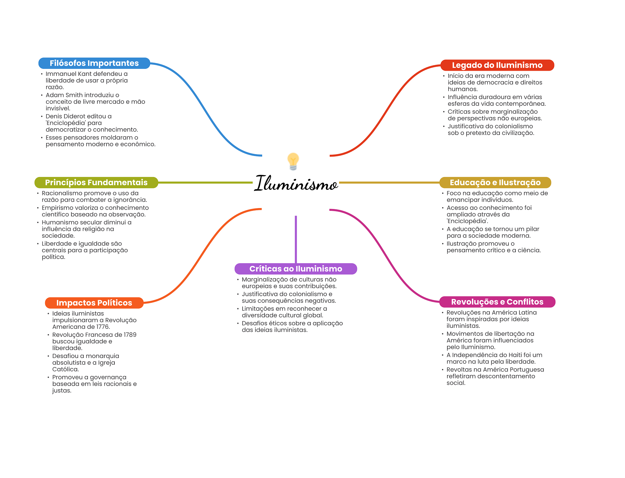 Filósofos Importantes Legado do Immanuel Kant defendeu a Início da era moderna com liberdade de usar a própria ideias de democracia e direitos razão. humanos. Adam Smith introduziu Influência duradoura em várias conceito de livre mercado e mão esferas da vida contemporânea. invisível. Críticas sobre marginalização Denis Diderot editou a de perspectivas não europeias. 'Enciclopédia' para Justificativa do colonialismo democratizar conhecimento. sob O pretexto da civilização. Esses pensadores moldaram pensamento moderno e econômico. Princípios Fundamentais Iluminismo Educação e Racionalismo promove uso da Foco na educação como meio de razão para combater a ignorância. emancipar indivíduos. Empirismo valoriza O conhecimento Acesso ao conhecimento foi científico baseado na observação. ampliado através da Humanismo secular diminui a influência da religião na A educação se tornou um pilar sociedade. para a sociedade moderna. Liberdade e igualdade são promoveu O centrais para a participação pensamento crítico e a ciência. política. Críticas ao Marginalização de culturas não europeias e suas contribuições. Justificativa do colonialismo e Impactos Políticos suas consequências negativas. Revoluções e Conflitos Limitações em reconhecer a Ideias iluministas diversidade cultural global. Revoluções na América Latina impulsionaram a Revolução foram inspiradas por ideias Americana de 1776. Desafios éticos sobre a aplicação iluministas. das ideias iluministas. Revolução Francesa de 1789 Movimentos de libertação na buscou igualdade e América foram influenciados liberdade. pelo Desafiou a monarquia A Independência do Haiti foi um absolutista e a Igreja marco na luta pela liberdade. Católica. Revoltas na América Portuguesa Promoveu a governança refletiram descontentamento baseada em leis racionais e social. justas.