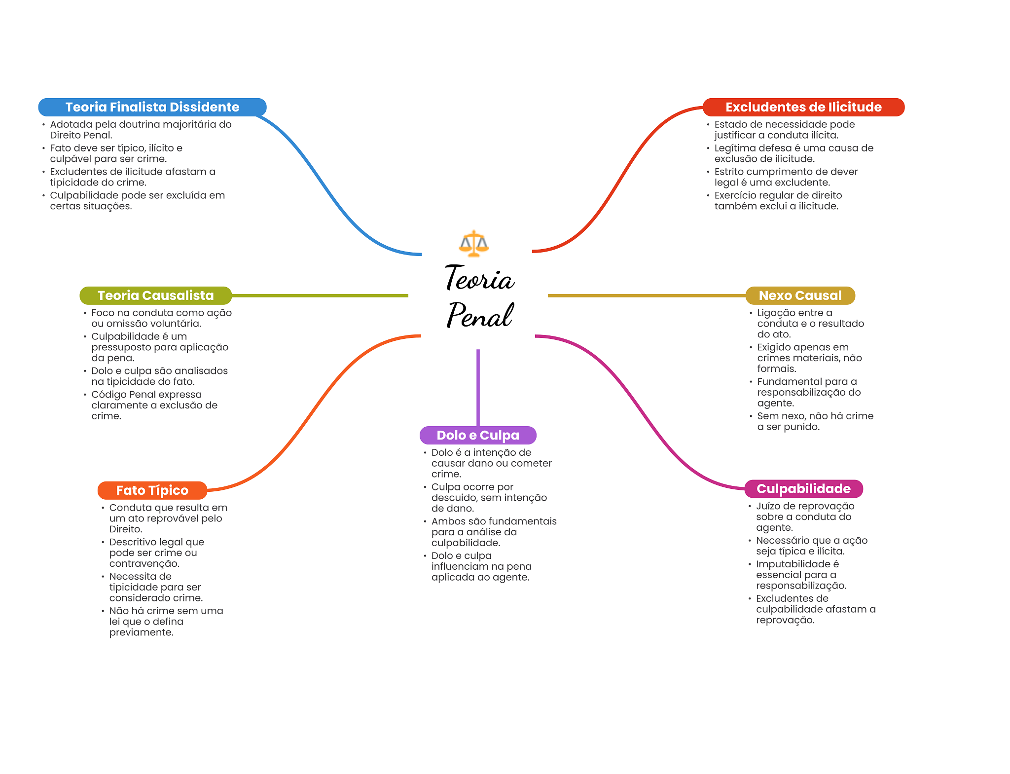 Teoria Finalista Dissidente Excludentes de Ilicitude Adotada pela doutrina majoritária do Estado de necessidade pode Direito Penal. justificar a conduta ilícita. Fato deve ser típico, ilícito e Legítima defesa é uma causa de culpável para ser crime. exclusão de ilicitude. Excludentes de ilicitude afastam a Estrito cumprimento de dever tipicidade do crime. legal é uma excludente. Culpabilidade pode ser excluída em Exercício regular de direito certas situações. também exclui a ilicitude. Teoria Teoria Causalista Nexo Causal Foco na conduta como ação Penal Ligação entre a ou omissão voluntária. conduta e O resultado Culpabilidade é um do ato. pressuposto para aplicação Exigido apenas em da pena. crimes materiais, não Dolo e culpa são analisados formais. na tipicidade do fato. Fundamental para a Código Penal expressa responsabilização do claramente a exclusão de agente. crime. Sem nexo, não há crime a ser punido. Dolo e Culpa Dolo é a intenção de causar dano ou cometer crime. Fato Típico Culpa ocorre por Culpabilidade descuido, sem intenção Conduta que resulta em de dano. Juízo de reprovação um ato reprovável pelo Ambos são fundamentais sobre a conduta do Direito. para a análise da agente. Descritivo legal que culpabilidade. Necessário que a ação pode ser crime ou Dolo e culpa seja típica e ilícita. contravenção. influenciam na pena Imputabilidade é Necessita de aplicada ao agente. essencial para a tipicidade para ser responsabilização. considerado crime. Excludentes de Não há crime sem uma culpabilidade afastam a lei que defina reprovação. previamente.