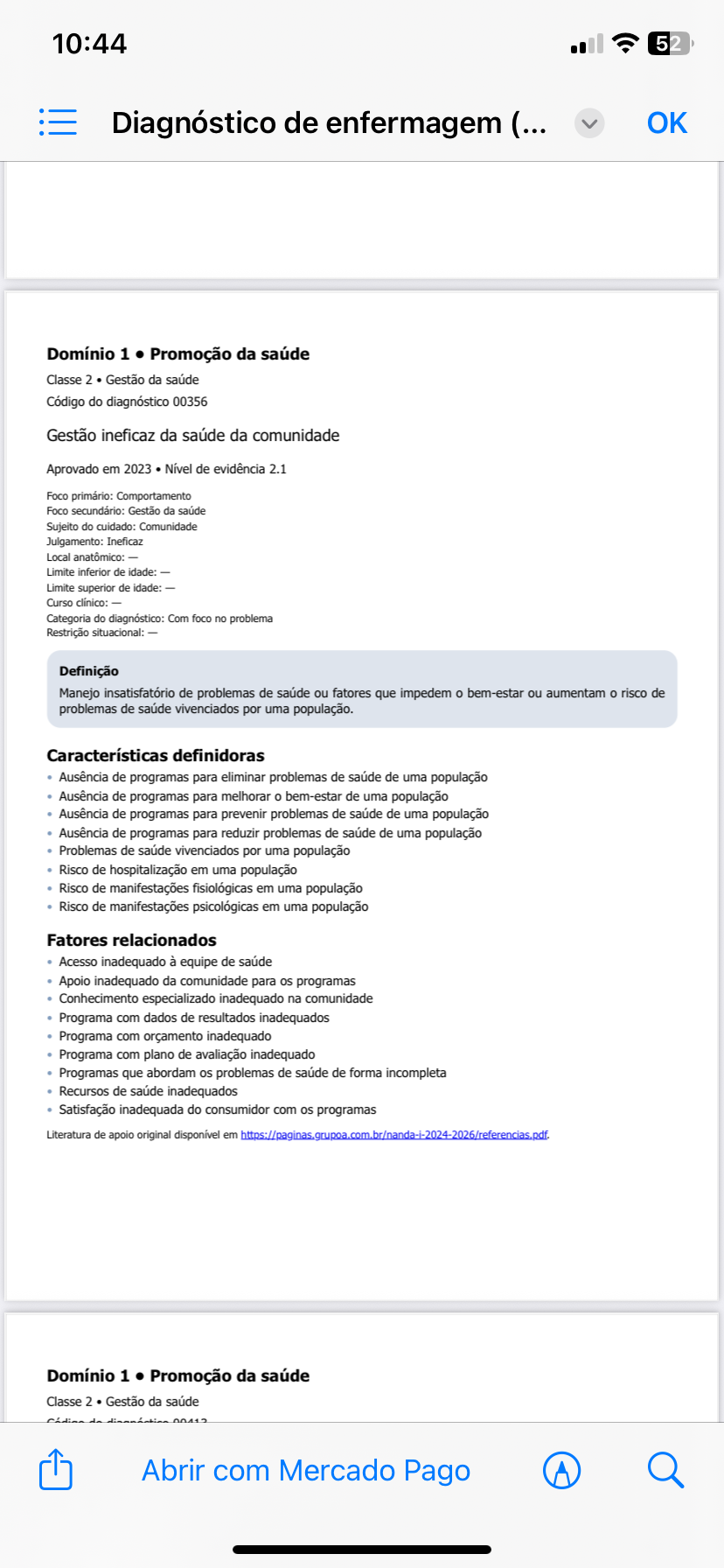 10:44 52 Diagnóstico de enfermagem (... OK Domínio 1 Promoção da saúde Classe 2 Gestão da saúde Código do diagnóstico 00356 Gestão ineficaz da saúde da comunidade Aprovado em 2023 de evidência 2.1 Foco primário: Comportamento Foco secundário: Gestão da saúde Sujeito do cuidado: Comunidade Julgamento: Ineficaz Local anatômico: Limite inferior de idade: Limite superior de idade: Curso clínico: Categoria do diagnóstico: Com foco no problema Restrição situacional: Definição Manejo insatisfatório de problemas de saúde ou fatores que impedem bem-estar ou aumentam risco de problemas de saúde vivenciados por uma população. Características definidoras Ausência de programas para eliminar problemas de saúde de uma população Ausência de programas para melhorar bem-estar de uma população Ausência de programas para prevenir problemas de saúde de uma população Ausência de programas para reduzir problemas de saúde de uma população Problemas de saúde vivenciados por uma população Risco de hospitalização em uma população Risco de manifestações fisiológicas em uma população Risco de manifestações psicológicas em uma população Fatores relacionados Acesso inadequado à equipe de saúde Apoio inadequado da comunidade para programas Conhecimento especializado inadequado na comunidade Programa com dados de resultados inadequados Programa com orçamento inadequado Programa com plano de avaliação inadequado Programas que abordam os problemas de saúde de forma incompleta Recursos de saúde inadequados Satisfação inadequada do consumidor com os programas Literatura de apoio original disponível em Domínio 1 Promoção da saúde Classe 2 Gestão da saúde Abrir com Mercado Pago