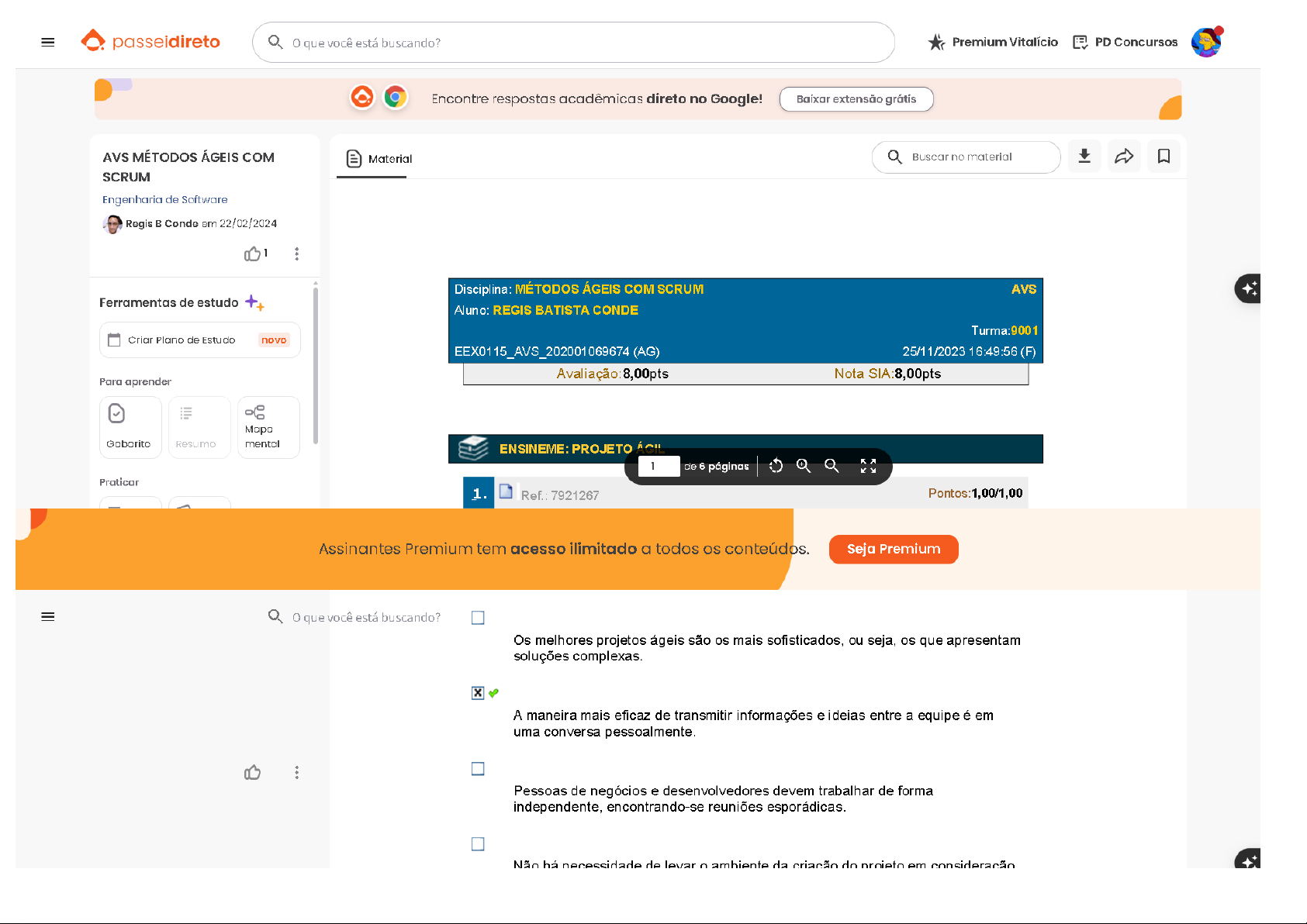 passeidireto 0 que você está buscando? Premium Vitalício PD Concursos Encontre respostas acadêmicas direto no Google! Baixar extensão grátis AVS MÉTODOS ÁGEIS COM Material Buscar no material SCRUM Engenharia de Software Regis B Conde em 22/02/2024 1 Disciplina: MÉTODOS ÁGEIS COM SCRUM AVS Ferramentas de estudo Aluno: REGIS BATISTA CONDE Turma:9001 Criar Plano de Estudo novo (AG) 25/11/2023 16:49:56 (F) Avaliação:8,00pts Nota SIA:8,00pts Para aprender Mapa Gabarito Resumo mental ENSINEME: PROJETO 1 de 6 páginas Praticar 1. Ref.: 7921267 Pontos: 1,00/1,00 Assinantes Premium tem acesso ilimitado a todos conteúdos. Seja Premium que você está buscando? Os melhores projetos ágeis são OS mais sofisticados, ou seja, que apresentam soluções complexas. A maneira mais eficaz de transmitir informações e ideias entre a equipe é em uma conversa pessoalmente. Pessoas de negócios e desenvolvedores devem trabalhar de forma independente, encontrando-se reuniões esporádicas. Não há necessidade de levar o ambiente da criação do em consideraçãoProcessos Ágeis consomem muitas horas de trabalho dos desenvolvedores. 2. Ref.: 3990977 Pontos:1,00/1,00 Ao adicionarmos um membro em um time de desenvolvimento de 7 pessoas teremos quantos canais de comunicação. X 28 56 15 16 3002719 PRATICAS GERENCIAIS COMSCRUM 3. Ref.: 6043236 Pontos: 1,00/1,00 A duração máxima da reunião de sprint planning é: Oito horas para um sprint mensal. Para sprints mais curtos, geralmente é mais curto. Uma semana. Quatro horas. O tempo que for necessário para detalhar O que será feito na sprint. Um dia ou mais. 4. Ref.: 6043296 Pontos: 1,00/1,00 Qual papel do Scrum team é O mais importante para iniciar a implementação do Scrum? X Scrum master. Product owner.Sprint manager. Sprint owner. Developers. 5. Ref.: 6043292 Pontos:1,00/1,00 Quando começa a próxima Sprint? Imediatamente após próximo sprint planning. Na próxima sexta-feira. Quando product owner estiver pronto. Imediatamente após a conclusão da Sprint anterior. Na próxima segunda-feira. 03600 - MÉTODOS ÁGEIS ESPECÍFICOS 6. Ref.: 6115256 Pontos:0,00/1,00Por que é importante mantermos muitas opções na tomada de decisões e então cnegarmos a um consenso ! Não incorrermos para um curso incorreto. Para que todos participem. É indiferente termos mais ou menos opções na tomada de decisão. Poucas opções devem ser consideradas, escolhemos uma e a implementamos. Termos mais opções se falharmos. 7. Ref.: 6115461 Pontos: 1,00/1,00 Manter uma equipe coesa, integrada e buscando sempre a melhoria contínua, não é uma tarefa trivial. No contexto de métodos ágeis, que é Programação em Pares? É um processo em que 1 desenvolvedor faz código e outro OS testes.uma de remicar erros em programas, procurando pares de erros. Um método de desenvolvimento, no qual dois desenvolvedores trabalham juntos na solução, quando possível, na mesma estação de trabalho. É um processo de programação, no qual um programador escreve programa duas vezes só por precaução. É um algoritmo que encontra números de pares em um conjunto de números inteiros. 03601 FRAMEWORKS PARA MÉTODOS ÁCEIS NO 8. Ref.: 6116045 Pontos: 1,00/1,00 Qual das afirmações possuem somente considerações do princípio de Tailoring? Cada projeto é único, e sucesso do projeto baseia-se na adaptação ao contexto único do projeto para determinar métodos mais adequados, produzindo OS resultados desejados. Bons resultados obtidos no curto facilitam - do Tailoringno a A melhor estratégia para O Tailoring é a implantação por fases. Tailoring deve ser customizado somente nas exceções. Necessário patrocínio da alta direção. 9. Ref.: 6116123 Pontos: 1,00/1,00 O PMBOK (Project Management Body Of Knowledge) está atualmente em sétima versão, sendo um guia das melhores práticas do gerenciamento de projetos. Acerca de suas características, quantos princípios tem Guia PMBOK? 49 8 13 10 12 10. Ref.: 6116043 Pontos 0,00/1,00 Uma qualidade relevante em qualquer meio social é a adaptabilidade. Ser capaz de monitorar as partes interessadas, adaptando as estratégias conforme O projeto vai evoluindo é fundamental para reduzir as suas resistências, aumentando seu apoio ao projeto. Nesse sentido, qual é tipo de linguagem que mais ajuda na compreensão doGráfica. Verbal ou Oral. Não verbal. Escrita. Fala.Mais conteúdos dessa disciplina MÉTODOS ÁGEIS COM SCRUM MÉTODOS ÁGEIS drive-download-20230601T101159Z-001 Gerenciamento De Projetos De Software (54) Metodologias- - Ebook - Graduação Mostrar mais conteúdos passeidireto Premium Institucional Disponível na Seja Premium Sobre a Passei Direto Google PlayTrabalhe conosco Ecossistema UOL EdTech Disponível na Política de privacidade Qulture.Rocks App Store Termos de uso Central de ajuda f in RA1000 ReclameAQUI © 2026 Passei Direto