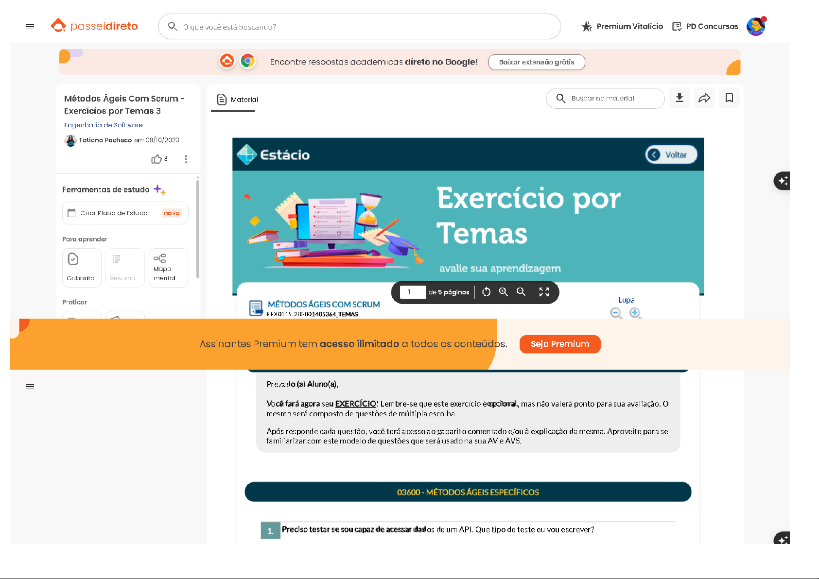 passeidireto 0 que você está buscando? Premium Vitalício PD Concursos Encontre respostas acadêmicas direto no Google! Baixar extensão grátis Métodos Ágeis Com Scrum Material Buscar no material Exercícios por Temas 3 Engenharia de Software Tatiana Pacheco em 08/10/2023 3 : Estácio Voltar Ferramentas de estudo Exercício por Criar Plano de Estudo novo Para aprender Temas Mapa avalie sua aprendizagem Gabarito Resumo mental 1 de 5 páginas Praticar MÉTODOS ÁGEIS COM SCRUM Lupa EEX0115_202001405364_TEMAS + Assinantes Premium tem acesso ilimitado a todos conteúdos. Seja Premium Prezado (a) Aluno(a), Você fará agora seu EXERCÍCIO! Lembre-se que este exercício mas não valerá ponto para sua avaliação. O mesmo será composto de questões de múltipla escolha. Após responde cada questão, você terá acesso ao gabarito comentado e/ou à explicação da mesma. Aproveite para se familiarizar com este modelo de questões que será usado na sua AV e AVS. 03600 MÉTODOS ÁGEIS ESPECÍFICOS 1. Preciso testar se sou capaz de acessar dados de um API. Que tipo de teste eu escrever?Teste unitário. Teste funcional. Teste de integração. Teste "Mocked". Teste de regressão. Data Resp: 15/09/2023 18:03:37 Explicação: Gabarito: Teste de integração. Justificativa: Teste unitário é realizado para agranul aridade mínima de um pedaço de código desenvolvido. Teste "Mocked" é utilizado quando queremos validar interface ou ainda fluxo de telas, utilizando dados fixos. Teste de integração permite a validação da comunicação entre 2 componentes de software, por exemplo, a chamada de uma API. Teste funcional, permite que seja validade especificada está funcionando de forma correta. Teste de Regressão é utilizado quando inserimos um novo código e queremos validar se nenhuma outra parte da solução foi impactada. 2. XP é mais específico dos frameworks ágeis de desenvolvimento de software. Apresenta como ideia precípua produzir software de elevada qualidade, ao mesmo tempo em que promove qualidade de vida para a equipe de desenvolvimento. Nesse sentido, Diversidade, Melhoria e Responsabilidade Aceita são alguns dos definidos na XP. Valores Conceitos Atributos da Equipe Princípios Práticas Data Resp: 15/09/2023 18:04:41 Explicação: Gabarito: Valores Justificativa: Valores norteiam as práticas, princípios e papéis nos times XP, onde toda a tomada de decisão deve revisitá-los para saber se tem relação direta com algum deles, como por exemplo diversidade, melhoria e responsabilidade aceita.3. Acerca dos métodos ágeis, assinale a opção que completa corretamente a lacuna da sentença abaixo. é organizado por colunas que representam um fluxo trabalho pelo qual passam itens ou tarefas desenvolvidas. É visual e as atividades ficarão explícitas à todos OS membros de um time. Quadro kanban Kanban Método Kanban Customer Kanban Kaizen Data Resp: 08/09/2023 16:48:05 Explicação: Gabarito: Quadro kanban Justificativa: 0 método Kanban tem como base tornar trabalho visível, para impulsionar a melhoria contínua e entrega de valor. 0 que torna 0 trabalho visível é 0 uso do quadro kanban, seja no formato virtual ou físico. customer kanban, ou fluxo end to end, torna visível todo 0 trabalho desde a concepção de uma ideia até que seja desenvolvida e entregue ao cliente, também através de um quadro kanban. Kaizen refere-se à filosofia ou às práticas que incidem sobre a melhoria contínua, sejam elas grandes ou pequenas. 4. (FUNDATEC / 2022 adaptada) O processo de desenvolvimento de software especificado pela Programação Extrema (eXtreme Programming XP) começa com uma fase de planejamento, na qual são levantados e descritos requisitos para software na forma de projeto e desenvolvimento dos requisitos busca focar nas necessidades imediatas. Necessidades de melhoria no projeto são realizadas através de processos de Além disso, se recomenda que a atividade de codificação ocorra em e seja guiada por Assinale a alternativa que preenche, correta e respectivamente, as lacunas do trecho acima. do refatoração histórias de usuários refatoração pares testes modelos de domínio testes quartetos casos de uso histórias de usuários testes pares casos de uso modelos de domínio refatoração pares testes Data 15/09/2023 18:06:06 Explicação: Gabarito: histórias de usuários refatoração pares testesO processo de desenvolvimento de software especificado pela Programação Extrema eXtreme Programming XP) começa com uma fase de planejamento, na qual são levantados e descritos requisitos para software na forma de histórias de usuários. O projeto e desenvolvimento dos requisitos busca focar nas necessidades imediatas. Necessidades de melhoria no projeto são realizadas através de processos de refatoração. Além disso, se recomenda que a atividade de codificação ocorra em pares e seja guiada por testes. Independentemente da área de atuação profissional, qualidade e capricho são características valorizadas no fluxo de trabalho. Com esses aspectos em mente, quando devemos levar em conta a qualidade? Em cada ciclo, desde a primeira etapa. Na entrega do produto. Nas fases de testes. Na etapa de concepção. Nos pontos de garantia de qualidade. Data Resp: 08/09/2023 16:48:40 Explicação: Gabarito: Em cada ciclo, desde a primeira etapa. Justificativa: Qualidade deve ser responsabilidade de todos OS envolvidos no desenvolvimento de um produto, sendo parte de todas as etapas do ciclo, desde a concepção a entrega. 6. Kanban e eXtreaming Programing são métodos precursores na história da agilidade. Em uma análise exploratória inicial, podemos dizer que entregar valor mais cedo é: sobrecarregar a linha de produção. pular etapas. colocar mais pessoas no time. nunca deixar OS recursos inativos. evitar grandes lotes para entregar de forma mais contínua. Data 08/09/2023 16:49:02 Explicação: Gabarito: evitar grandes lotes para entregar de forma mais cont