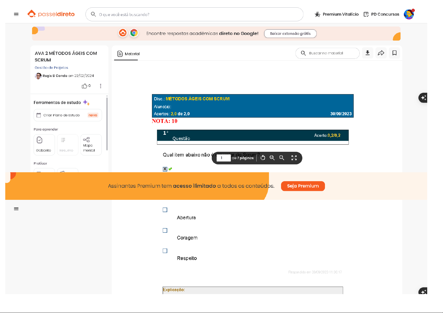 passeidireto 0 que você está buscando? Premium Vitalício PD Concursos Encontre respostas acadêmicas direto no Google! Baixar extensão grátis AVA 2 MÉTODOS ÁGEIS COM Material Buscar no material SCRUM Gestão de Projetos Regis B Conde em 22/02/2024 0 : Disc.: MÉTODOS ÁGEIS COM SCRUM Ferramentas de estudo Aluno(a): Criar Plano de Estudo novo Acertos: 2,0 de 2,0 30/09/2023 NOTA: 10 Para aprender Acerto:0,2/0,2 Questão Mapa Gabarito Resumo mental Qual item abaixo não é do Scrum? 1 de 7 páginas Praticar X Assinantes Premium tem acesso ilimitado a todos conteúdos. Seja Premium Abertura Coragem Respeito Respondido em 30/09/2023 11:06:17 Explicação:A resposta correta é: Adaptação Acerto:0,2/0,2 Questão O principal objetivo da sprint retrospective é: Fazer uma retrospectiva da sprint. Gerar um documento de lições aprendidas. Celebrar as conquistas da sprint. X Identificar as oportunidades de melhoria de desempenho e qualidade. Aumentar as interações entre Scrum Team. Respondido em 30/09/2023 11:06:46 Explicação: A sprint retrospective tem como objetivo identificar oportunidades de melhoria de desempenho e qualidade. Uma retrospectiva da sprint, que é um relato dos acontecimentos ao longo de sua duração, faz parte do evento, mas não é o seu objetivo. Não existe um documento de liçõesaprendidas no Scrum; apesar de a sprint retrospective ser similar a uma reunião de lições aprendidas, esse não é um artefato do Scrum. Mesmo ocorrendo celebrações e interações entre o Scrum team, esse não é o objetivo principal da sprint retrospective. Acerto:0,2/0,2 Questão Kanban e eXtreaming Programing são métodos precursores na história da agilidade. Em uma análise exploratória inicial, podemos dizer que entregar valor mais cedo é: pular etapas. sobrecarregar a linha de produção. colocar mais pessoas no time. nunca deixar OS recursos inativos. evitar grandes lotes para entregar de forma mais contínua. Respondido em 30/09/2023 11:09:15 Explicação: Gabarito: evitar grandes lotes para entregar de forma mais contínua. Justificativa: Entregar valor mais cedo é gerenciar o fluxo de maneira que tenha um ritmo sustentável de entregas contínuas de pequenos pacotes e com qualidade.Acerto 0,2/0,2 Qual é a melhor descrição da definição de pronto (DoD) segundo Guia PMBOK? Aquilo que deve ser feito. Checklist do que precisa ser feito. Uma lista de verificação de todos OS critérios que devem ser atendidos para que uma entrega possa ser considerada pronta para uso do cliente. Inspeção do que precisa ser feito. Critérios de aceitação. Respondido em 30/09/2023 11:10:33 Explicação: Definição de pronto (DoD). Uma lista de verificação de todos os critérios que devem ser atendidos para que uma entrega possa ser considerada pronta para uso do cliente. Acerto:0,2/0,2 Questão Selecione item abaixo que representa uma prática de melhoria contínua do código minimizando problemas como por exemplo duplicidade de código.Ritmo sustentavel Metáforas X Refatoração Pequenas entregas Jogo de Planejamento Respondido em 30/09/2023 11:11:07 Explicação: A resposta correta é: Refatoração Acerto:0,2/0,2 Questão Os três pilares do Scrum são:demonstração e retrospectiva. Inspeção, transparência e adaptação. Planejamento, inspeção e adaptação. Transparência, eliminação de desperdícios e Kaizen. Respeito pelas pessoas, Kaizen e eliminação de resíduos. Respondido em 30/09/2023 11:14:24 Explicação: O Scrum tem como base três pilares: transparência, inspeção e adaptação. As demais opções apresentam itens que não são pilares dele. Acerto:0,2/0,2 Questão Acerca dos métodos ágeis, assinale a opção que completa corretamente a lacuna da sentença abaixo. é organizado por colunas que representam um fluxo trabalho pelo qual passam itens ou tarefas desenvolvidas. É visual e as atividades ficarãoexplícitas à todos OS membros de um time. Quadro kanban Método Kanban Kaizen Kanban Customer Kanban Respondido em 30/09/2023 11:16:08 Explicação: Gabarito: Quadro kanban Justificativa: O método Kanban tem como base tornar o trabalho visível, para impulsionar a melhoria contínua e entrega de valor. O que torna trabalho visível é o uso do quadro kanban, seja no formato virtual ou físico. O customer kanban, ou fluxo end to end, torna visível todo o trabalho desde a concepção de uma ideia até que seja desenvolvida e entregue ao cliente, também através de um quadro kanban. Kaizen refere-se à filosofia ou às práticas que incidem sobre a melhoria contínua, sejam elas grandes ou pequenas. Questão Qual alternativa contém somente tópicos tratados na seção "um sistema de entrega de valor" do padrão de gerenciamento de projetos do Guia PMBOK? Gerenciamento das partes interessadas, Entrega de Valor. Gerenciamento das entregas, Valor.Governança, funções associadas a projetos, ambiente do projeto e gerenciamento de produto. Ambiente do projeto, gerenciamento das entregas. Governança, Gerenciamento das entregas. Respondido em 30/09/2023 11:22:49 Explicação: Os tópicos da seção 2 Um Sistema de Entrega de Valor são: Criação de valor Sistemas de governança organizacional Funções associadas a projetos O ambiente do projeto Considerações sobre gerenciamento de produto Acerto:0,2/0,2 Questão Selecione item abaixo que representa uma técnica muito utilizada no Extreme Programmig para descrever a necessidade do usuário:Caso de uso X I listória usuário Refatoração Padrão de Código Programação em par Respondido em 30/09/2023 11:25:18 Explicação: A resposta correta é: História de usuário Acerto:0,2/0,2 Questão Qual das alternativas não é uma métrica usada no Kanban? Throughput.Work item age. Earned value. WIP (work in progress). Cycle time. Respondido em 30/09/2023 11:26:22 Explicação: As métricas mais usadas no Kanban são WIP, cycle time, work item age e throughput. O earned value é um valor usado na técn