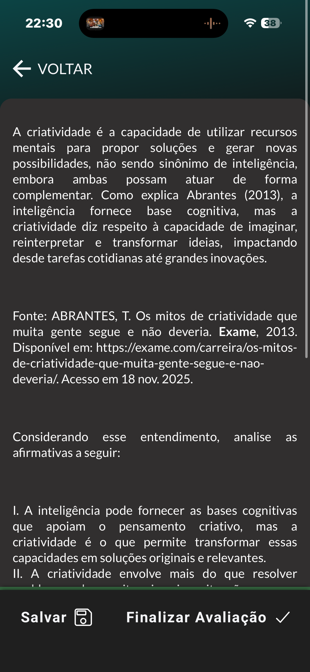22:30 38 VOLTAR A criatividade é a capacidade de utilizar recursos mentais para propor soluções e gerar novas possibilidades, não sendo sinônimo de inteligência, embora ambas possam atuar de forma complementar. Como explica Abrantes (2013), a inteligência fornece base cognitiva, mas a criatividade diz respeito à capacidade de imaginar, reinterpretar e transformar ideias, impactando desde tarefas cotidianas até grandes inovações. Fonte: ABRANTES, T. Os mitos de criatividade que muita gente segue e não deveria. Exame, 2013. Disponível em: deveria/. Acesso em 18 nov. 2025. Considerando esse entendimento, analise as afirmativas a seguir: I. A inteligência pode fornecer as bases cognitivas que apoiam pensamento criativo, mas a criatividade é que permite transformar essas capacidades em soluções originais e relevantes. II. A criatividade envolve mais do que resolver Salvar Finalizar Avaliação