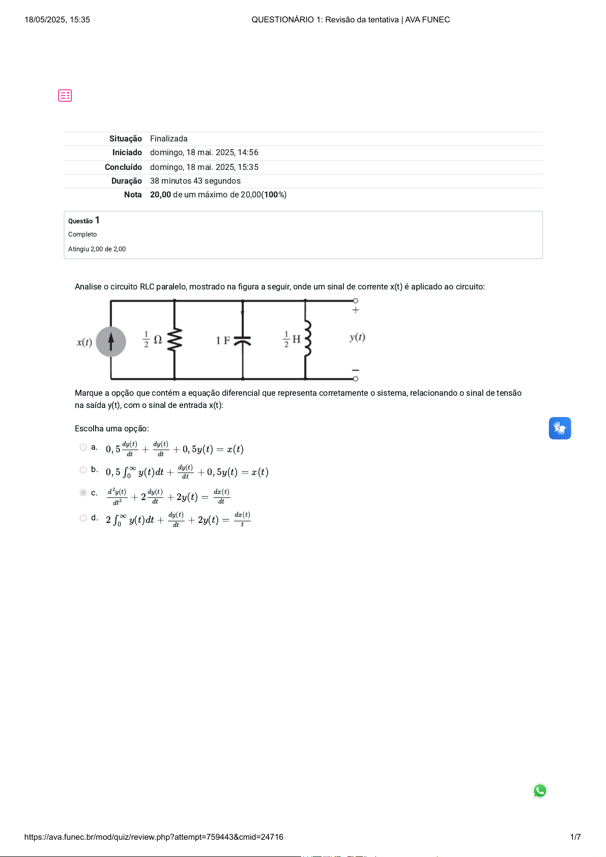 Situação Finalizada Iniciado domingo, 18 mai. 2025, 14:56 Concluído domingo, 18 mai. 2025, 15:35 Duração 38 minutos 43 segundos Nota 20,00 de um máximo de 20,00(100%) Questão 1 Completo Atingiu 2,00 de 2,00 Analise o circuito RLC paralelo, mostrado na figura a seguir, onde um sinal de corrente x(t) é aplicado ao circuito: Marque a opção que contém a equação diferencial que representa corretamente o sistema, relacionando o sinal de tensão na saída y(t), com o sinal de entrada x(t): Escolha uma opção: a. b. c. d. 0, 5 + + 0, 5y(t) = x(t) dy(t) dt dy(t) dt 0, 5 y(t)dt + + 0, 5y(t) = x(t)∫ ∞ 0 dy(t) dt + 2 + 2y(t) = y(t)d2 dt2 dy(t) dt dx(t) dt 2 y(t)dt + + 2y(t) =∫ ∞ 0 dy(t) dt dx(t) t 18/05/2025, 15:35 QUESTIONÁRIO 1: Revisão da tentativa | AVA FUNEC https://ava.funec.br/mod/quiz/review.php?attempt=759443&cmid=24716 1/7 Questão 2 Completo Atingiu 2,00 de 2,00 Questão 3 Completo Atingiu 2,00 de 2,00 A função degrau unitário pode ser utilizada para descrever funções matemáticas em diferentes segmentos de tempo em uma única expressão válida para todo tempo. Dessa forma, o pulso retangular mostrado na figura a seguir pode ser descrito pela função: Escolha uma opção: a. x(t) = tu [u(t) - u (t-2)] b. x(t) = u (t + 2) + (t - 4) u (t - 2) c. x(t) = u (t-2) - u (t-4) d. x(t) = (t+2) u (t - 4) - u (t + 4) Assinale a alternativa CORRETA sobre sinais e sistemas: Escolha uma opção: a. Um sinal é o conjunto de dados ou informações que representam o comportamento de algum fenômeno. b. Um sistema é o conjunto de elementos que são capazes de gerar um sinal. As tensões e correntes em um circuito elétrico, são exemplos de sistema. c. Um sistema é sempre representado por uma função cuja variável independente é o tempo. d. Um circuito elétrico e um pêndulo, são exemplos práticos de sinais. 18/05/2025, 15:35 QUESTIONÁRIO 1: Revisão da tentativa | AVA FUNEC https://ava.funec.br/mod/quiz/review.php?attempt=759443&cmid=24716 2/7 Questão 4 Completo Atingiu 2,00 de 2,00 Questão 5 Completo Atingiu 2,00 de 2,00 Considere as afirmativas a seguir sobre a classificação de sinais: I. Sinais contínuos são aqueles cujo valor é constante em qualquer intervalo de tempo, enquanto os sinais discretos podem assumir valores diferentes em intervalos de tempo discretos. II. Um sinal digital é um sinal discreto e binário, que só pode assumir valores 0 ou 1. Já os sinais analógicos são sinais de tempo contínuo. III. Os sinais discretos podem ser, por exemplo, a representação das vendas mensais de uma corporação. Os sinais discretos também incluem os sinais extraídos de sucessivas amostras de sinais contínuos. IV. Um sinal analógico é aquele cuja amplitude pode assumir infinitos valores. Um sinal digital é aquele cuja amplitude pode apenas assumir apenas um número finito de valores. Ambos sinais, analógicos e digitais, podem ser de tempo contínuo ou tempo discreto. V. Sinais periódicos são sinais que possuem ciclos que se repetem de forma idêntica ao longo do tempo. O período fundamental de um sinal periódico mede o tempo de duração desse sinal. Um sinal não periódico não possui um período definido, ou seja, são necessariamente sinais que começam em t = -∞ e continuam até t= +∞. Conclui-se que: Escolha uma opção: a. Apenas as afirmativas II, IV e V estão corretas. b. Apenas as afirmativas I e V estão corretas. c. Apenas as afirmativas III e IV estão corretas. d. Apenas as afirmativas I, II e III estão corretas. Analise as afirmações a respeito da classificação de sistemas: ( ) Um sistema linear é um sistema que produz um sinal de saída em resposta ao sinal de entrada, de forma contínua e analógica. ( ) Um sistema instantâneo é também chamado de sistema memória, ou seja, sistemas onde a saída em qualquer instante de tempo não depende dos valores anteriores. ( ) Os sistemas variantes no tempo são todos os sistemas cuja variável independente é o tempo. ( ) Um sistema não causal é aquele em que uma entrada futura atua na resposta no presente. Este tipo de sistema é chamado de sistema antecipativo. ( ) Um sistema é instável quando, após a aplicação de entradas limitadas, a resposta do sistema cresce de forma descontrolada e ilimitada ao longo do tempo. Analise as afirmativas, identificando com um “V’ quais são VERDADEIRAS e com um “F” quais são FALSAS, assinalado a seguir a alternativa correta, na sequência de cima para baixo: Escolha uma opção: a. F – V – V – F – F. b. V – F – V – V – F. c. V – F – F – F – V. d. F – V – F – V – V. 18/05/2025, 15:35 QUESTIONÁRIO 1: Revisão da tentativa | AVA FUNEC https://ava.funec.br/mod/quiz/review.php?attempt=759443&cmid=24716 3/7 Questão 6 Completo Atingiu 2,00 de 2,00 Questão 7 Completo Atingiu 2,00 de 2,00 Analise o sinal mostrado na figura a seguir e marque a alternativa correta sobre a energia e potência deste sinal: Escolha uma opção: a. Sinal com energia infinita e potência finita b. Sinal com energia zero e potência finita c. Sinal com energia finita e potência zero d. Sinal com energia finita e potência finita Um sinal x(t) mostrado na figura a seguir sofre uma transformação na variável independente, resultando no sinal y(t). Marque a opção que representa corretamente o tipo de transformação na variável independente e a função y(t): Escolha uma opção: a. Escalamento temporal, onde: y(t) = x(-t ) b. Deslocamento temporal, onde: y(t) = x(t+T) c. Deslocamento temporal, onde: y(t) = x(t-T) d. Escalamento temporal, onde: y(t) = x(t t) 0 0 18/05/2025, 15:35 QUESTIONÁRIO 1: Revisão da tentativa | AVA FUNEC https://ava.funec.br/mod/quiz/review.php?attempt=759443&cmid=24716 4/7 Questão 8 Completo Atingiu 2,00 de 2,00 Analise o circuito RL série, mostrado na figura a seguir, onde um degrau de amplitude de 10 V é aplicado ao circuito através do fechamento da chave em t=0 : Encontre a equação d