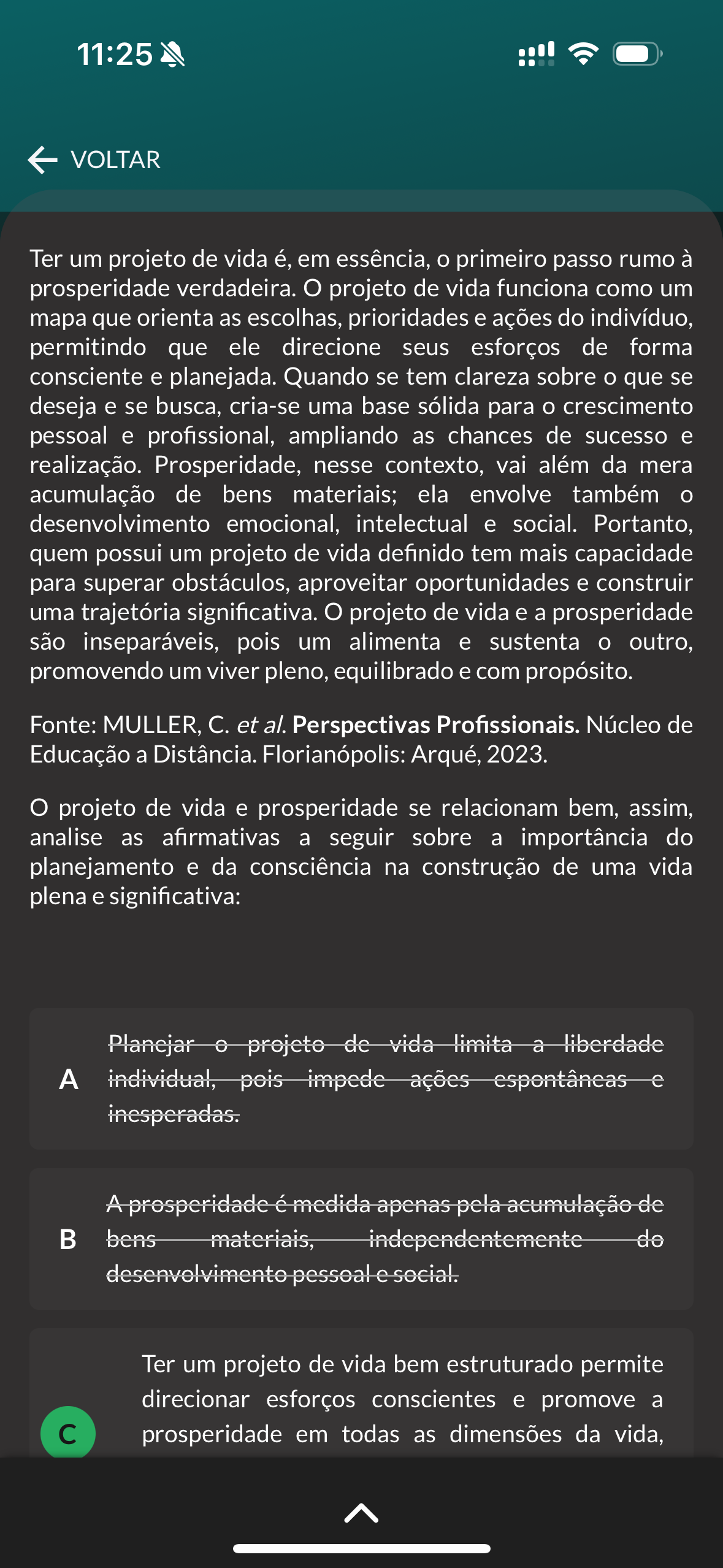 11:25 VOLTAR Ter um projeto de vida é, em essência, o primeiro passo rumo à prosperidade verdadeira. projeto de vida funciona como um mapa que orienta as escolhas, prioridades e ações do indivíduo, permitindo que ele direcione seus esforços de forma consciente e planejada. Quando se tem clareza sobre que se deseja e se busca, cria-se uma base sólida para crescimento pessoal e profissional, ampliando as chances de sucesso e realização. Prosperidade, nesse contexto, vai além da mera acumulação de bens materiais; ela envolve também desenvolvimento emocional, intelectual e social. Portanto, quem possui um projeto de vida definido tem mais capacidade para superar obstáculos, aproveitar oportunidades e construir uma trajetória significativa. projeto de vida e a prosperidade são inseparáveis, pois um alimenta e sustenta outro, promovendo um viver pleno, equilibrado e com propósito. Fonte: MULLER, et al. Perspectivas Profissionais. Núcleo de Educação a Distância. Florianópolis: Arqué, 2023. projeto de vida e prosperidade se relacionam bem, assim, analise as afirmativas a seguir sobre a importância do planejamento e da consciência na construção de uma vida plena e significativa: Planejar projeto de vida limita a liberdade individual, pois impede ações e inesperadas. A prosperidade é medida apenas pela acumulação de bens materiais, independentemente do desenvolvimento pessoal e social. Ter um projeto de vida bem estruturado permite direcionar esforços conscientes e promove a prosperidade em todas as dimensões da vida,