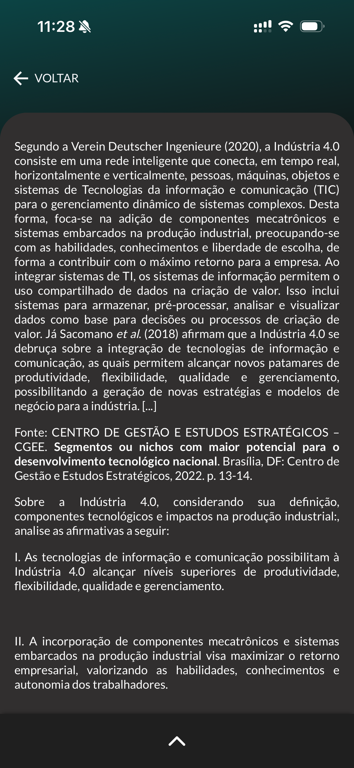 11:28 VOLTAR Segundo a Verein Deutscher Ingenieure (2020), a Indústria 4.0 consiste em uma rede inteligente que conecta, em tempo real, horizontalmente e verticalmente, pessoas, máquinas, objetos e sistemas de Tecnologias da informação e comunicação (TIC) para gerenciamento dinâmico de sistemas complexos. Desta forma, foca-se na adição de componentes mecatrônicos e sistemas embarcados na produção industrial, preocupando-se com as habilidades, conhecimentos e liberdade de escolha, de forma a contribuir com máximo retorno para a empresa. Ao integrar sistemas de TI, os sistemas de informação permitem uso compartilhado de dados na criação de valor. Isso inclui sistemas para armazenar, pré-processar, analisar e visualizar dados como base para decisões ou processos de criação de valor. Já Sacomano et al. (2018) afirmam que a Indústria 4.0 se debruça sobre a integração de tecnologias de informação e comunicação, as quais permitem alcançar novos patamares de produtividade, flexibilidade, qualidade e gerenciamento, possibilitando a geração de novas estratégias e modelos de negócio para a indústria. [...] Fonte: CENTRO DE GESTÃO E ESTUDOS ESTRATÉGICOS CGEE. Segmentos ou nichos com maior potencial para desenvolvimento tecnológico nacional. Brasília, DF: Centro de Gestão e Estudos Estratégicos, 2022. p. 13-14. Sobre a Indústria 4.0, considerando sua definição, componentes tecnológicos e impactos na produção industrial:, analise as afirmativas a seguir: I. As tecnologias de informação e comunicação possibilitam à Indústria 4.0 alcançar níveis superiores de produtividade, flexibilidade, qualidade e gerenciamento. II. A incorporação de componentes mecatrônicos e sistemas embarcados na produção industrial visa maximizar retorno empresarial, valorizando as habilidades, conhecimentos e autonomia dos trabalhadores.