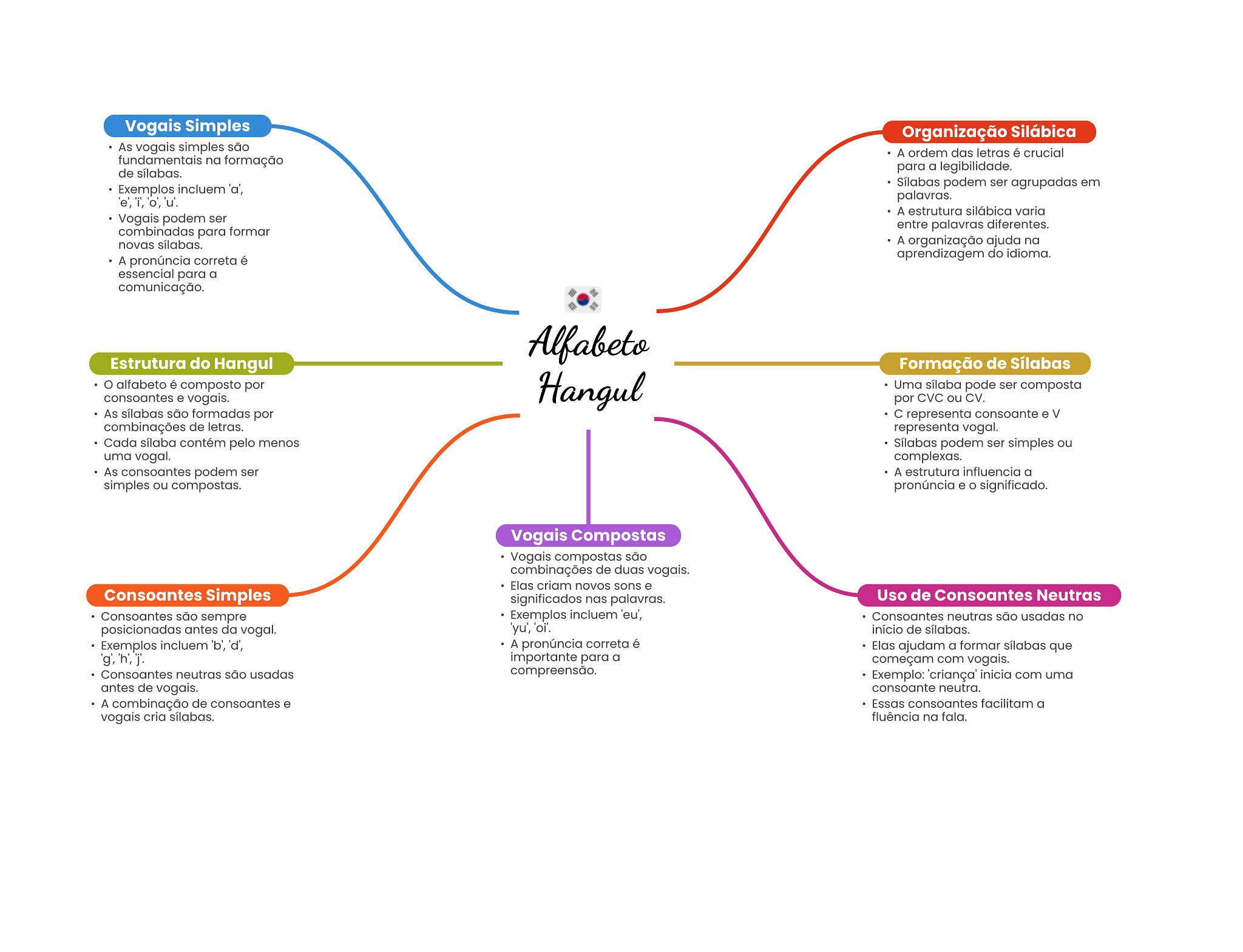 Vogais Simples Organização Silábica As vogais simples são A ordem das letras é crucial fundamentais na formação de sílabas. para a legibilidade. Exemplos incluem Sílabas podem ser agrupadas em 'i', palavras. A estrutura silábica varia Vogais podem ser entre palavras diferentes. combinadas para formar novas sílabas. A organização ajuda na aprendizagem do idioma. A pronúncia correta é essencial para a comunicação. Alfabeto Estrutura do Hangul Formação de Sílabas alfabeto é composto por Hangul Uma sílaba pode ser composta consoantes e vogais. por CVC ou CV. As sílabas são formadas por C representa consoante e V combinações de letras. representa vogal. Cada sílaba contém pelo menos Sílabas podem ser simples ou uma vogal. complexas. As consoantes podem ser A estrutura influencia a simples ou compostas. pronúncia e significado. Vogais Compostas Vogais compostas são combinações de duas vogais. Elas criam novos sons e Consoantes Simples significados nas palavras. Uso de Consoantes Neutras Consoantes são sempre Exemplos incluem 'eu', Consoantes neutras são usadas no posicionadas antes da vogal. 'oi'. início de sílabas. Exemplos incluem 'b', 'd', A pronúncia correta é Elas ajudam a formar sílabas que 'g', 'h', importante para a começam com vogais. Consoantes neutras são usadas compreensão. Exemplo: inicia com uma antes de vogais. consoante neutra. A combinação de consoantes e Essas consoantes facilitam a vogais cria sílabas. fluência na fala.