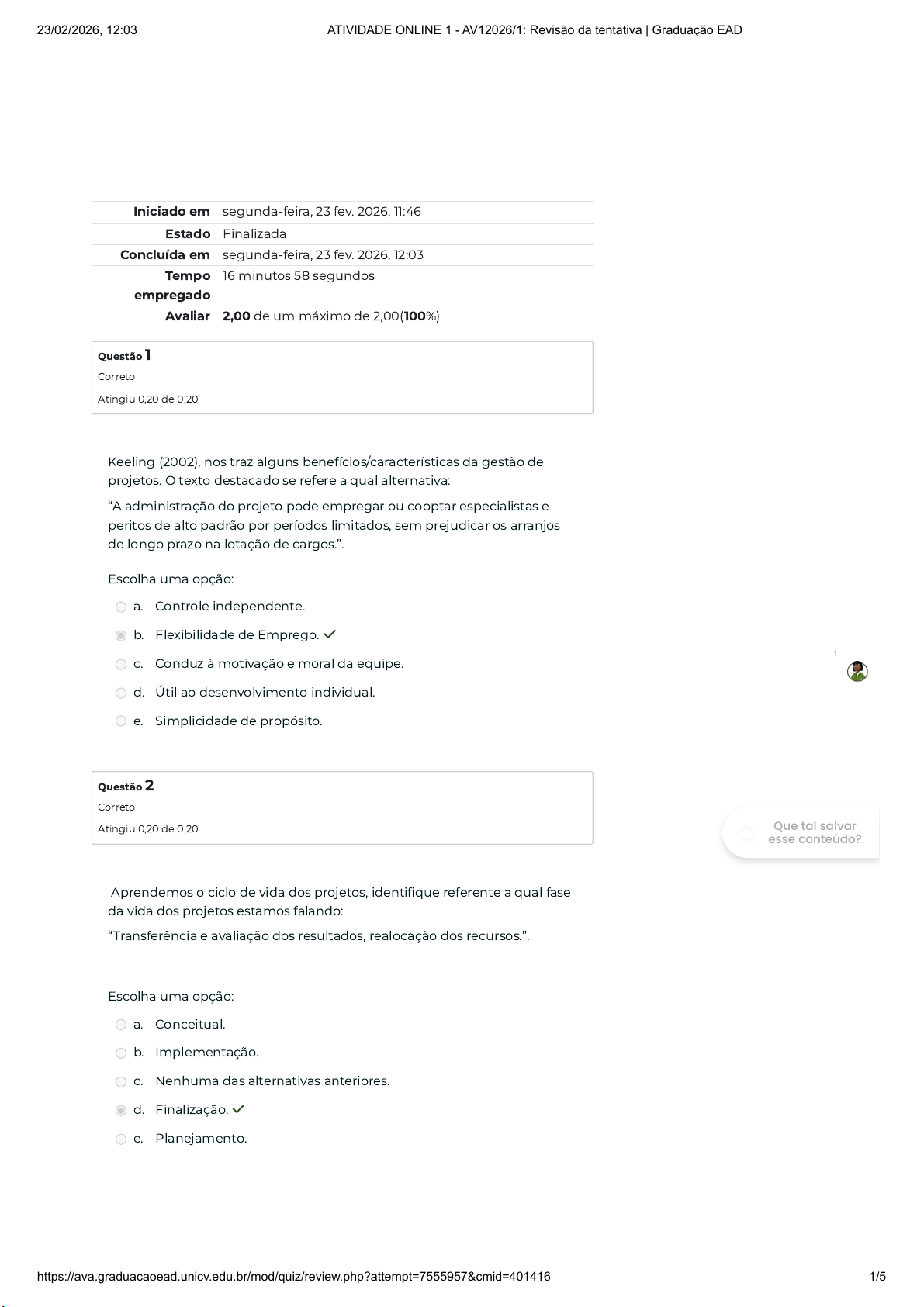 Iniciado em segunda-feira, 23 fev. 2026, 11:46 Estado Finalizada Concluída em segunda-feira, 23 fev. 2026, 12:03 Tempo empregado 16 minutos 58 segundos Avaliar 2,00 de um máximo de 2,00(100%) Questão 1 Correto Atingiu 0,20 de 0,20 Questão 2 Correto Atingiu 0,20 de 0,20 Keeling (2002), nos traz alguns benefícios/características da gestão de projetos. O texto destacado se refere a qual alternativa: “A administração do projeto pode empregar ou cooptar especialistas e peritos de alto padrão por períodos limitados, sem prejudicar os arranjos de longo prazo na lotação de cargos.”. Escolha uma opção: a. Controle independente. b. Flexibilidade de Emprego. ✓ c. Conduz à motivação e moral da equipe. d. Útil ao desenvolvimento individual. e. Simplicidade de propósito. Aprendemos o ciclo de vida dos projetos, identifique referente a qual fase da vida dos projetos estamos falando: “Transferência e avaliação dos resultados, realocação dos recursos.”. Escolha uma opção: a. Conceitual. b. Implementação. c. Nenhuma das alternativas anteriores. d. Finalização. ✓ e. Planejamento. 1 Que tal salvar esse conteúdo? 23/02/2026, 12:03 ATIVIDADE ONLINE 1 - AV12026/1: Revisão da tentativa | Graduação EAD https://ava.graduacaoead.unicv.edu.br/mod/quiz/review.php?attempt=7555957&cmid=401416 1/5 Questão 3 Correto Atingiu 0,20 de 0,20 Questão 4 Correto Atingiu 0,20 de 0,20 Keeling (2002), nos traz alguns benefícios/características da gestão de projetos. O texto destacado se refere a qual alternativa: “A novidade e o interesse específico do trabalho do projeto deve ser atraente às pessoas e leva à formação de equipes entusiásticas e automotivadas.”. Escolha uma opção: a. Útil ao desenvolvimento individual. b. Conduz à motivação e moral da equipe. ✓ c. Controle independente. d. Simplicidade de propósito. e. Flexibilidade de Emprego. Sabendo que a Gerência Projeto é dividida em várias áreas assinale a alternativa correta conforme a frase em destaque: “É a definição e controle do que considerar ou não no projeto.”. Escolha uma opção: a. Objetivo. b. Planejamento. c. Escopo. ✓ d. Tempo. e. Custos. 1 Que tal salvar esse conteúdo? 23/02/2026, 12:03 ATIVIDADE ONLINE 1 - AV12026/1: Revisão da tentativa | Graduação EAD https://ava.graduacaoead.unicv.edu.br/mod/quiz/review.php?attempt=7555957&cmid=401416 2/5 Questão 5 Correto Atingiu 0,20 de 0,20 Questão 6 Correto Atingiu 0,20 de 0,20 Questão 7 Correto Atingiu 0,20 de 0,20 Sabendo que o objetivo deve ser claro, possível e mensurável, qual das alternativas abaixo não são elementos básicos do objetivo: Escolha uma opção: a. Data. b. Orçamento. c. Benefícios Esperados. d. Equipe do Projeto. ✓ e. Principal produto final do projeto, ou entrega. Segundo Molinari (2010), podemos considerar “prazo ou tempo” como processos necessários para garantir a conclusão dos trabalhos no prazo planejado, assinale a alternativa que representa a frase em destaque: “Identificar e documentar as dependências interativas.”. Escolha uma opção: a. Estimar a duração da atividade. b. Desenvolver o cronograma. c. Sequencializar as atividades. ✓ d. Definir as atividades. e. Controlar o cronograma. A frase abaixo se refere a qual termo de projetos: “Ele deve estar definido antes do início. Isso defini um rumo para o projeto, sem isso é como se não existisse uma direção a ser seguida.”. Escolha uma opção: a. Início, Meio e Fim. b. Empreendimento único. c. Objetivo Definido. ✓ d. Sequência Clara. e. Parâmetros Definidos. 1 Que tal salvar esse conteúdo? 23/02/2026, 12:03 ATIVIDADE ONLINE 1 - AV12026/1: Revisão da tentativa | Graduação EAD https://ava.graduacaoead.unicv.edu.br/mod/quiz/review.php?attempt=7555957&cmid=401416 3/5 Questão 8 Correto Atingiu 0,20 de 0,20 Sobre a Gerencia de Projeto, analise as alternativas: I. Ter pensamento crítico: significa combinar conhecimento com experiência e saber avaliar. É saber trabalhar com o time do projeto e com os patrocinadores (stakeholders) de modo a criar sinergia, buscando novas estratégias (ou combinando) e técnicas, aproveitando experiências passadas em projetos similares. II. Gerenciar mudanças organizacionais: querendo ou não, um gerente de projetos é no fundo um agente de mudanças. Se você executar tudo corretamente, tal como prazo, custos e qualidade planejada, ainda enfrentará eventuais resistências pelos usuários se o resultado do projeto for algo que mude sua rotina. Se a mudança (como resultado do projeto) tiver de ocorrer mesmo, então devemos preparar os envolvidos e beneficiados para a mudança. III. Possuir habilidades de negociação: negociar é fundamental para obter o melhor para o projeto e para os envolvidos. IV. Percepção e intuição: no que se refere à intuição, o gerente deve prestar atenção ao que acontece ao seu redor, pois pode influenciar o seu projeto (tanto positivamente como negativamente). A intuição de cada um não pode ser negada quando precisamos tomar alguma atitude. V. Habilidades de colaboração: o gerente deve ser capaz de perceber as opiniões, necessidades e desejos dos envolvidos para poder negociar com todos, de modo que os problemas sejam superados e os objetivos. Afinal, um gerente não pode implementar um projeto sozinho, pois ele precisa de uma equipe, que deve ser gerenciada o melhor possível, respeitando tudo e todos. Assinale a alternativa correta: Escolha uma opção: a. I, II, III, IV e V. ✓ b. I, II, III e V, apenas. c. I, II, IV e V, apenas. d. I, II, III e IV, apenas. e. I, II e III, apenas. 1 Que tal salvar esse conteúdo? 23/02/2026, 12:03 ATIVIDADE ONLINE 1 - AV12026/1: Revisão da tentativa | Graduação EAD https://ava.graduacaoead.unicv.edu.br/mod/quiz/review.php?attempt=7555957&cmid=401416 4/5 Questão 9 Correto Atingiu 0,20 de 0,20 Questão 10 Correto Atingiu 0,20 de 0,20 Kerzner nos traz as fases do planejamento, conforme a frase desta