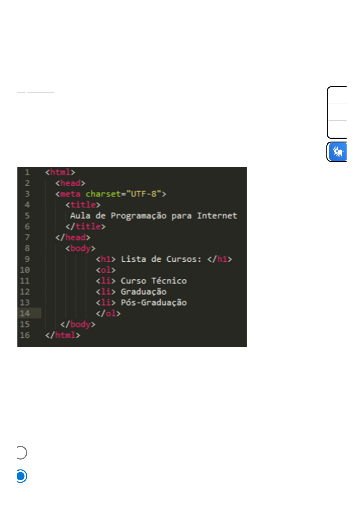 Atividade 2 Iniciado: 23 fev em 10:41 Instruções do teste Pergunta 1 0,2 pts Importante: Caso você esteja realizando a atividade através do aplicativo "Canvas Student", é necessário que você clique em "FAZER O QUESTIONÁRIO", no final da página. No código abaixo, podemos observar um exemplo de utilização de listas ordenadas em HTML: Figura 1: Elaborado pelo autor. Considerando o código e o trecho apresentado sobre listas em HTML, avalie as afirmações a seguir: I. A tag representa o início da lista numerada. II. A tag representa cada item da lista. III. Tanto as tags quanto são tags únicas e não é necessário utilizar um fechamento. É correto o que se afirmar em: I, apenas. I e II, apenas. A+ A A- 23/02/26, 11:21 Teste: Atividade 2 https://famonline.instructure.com/courses/51083/quizzes/244265/take 1/5 Pergunta 2 0,2 pts II, apenas. I e III, apenas. II e III, apenas. Analise o estilo CSS presente no código a seguir: Figura 1: Elaborado pelo autor. O estilo apresentado manipula fontes, cores e alinhamento de vários elementos do documento HTML como , e . Considerando as informações apresentadas, assinale a opção correta. Os parâmetros CSS text-align e align tem a mesma funcionalidade. O parâmetro CSS align representa a cor do elemento manipulado. A+ A A- 23/02/26, 11:21 Teste: Atividade 2 https://famonline.instructure.com/courses/51083/quizzes/244265/take 2/5 Pergunta 3 0,2 pts Pergunta 4 0,2 pts O parâmetro CSS font-size representa o tamanho da fonte do elemento. O parâmetro CSS font-size representa o alinhamento de elementos de texto. O parâmetro CSS font-family representa o tamanho da fonte do elemento. Leia o texto a seguir: Elementos básicos são os que constituem a base de todo documento HTML. Se vê esses elementos no código fonte de todas as páginas da web, logo em seguida da declaração de doctype, que está na primeira linha da página. Os elementos que formam o conteúdo da página estão entre a tag de abertura e a tag de fechamento . O elemento é também conhecido como o elemento raiz. (Fonte: Disponível em: https://developer.mozilla.org/pt-BR/docs/Web/HTML/Element Acesso em: 21 mar. 2020)(adaptado ) Considerando as informações apresentadas, avalie as afirmações a seguir sobre o uso das tags. I. As tags de abertura e fechamento são utilizadas para delimitar os comandos HTML e indicam o começo e o final do documento. II. As tags de abertura e fechamento são utilizadas para indicar o início de um menu na página. III. As tag podem ser utilizadas de forma única, sem a necessidade de fechamento, IV. As tags e são exemplos de tags únicas, que podem ser utilizadas sem a necessidade de fechamento, Estão corretas apenas as afirmativas: I e IV III e IV I, II e IV I e II II e III A+ A A- 23/02/26, 11:21 Teste: Atividade 2 https://famonline.instructure.com/courses/51083/quizzes/244265/take 3/5 Pergunta 5 0,2 pts Leia o texto a seguir: A linguagem HTML foi criada pelo britânico Tim Berners-Lee, o acrônimo HTML significa HiperText Markup Language, traduzindo ao português significa Linguagem de Marcação de Hipertexto. O HTML é o componente básico da web, ele permite inserir o conteúdo e estabelecer a estrutura básica de um website. Portanto, ele serve para dar significado e organizar as informações de uma página na web. Sem isso, o navegador não saberia exibir textos como elementos ou carregar imagens e outros conteúdos. (Fonte: Disponível em: https://www.homehost.com.br/blog/tutoriais/o-que-e-html Acesso em: 20 mar. 2020)(adaptado) A importante linguagem HTML, essencial no desenvolvimento de interfaces e componente básico da web, faz parte de um grupo de tecnologias de: IDE’s. Back-end. Framework. Front-end. Servidores de aplicações. Analise o código em HTML a seguir: Figura 1: Elaborado pelo autor O código representa a criação de um formulário para receber login e senha e com dois botões responsáveis por enviar e limpar os dados do formulário. Considerando o código e o trecho apresentado sobre o formulário em HTML, avalie as afirmações a seguir: A+ A A- 23/02/26, 11:21 Teste: Atividade 2 https://famonline.instructure.com/courses/51083/quizzes/244265/take 4/5 Salvo em 11:21 I. Para uma caixa de seleção de Estados em um formulário de cadastro utilizamos o elemento e composto por . II. Um botão que executa uma ação dinâmica pode ser representado pela tag . III. Para enviar os dados de um formulário utilizamos o atributo “env” dentro da tag . É correto o que se afirmar em: I, apenas. II e III, apenas. I e III, apenas. III, apenas. I e II, apenas. Enviar teste A+ A A- 23/02/26, 11:21 Teste: Atividade 2 https://famonline.instructure.com/courses/51083/quizzes/244265/take 5/5