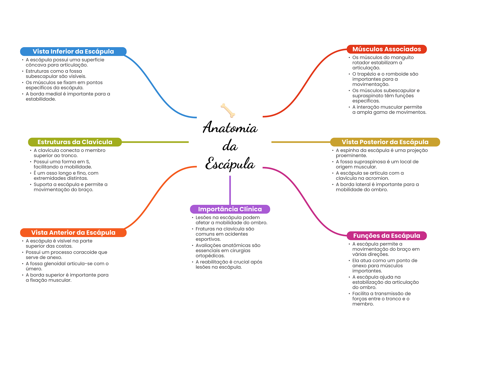 Vista Inferior da Escápula Músculos Associados A escápula possui uma superfície Os músculos do manguito rotador estabilizam a côncava para articulação. articulação. Estruturas como a fossa subescapular são visíveis. trapézio e romboide são importantes para a Os músculos se fixam em pontos movimentação. específicos da escápula. Os músculos subescapular e A borda medial é importante para a supraspinato têm funções estabilidade. específicas. A interação muscular permite a ampla gama de movimentos. Anatomia Estruturas da Clavícula da Vista Posterior da Escápula A clavícula conecta membro A espinha da escápula é uma projeção superior ao tronco. proeminente. Possui uma forma em S, facilitando a mobilidade. Escápula A fossa supraspinosa é um local de origem muscular. É um longo e fino, com A escápula se articula com a extremidades distintas. clavícula na acromion. Suporta a escápula e permite a A borda lateral é importante para a movimentação do braço. mobilidade do ombro. Importância Clínica Lesões na escápula podem afetar a mobilidade do ombro. Fraturas na clavícula são Vista Anterior da Escápula comuns em acidentes Funções da Escápula A escápula é visível na parte esportivos. superior das costas. Avaliações anatômicas são A escápula permite a Possui um processo coracoide que essenciais em cirurgias movimentação do braço em serve de anexo. ortopédicas. várias direções. A reabilitação é crucial após Ela atua como um ponto de A fossa glenoidal articula-se com lesões na escápula. anexo para músculos úmero. importantes. A borda superior é importante para A escápula ajuda na a fixação muscular. estabilização da articulação do ombro. Facilita a transmissão de forças entre tronco e membro.
