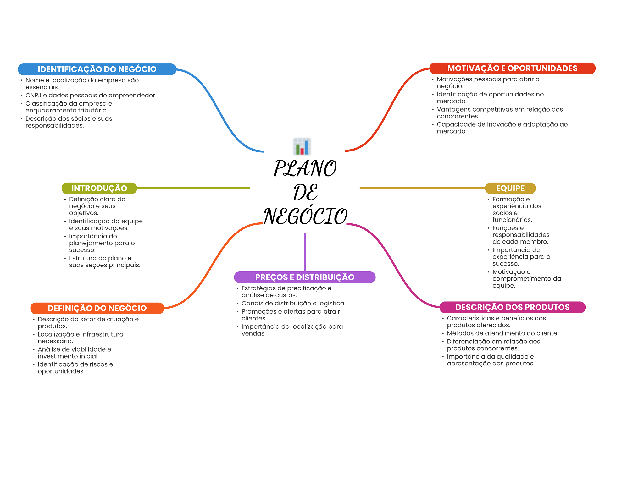 IDENTIFICAÇÃO DO NEGÓCIO MOTIVAÇÃO E Nome e localização da empresa são Motivações pessoais para abrir essenciais. negócio. CNPJ e dados pessoais do empreendedor. Identificação de oportunidades no Classificação da empresa e mercado. enquadramento tributário. Vantagens competitivas em relação aos Descrição dos sócios e suas concorrentes. responsabilidades. Capacidade de inovação e adaptação ao mercado. PLANO INTRODUÇÃO DE EQUIPE Definição clara do Formação e negócio e seus experiência dos objetivos. Identificação da equipe NEGÓCIO sócios e funcionários. e suas motivações. Funções e Importância do responsabilidades planejamento para de cada membro. sucesso. Importância da Estrutura do plano e experiência para suas seções principais. sucesso. Motivação e PREÇOS E DISTRIBUIÇÃO comprometimento da Estratégias de precificação e equipe. análise de custos. DEFINIÇÃO DO NEGÓCIO Canais de distribuição e logística. Promoções e ofertas para atrair DESCRIÇÃO DOS PRODUTOS Descrição do setor de atuação e clientes. Características e benefícios dos produtos. Importância da localização para produtos oferecidos. Localização e infraestrutura vendas. Métodos de atendimento ao cliente. necessária. Diferenciação em relação aos Análise de viabilidade e produtos concorrentes. investimento inicial. Importância da qualidade e Identificação de riscos e apresentação dos produtos. oportunidades.