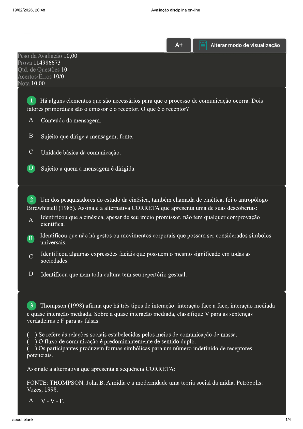 19/02/2026, 20:48 Avaliação disciplina on-line A+ Alterar modo de visualização Peso da Avaliação 10,00 Prova 114986673 Qtd. de Questões 10 Acertos/Erros 10/0 Nota 10,00 1 Há alguns elementos que são necessários para que o processo de comunicação ocorra. Dois fatores primordiais são o emissor e o receptor. O que é o receptor? A Conteúdo da mensagem. B Sujeito que dirige a mensagem; fonte. Unidade básica da comunicação. D Sujeito a quem a mensagem é dirigida. 2 Um dos pesquisadores do estudo da cinésica, também chamada de cinética, foi o antropólogo Birdwhistell (1985). Assinale a alternativa CORRETA que apresenta uma de suas descobertas: A Identificou que a cinésica, apesar de seu início promissor, não tem qualquer comprovação científica. Identificou que não há gestos ou movimentos corporais que possam ser considerados símbolos universais. Identificou algumas expressões faciais que possuem o mesmo significado em todas as sociedades. D Identificou que nem toda cultura tem seu repertório gestual. 3 Thompson (1998) afirma que há três tipos de interação: interação face a face, interação mediada e quase interação mediada. Sobre a quase interação mediada, classifique V para as sentenças verdadeiras e F para as falsas: ( ) Se refere às relações sociais estabelecidas pelos meios de comunicação de massa. fluxo de comunicação é predominantemente de sentido duplo. ( ) Os participantes produzem formas simbólicas para um número indefinido de receptores potenciais. Assinale a alternativa que apresenta a sequência CORRETA: FONTE: THOMPSON, John B.A mídia e a modernidade uma teoria social da mídia. Petrópolis: Vozes, 1998. A about:blank 1/419/02/2026, 20:48 Avaliação disciplina on-line B D 4 Existe um processo específico para a comunicação se efetivar, com passos que ocorrem em sequência. Sobre isso, analise as afirmativas a seguir: I- Se inicia com a codificação da informação pelo emissor. II- Após a codificação, ocorre a decodificação pelo receptor. III- Ocorre mesmo que o receptor não tenha conhecimento do significado dos códigos. IV- Há necessidade de acessibilidade para a veiculação das informações. Assinale a alternativa CORRETA: A As afirmativas I, II e IV estão corretas. B As afirmativas III e IV estão corretas. As afirmativas II, III e IV estão corretas. D As afirmativas I, II e III estão corretas. 5 Pensar na comunicação como um processo livre de interferências é uma visão incorreta da realidade, e não se pode extinguir essas barreiras de comunicação. Sobre isso, associe os itens, utilizando o código a seguir: I- Sobrecarga de informações. II- Tipo de informação. III- Fontes. ( ) Excesso de informação, que é tão prejudicial quanto a falta dela. ( ) Relacionadas à credibilidade. ( ) Maior dificuldade de compreensão dependendo do conteúdo. Assinale a alternativa CORRETA: A I III II. B I - II III. III I II. D II III I. 6 Para que ocorra o processo de comunicação, existem duas partes importantes envolvidas: a comunicação em si e o significado do que é comunicado. Sobre o assunto abordado, associe os itens, about:blank 2/419/02/2026, 20:48 Avaliação disciplina on-line utilizando o código a seguir: I- Comunicação. II- Significado. III- Conteúdo. IV- Forma. ( ) Informações transmitidas que possibilitam a expressão das emoções e dos valores sociais. ( ) Conceito ou noção do que se quer transmitir. ( ) Meios de receber, enviar e registrar informações. ( ) Relação entre a parte que transmite e a parte que compreende. Assinale a alternativa que apresenta a sequência CORRETA: A IV I III II. B II III I IV. III II - IV I. D I IV II III. 7 Quanto aos tipos de interação, um dos aspectos abordados é o espaço e tempo. Somente uma das interações permite o contexto de copresença. Qual é essa interação? A Interação complementar. Interação mediada. Interação quase mediada. D Interação face a face. 8 De acordo com a literatura, a abordagem da comunicação não verbal é feita pela Teoria Proxêmica. O que é Teoria Proxêmica? A É a teoria na qual se analisa de que forma determinadas habilidades e competências aproximam um indivíduo da "comunicação perfeita". B É a teoria que avalia a posição corporal e as relações espaciais do indivíduo como elaboração da cultura em que ele está inserido. É a teoria que busca esclarecer as diferenças entre a comunicação verbal e não verbal. D É a teoria que estuda de que forma o sinal passa do emissor para o receptor, dependendo da proximidade entre ambos. 9 Thompson (1998) afirma que há três tipos de interação: interação face a face, interação mediada e quase interação mediada. Sobre a interação mediada, classifique V para as sentenças verdadeiras e F para as falsas: about:blank 3/419/02/2026, 20:48 Avaliação disciplina on-line ( ) Acontecem por meios como papel, fios elétricos e ondas eletromagnéticas. ( ) Tal comunicação não oferece tantas possibilidades de deixas simbólicas. ( ) As mensagens transmitidas não precisam de interpretação por parte dos indivíduos. Assinale a alternativa que apresenta a sequência CORRETA: FONTE: THOMPSON, John B.A mídia e a modernidade uma teoria social da mídia. Petrópolis: Vozes, 1998. A B D 10 Além dos elementos já consagrados na literatura, como por exemplo a Mensagem, a Informação e o Sinal, alguns estudiosos consideram também a Percepção. Sobre a Percepção, classifique V para as sentenças verdadeiras e F para as falsas: A Percepção não abrange a autopercepção. A Percepção abrange a percepção do outro. É um componente sem potencial de criar distorções. Pode interferir na meta da comunicação perfeita. Assinale a alternativa que apresenta a sequência CORRETA: A F-V-V-F. V-V-F-F. F-V-F-V. D V-F-F-V. Imprimir about:blank 4/4