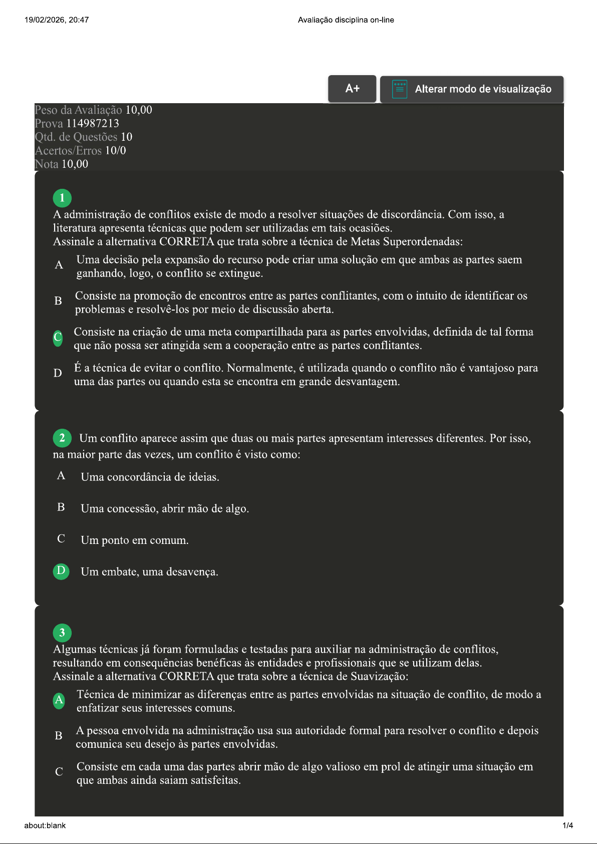 19/02/2026, 20:47 Avaliação disciplina on-line A+ Alterar modo de visualização Peso da Avaliação 10,00 Prova 114987213 Qtd. de Questões 10 Acertos/Erros 10/0 Nota 10,00 1 A administração de conflitos existe de modo a resolver situações de discordância. Com isso, a literatura apresenta técnicas que podem ser utilizadas em tais ocasiões. Assinale a alternativa CORRETA que trata sobre a técnica de Metas Superordenadas: A Uma decisão pela expansão do recurso pode criar uma solução em que ambas as partes saem ganhando, logo, o conflito se extingue. Consiste na promoção de encontros entre as partes conflitantes, com o intuito de identificar os problemas e resolvê-los por meio de discussão aberta. Consiste na criação de uma meta compartilhada para as partes envolvidas, definida de tal forma que não possa ser atingida sem a cooperação entre as partes conflitantes. D É a técnica de evitar o conflito. Normalmente, é utilizada quando o conflito não é vantajoso para uma das partes ou quando esta se encontra em grande desvantagem. 2 Um conflito aparece assim que duas ou mais partes apresentam interesses diferentes. Por isso, na maior parte das vezes, um conflito é visto como: A Uma concordância de ideias. Uma concessão, abrir mão de algo. Um ponto em comum. D Um embate, uma desavença. 3 Algumas técnicas já foram formuladas e testadas para auxiliar na administração de conflitos, resultando em consequências benéficas às entidades e profissionais que se utilizam delas. Assinale a alternativa CORRETA que trata sobre a técnica de Suavização: A Técnica de minimizar as diferenças entre as partes envolvidas na situação de conflito, de modo a enfatizar seus interesses comuns. B A pessoa envolvida na administração usa sua autoridade formal para resolver o conflito e depois comunica seu desejo às partes envolvidas. Consiste em cada uma das partes abrir mão de algo valioso em prol de atingir uma situação em que ambas ainda saiam satisfeitas. about:blank 1/419/02/2026, 20:47 Avaliação disciplina on-line D Utilização de técnicas de mudança comportamental com o objetivo de modificar atitudes e comportamentos praticados pelas partes que possam estar causando o conflito. 4 Em geral, quando se fala sobre conflitos, situações desagradáveis vem à tona. Briga entre colegas, dificuldade de atingir metas, e demais aspectos negativos são os primeiros a aparecerem. Sobre o exposto, assinale a alternativa CORRETA: A Todos os conflitos precisam ser exterminados assim que possível, pois quanto mais rápido são solucionados, menos perda deriva da situação. B Lidar com conflitos, quando ocorrem em empresas, exige dos gestores a contratação de profissionais preparados em negociação interpessoal. Conflitos podem ser solucionados ou estimulados, dependendo dos interesses do negociador ou da empresa que ele representa. D Como todos os conflitos trazem algo de positivo, o correto é que sempre se aguarde um período antes de solucioná-los, para garantir que os benefícios sejam usufruídos. 5 Conflitos não são algo novo. Acontecem desde que se tem relação entre pessoas. Por isso, algumas formas de lidar com os conflitos acabam sendo instintivas, sem tanto apego a técnicas formalizadas. Uma dessas formas é o Comando Autoritário. Sobre ele, assinale a alternativa CORRETA: A Técnica de minimizar as diferenças entre as partes envolvidas na situação de conflito, de modo a enfatizar seus interesses comuns. Utilização de técnicas de mudança comportamental com o objetivo de modificar atitudes e comportamentos praticados pelas partes que possam estar causando o conflito. Consiste em cada uma das partes abrir mão de algo valioso em prol de atingir uma situação em que ambas ainda saiam satisfeitas. D A pessoa envolvida na administração usa sua autoridade formal para resolver o conflito e depois comunica seu desejo às partes envolvidas. 6 Entre as três abordagens possíveis para o administrador lidar com um conflito existente, há a chamada abordagem dos processos do conflito. Sobre o que trata essa abordagem? A Procura formar uma equipe especializada em administrar relações interpessoais. B Acompanha diariamente de que forma os conflitos impactam no resultado financeiro da entidade. Gerencia a raiz do problema, ou seja, a situação que provocou o conflito. D Busca a modificação do processo para, só assim, reduzir a situação de conflito. 7 Há cinco estágios em uma situação conflituosa, cada um com suas características específicas. É importante compreender essa sequência para conseguir administrar o conflito ocorrido. Assinale a alternativa CORRETA que trata do estágio da OPOSIÇÃO POTENCIAL: about:blank 2/419/02/2026, 20:47 Avaliação disciplina on-line A Estágio em que há a decisão de agir de uma determinada maneira. B Estágio no qual condições anteriores levam ao conflito caso uma ou mais partes envolvidas tenha sido afetada e esteja consciente disso. Estágio no qual a parte coloca em prática o que decidiu fazer para lidar com a oposição. D Estágio no qual aparecem as condições e os fatores para o surgimento do conflito. 8 A existência de conflitos é próprio das relações interpessoais. Não há como pensar na existência de convívio humano sem conflitos, mesmo que sejam esporádicos. A administração de conflitos surge na intenção de evitar que se chegue a situações de: A Agressividade e confronto verbal ou físico. B Mudança de mentalidade por uma das partes envolvidas. Integração entre as partes de uma entidade. D Debate pacífico. 9 Para que um conflito seja bem administrado, é importante se atentar aos cinco estágios que o compõe. Assim, o conflito pode ser utilizado a favor do progresso, e não como fator de discórdia destrutiva. Assinale a alternativa CORRETA que trata do estágio do Comportamento: A Estágio no qual a parte coloca em prática o que decidiu fazer para lidar com a oposição.
