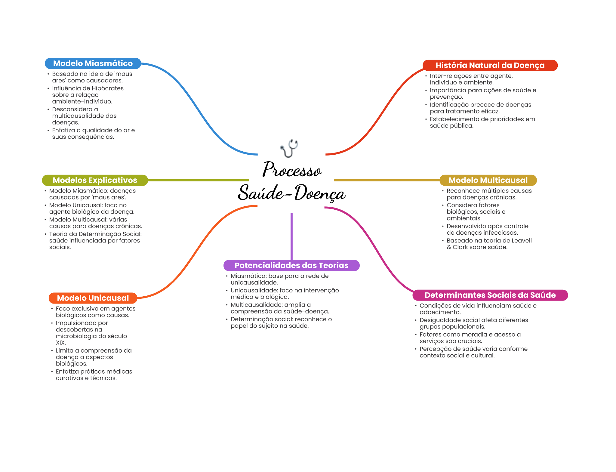 Modelo Miasmático História Natural da Doença Baseado na ideia de maus Inter-relações entre agente, ares' como causadores. indivíduo e ambiente. Influência de Hipócrates Importância para ações de saúde e sobre a relação prevenção. Identificação precoce de doenças Desconsidera a para tratamento eficaz. multicausalidade das doenças. Estabelecimento de prioridades em saúde pública. Enfatiza a qualidade do ar e suas consequências. Processo Modelos Explicativos Modelo Multicausal Modelo Miasmático: doenças Saúde-Doença Reconhece múltiplas causas causadas por maus ares'. para doenças crônicas. Modelo Unicausal: foco no Considera fatores agente biológico da doença. biológicos, sociais e Modelo Multicausal: várias ambientais. causas para doenças crônicas. Desenvolvido após controle Teoria da Determinação Social: de doenças infecciosas. saúde influenciada por fatores Baseado na teoria de Leavell sociais. & Clark sobre saúde. Potencialidades das Teorias Miasmática: base para a rede de unicausalidade. Unicausalidade: foco na intervenção Modelo Unicausal médica e biológica. Determinantes Sociais da Saúde amplia a Foco exclusivo em agentes Condições de vida influenciam saúde e compreensão da saúde-doença. adoecimento. biológicos como causas. Determinação social: reconhece Impulsionado por Desigualdade social afeta diferentes papel do sujeito na saúde. descobertas na grupos populacionais. microbiologia do século Fatores como moradia e acesso a XIX. serviços são cruciais. Limita a compreensão da Percepção de saúde varia conforme doença a aspectos contexto social e cultural. biológicos. Enfatiza práticas médicas curativas e técnicas.