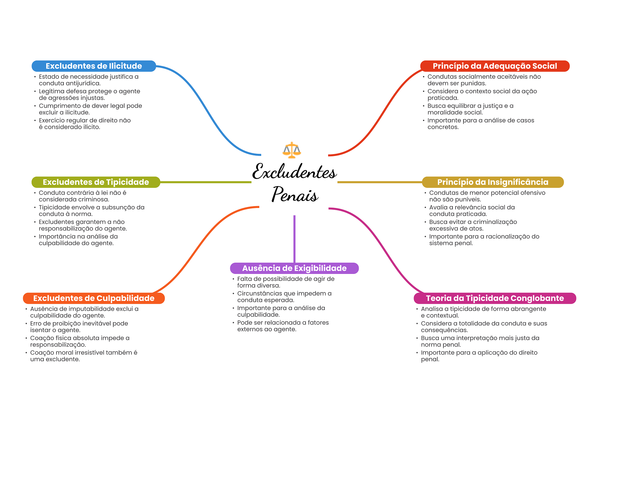 Excludentes de Ilicitude Princípio da Adequação Social Estado de necessidade justifica a Condutas socialmente aceitáveis não conduta antijurídica. devem ser punidas. Legítima defesa protege agente Considera contexto social da ação de agressões injustas. praticada. Cumprimento de dever legal pode Busca equilibrar a justiça e a excluir a ilicitude. moralidade social. Exercício regular de direito não Importante para a análise de casos é considerado ilícito. concretos. Excludentes Excludentes de Tipicidade Princípio da Insignificância Conduta contrária à lei não é Penais Condutas de menor potencial ofensivo considerada criminosa. não são puníveis. Tipicidade envolve a subsunção da Avalia a relevância social da conduta à norma. conduta praticada. Excludentes garantem a não Busca evitar a criminalização responsabilização do agente. excessiva de atos. Importância na análise da Importante para a racionalização do culpabilidade do agente. sistema penal. Ausência de Exigibilidade Falta de possibilidade de agir de forma diversa. Circunstâncias que impedem a Excludentes de Culpabilidade conduta esperada. Teoria da Tipicidade Conglobante Ausência de imputabilidade exclui a Importante para a análise da Analisa a tipicidade de forma abrangente culpabilidade do agente. culpabilidade. e - contextual. Erro de proibição inevitável pode Pode ser relacionada a fatores Considera a totalidade da conduta e suas isentar agente. externos ao agente. consequências. Coação física absoluta impede a Busca uma interpretação mais justa da responsabilização. norma penal. Coação moral irresistível também é Importante para a aplicação do direito uma excludente. penal.