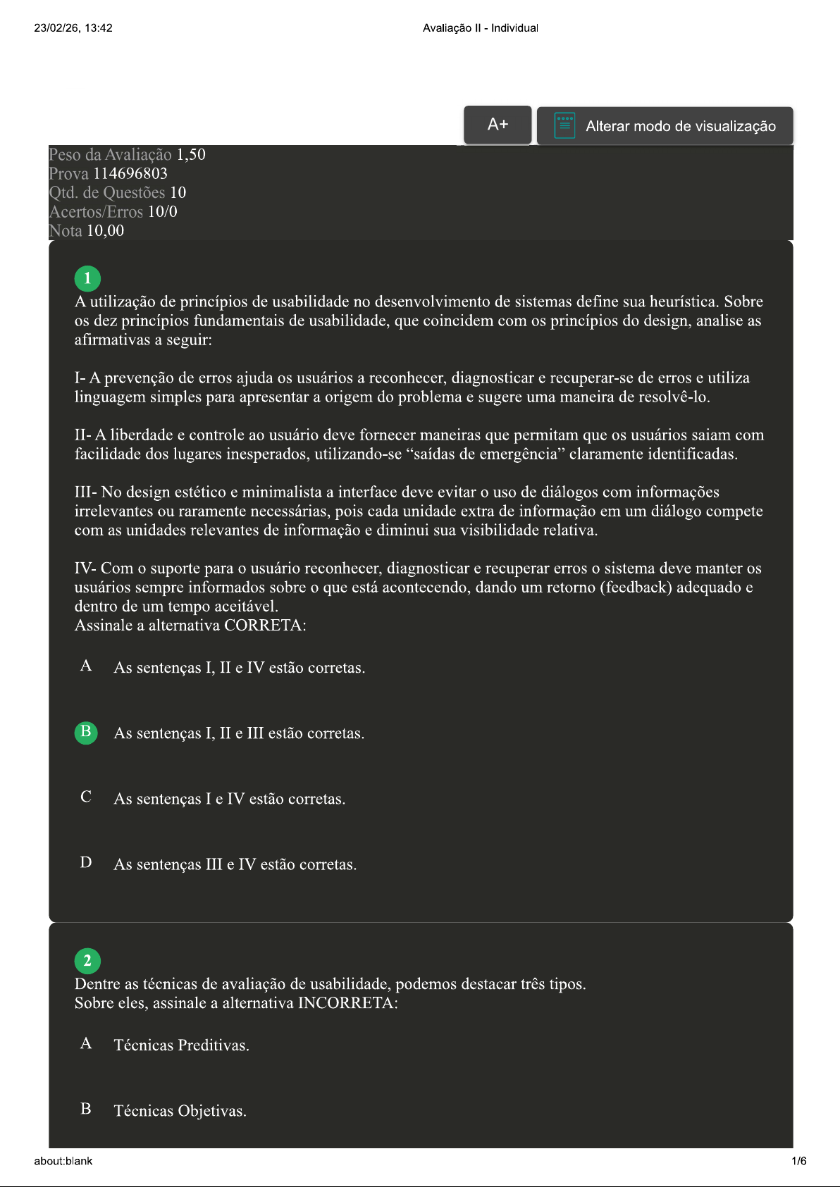 23/02/26, 13:42 Avaliação Individual A+ Alterar modo de visualização Peso da Avaliação 1,50 Prova 114696803 Qtd. de Questões 10 Acertos/Erros 10/0 Nota 10,00 1 A utilização de princípios de usabilidade no desenvolvimento de sistemas define sua heurística. Sobre os dez princípios fundamentais de usabilidade, que coincidem com os princípios do design, analise as afirmativas a seguir: I- A prevenção de erros ajuda os usuários a reconhecer, diagnosticar e recuperar-se de erros e utiliza linguagem simples para apresentar a origem do problema e sugere uma maneira de resolvê-lo. II- A liberdade e controle ao usuário deve fornecer maneiras que permitam que os usuários saiam com facilidade dos lugares inesperados, utilizando-se "saídas de emergência" claramente identificadas. III- No design estético e minimalista a interface deve evitar o uso de diálogos com informações irrelevantes ou raramente necessárias, pois cada unidade extra de informação em um diálogo compete com as unidades relevantes de informação e diminui sua visibilidade relativa. IV- Com o suporte para o usuário reconhecer, diagnosticar e recuperar erros o sistema deve manter os usuários sempre informados sobre o que está acontecendo, dando um retorno (feedback) adequado e dentro de um tempo aceitável. Assinale a alternativa CORRETA: A As sentenças I, II e IV estão corretas. As sentenças I, II e III estão corretas. As sentenças I e IV estão corretas. D As sentenças III e IV estão corretas. 2 Dentre as técnicas de avaliação de usabilidade, podemos destacar três tipos. Sobre eles, assinale a alternativa INCORRETA: A Técnicas Preditivas. B Técnicas Objetivas. about:blank 1/623/02/26, 13:42 Avaliação Individual Técnicas de Sistema de Monitoramento. D Técnicas Prospectivas. 3 Baseado em algumas combinações entre a natureza do problema, o tipo de usuário que ele prejudica e seus efeitos sobre a usabilidade das funções, pode-se propor um sistema de classificação. Sobre a classificação da natureza de um problema de usabilidade associe os itens, utilizando o código a seguir: I- Ruído. II- Obstáculo. III- Barreira. Refere-se a um aspecto da interface no qual o usuário esbarra e aprende a suplantá-lo. Em função do obstáculo, as próximas realizações da tarefa dar-se-ão à custa de uma perda de desempenho. Refere-se a um aspecto da interface no qual o usuário esbarra sucessivas vezes e não aprende a suplantá-lo. Refere-se a um aspecto da interface que causa uma diminuição, ao usuário, do desempenho na tarefa. usuário pode desenvolver uma má impressão do sistema Assinale a alternativa que apresenta a sequência CORRETA: A I III II. B II III I. II I III. D 4 A norma da ISO 9241-11 definiu oficialmente o conceito de usabilidade, e também descreveu os requisitos ergonômicos para trabalho de escritórios com computadores. Ela considera a usabilidade dos computadores em uma abordagem abrangente, na qual o contexto de uso, formado pelos usuários, tarefas, equipamentos (hardware, software e materiais) e o ambiente físico e social, determinará o nível de usabilidade alcançado em um sistema de trabalho. Segundo a norma, a usabilidade se refere à medida da capacidade dos usuários em trabalhar de modo eficaz, efetivo e com satisfação. Sobre a norma, assinale a alternativa CORRETA: about:blank 2/623/02/26, 13:42 Avaliação Individual A A norma dita como os administradores podem influenciar a usabilidade de um produto dentro de um sistema de trabalho. B Os indicadores de satisfação do usuário não podem ser mensurados avaliando a qualidade do sistemas e todas as sua interligações. contexto de utilização compreende somente como os equipamentos de hardware. D A usabilidade é vista como uma medida da capacidade dos usuários no uso de um produto de software em determinado contexto. 5 A usabilidade figura como um dos componentes de cada modelo de qualidade de software. Usabilidade é definida como a capacidade que um sistema interativo oferece a seu usuário, em um determinado contexto de operação, para a realização de tarefas, de maneira eficaz, eficiente e agradável. A usabilidade de uma interface é um conceito que se refere à qualidade da interação de sistemas com os usuários e depende de vários aspectos. Sobre os fatores que influenciam na usabilidade, classifique V para as sentenças verdadeiras e F para as falsas: ( ) Satisfação do usuário: avalia se o usuário desenvolve o código fonte do sistema e realiza a implantação de forma fácil. Facilidade de aprendizado do sistema: tempo e esforço necessários para que os usuários atinjam um determinado nível de desempenho. Flexibilidade: avalia a possibilidade de o usuário acrescentar e modificar as funções e o ambiente iniciais do sistema. Produtividade: se o uso do sistema permite frustrar as expectativas em comparação com a fase de desenvolvimento. Assinale a alternativa que apresenta a sequência CORRETA: A F-V-F-V. V-F-F-F. F-V-V-F. D V-F-F-V. about:blank 3/623/02/26, 13:42 Avaliação Individual 6 Usabilidade é a capacidade que apresenta um sistema interativo de ser operado, de maneira eficaz, eficiente e agradável, em um determinado contexto de operação, para a realização das tarefas de seus usuários. Sobre os objetivos da avaliação de usabilidade de um sistema interativo, classifique V para as sentenças verdadeiras e F para as falsas: ( ) Validar a eficácia da interação humano-computador face à efetiva realização das tarefas por parte dos usuários. ( ) Verificar a eficiência dessa interação, face os recursos empregados (tempo, quantidade de incidentes, passos desnecessários, busca de ajuda etc. Validar o tempo de resposta para cada interação do usuário com o sistema. ( ) Obter indícios da satisfação ou insatisfação (efeito subjetivo) que ela possa trazer ao usuário. Esses objetivos devem ser pensados com relação aos diferentes contextos de operaç
