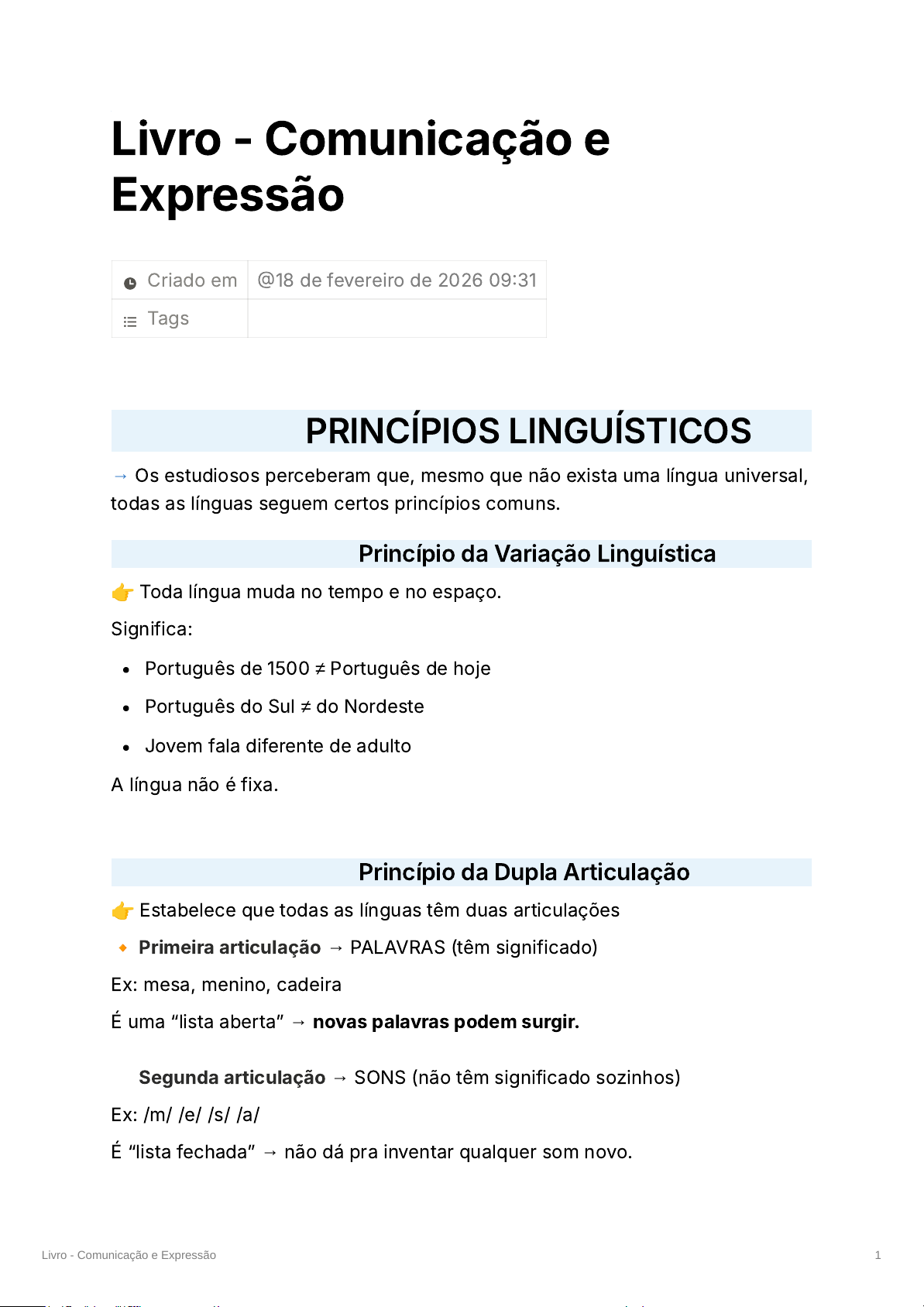 Livro - Comunicação e Expressão Criado em Tags PRINCÍPIOS LINGUÍSTICOS → Os estudiosos perceberam que, mesmo que não exista uma língua universal, todas as línguas seguem certos princípios comuns. Princípio da Variação Linguística 👉 Toda língua muda no tempo e no espaço. Significa: Português de 1500 ≠ Português de hoje Português do Sul ≠ do Nordeste Jovem fala diferente de adulto A língua não é fixa. Princípio da Dupla Articulação 👉 Estabelece que todas as línguas têm duas articulações 🔸 Primeira articulação → PALAVRAS (têm significado) Ex: mesa, menino, cadeira É uma “lista aberta” → novas palavras podem surgir. 🔸 Segunda articulação → SONS (não têm significado sozinhos) Ex: /m/ /e/ /s/ /a/ É “lista fechada” → não dá pra inventar qualquer som novo. �18 de fevereiro de 2026 09�31 Livro - Comunicação e Expressão 1 Significa que a língua é construída por sons que formam palavras. Princípio da Singularidade 👉 Todas as línguas articulam as suas estruturas de forma própria, singular Ex: Português → “meninas bonitas” Inglês → “beautiful girls” A posição do adjetivo muda. Ou seja: as línguas não funcionam todas iguais. Princípio da Universalidade 👉 Mesmo sendo diferentes, todas as línguas têm traços em comum: Substantivo Sons Estrutura Princípio da Sistematicidade 👉 Todo falante, ao adquirir uma língua, aprende toda a estrutura dessa língua. Princípio do Processo Analógico 👉O falante tende a tornar regulares as irregularidades da língua. Exemplo do livro: Criança fala: “Eu fazi” (por analogia com “eu comi”) Ela aplica um padrão já conhecido. O cérebro tenta padronizar. Princípio da Criatividade Linguística 👉 O ser humano consegue criar frases novas infinitamente. ESPERANTO → Houve tentativa de criar uma língua única e universal para o mundo → Esperanto (essa língua não permite o uso de ironias e ambiguidades, tornou-se difícil impor). Livro - Comunicação e Expressão 2 Mas não deu certo. Porque língua não muda por decisão. Ela muda pelo uso social. 📌 Língua não é imposta, ela é construída. Com o livro Cours de Linguistique Générale, nasce oficialmente a Linguística como ciência. ❌ Linguista não diz o que é certo ou errado. ✅ Ele observa como as pessoas falam. 💡 Gramaticalmente não é padrão, mas cumpre função comunicativa. NO SÉCULO XIX O HOMEM BUSCAVA A LINGUA MÃE VARIAÇÃO LINGUÍSTICA → A língua muda conforme a necessidade de quem fala. → Sempre que precisamos adaptar ou criar uma forma nova de expressão, modificamos a língua. A língua muda dependendo de: Lugar Idade Sexo Grau de estudo Grupo social Época histórica Não existe uma única forma “igual” de falar português. A língua se adapta às necessidades de quem usa. VARIAÇÃO NO TEMPO → O texto mostra um exemplo antigo �1855�. Ele parece diferente do português atual. Livro - Comunicação e Expressão 3 Isso prova que: ✔ A língua muda ao longo dos anos ✔ O português de hoje não é o mesmo do passado Ex: “Aqua” virou “água”. Mudança histórica. VARIAÇÃO REGIONAL → Cada região tem expressões próprias. Isso significa: Português é o mesmo idioma, mas usado de formas diferentes em cada região. VARIAÇÃO POR FAIXA ETÁRIA → A linguagem muda conforme a idade. Cada idade tem seus interesses e estilo. VARIAÇÃO POR SEXO → O livro diz que homens e mulheres costumam ter diferenças no modo de falar. Também mudam: Temas Vocabulário Isso não é regra absoluta, mas uma observação social. VARIAÇÃO POR ESTUDO → Quanto maior o acesso à educação: ✔ Mais amplo o vocabulário ✔ Melhor domínio dos níveis de linguagem VARIAÇÃO POR GRUPOS SOCIAIS → Cada grupo social cria sua própria forma de falar. Exemplos do livro: 🏄 Surfistas: “Dropei a onda, peguei um tubo e levei uma vaca.” 🎧 Funkeiros: “Fui num baile que era uma maresia…” Livro - Comunicação e Expressão 4 Se você não conhece os termos, você não entende. 👉 Linguagem também é identidade. 💡 O texto conclui: ✔ A língua muda sempre que necessário ✔ Não devemos ter preconceito linguístico ✔ Não existe uma única forma correta absoluta ✔ O importante é comunicar A linguagem se adapta ao contexto. Livro - Comunicação e Expressão 5