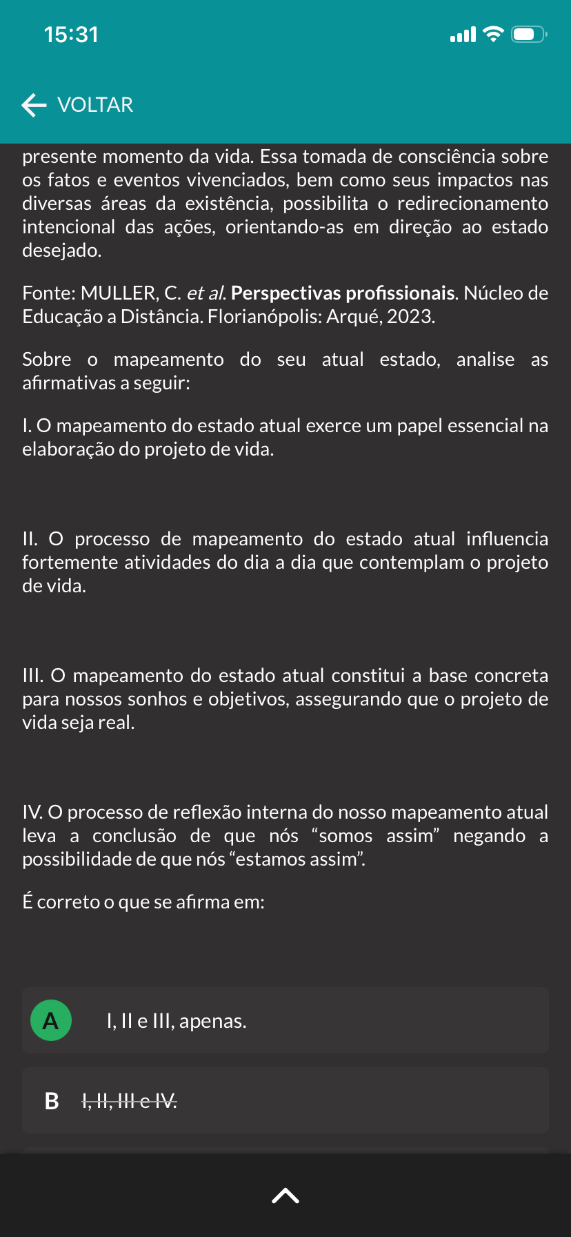 15:31 VOLTAR presente momento da vida. Essa tomada de consciência sobre os fatos e eventos vivenciados, bem como seus impactos nas diversas áreas da existência, possibilita redirecionamento intencional das ações, orientando-as em direção ao estado desejado. Fonte: MULLER, et al. Perspectivas profissionais. Núcleo de Educação a Distância. Florianópolis: Arqué, 2023. Sobre o mapeamento do seu atual estado, analise as afirmativas a seguir: I. mapeamento do estado atual exerce um papel essencial na elaboração do projeto de vida. II. processo de mapeamento do estado atual influencia fortemente atividades do dia a dia que contemplam o projeto de vida. III. mapeamento do estado atual constitui a base concreta para nossos sonhos e objetivos, assegurando que projeto de vida seja real. IV. processo de reflexão interna do nosso mapeamento atual leva a conclusão de que nós "somos assim" negando a possibilidade de que nós "estamos assim". É correto o que se afirma em: A I, e III, apenas.