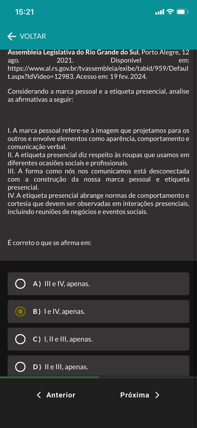 15:21 VOLTAR Assembleia Legislativa do Rio Grande do Sul, Porto Alegre, 12 ago. 2021. Disponível em: t.aspx?IdVideo=12983. Acesso em: 19 fev. 2024. Considerando a marca pessoal e a etiqueta presencial, analise as afirmativas a seguir: I. A marca pessoal refere-se à imagem que projetamos para os outros e envolve elementos como aparência, comportamento e comunicação verbal. II. A etiqueta presencial diz respeito às roupas que usamos em diferentes ocasiões sociais e profissionais. III. A forma como nós nos comunicamos está desconectada com a construção da nossa marca pessoal e etiqueta presencial. IV. A etiqueta presencial abrange normas de comportamento e cortesia que devem ser observadas em interações presenciais, incluindo reuniões de negócios e eventos sociais. É correto o que se afirma em: A) III e IV, apenas. B) le IV, apenas. C) III, apenas. D) e III, apenas.