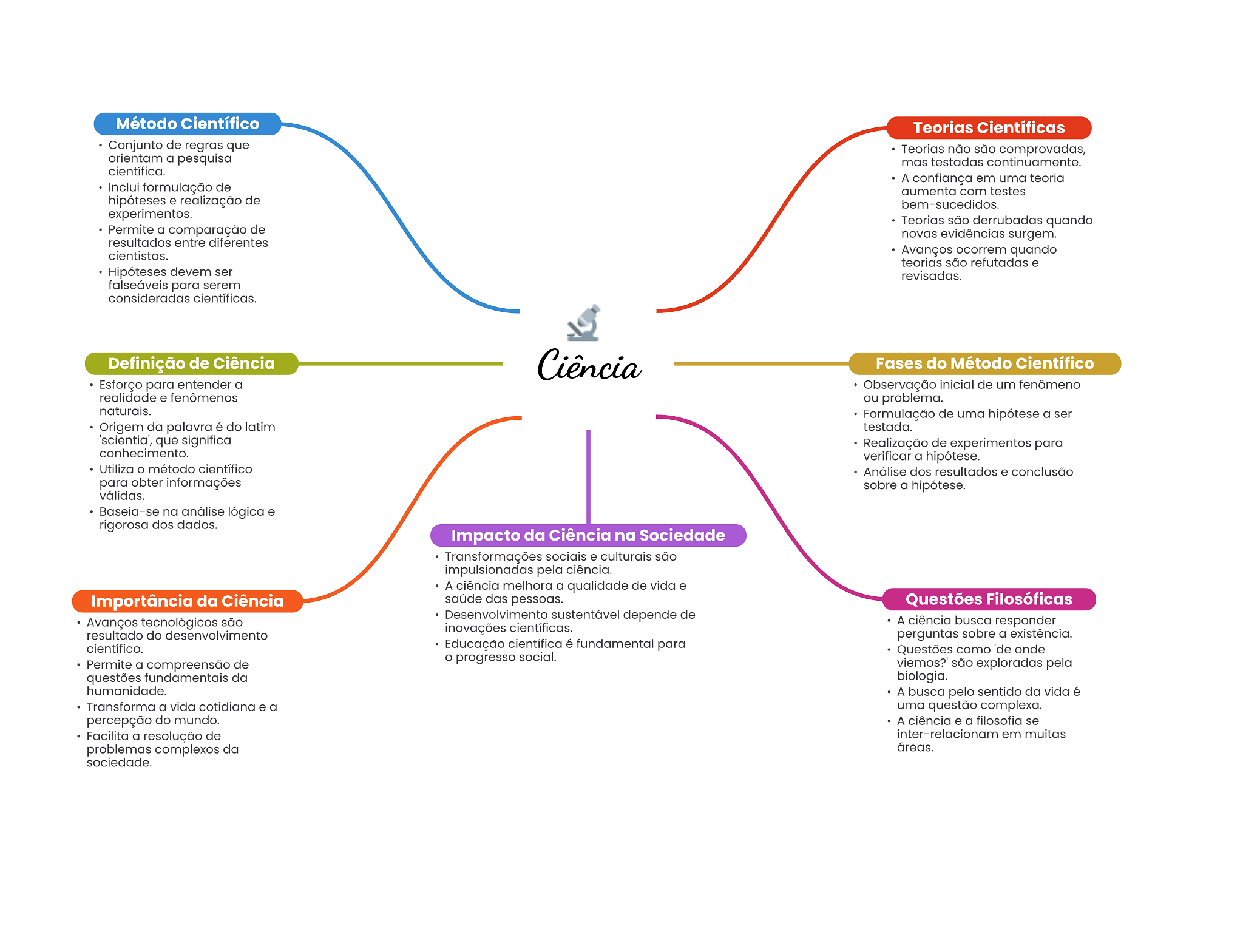Método Científico Teorias Científicas Conjunto de regras que Teorias não são comprovadas, orientam a pesquisa mas testadas continuamente. científica. A confiança em uma teoria Inclui formulação de aumenta com testes hipóteses e realização de bem-sucedidos. experimentos. Teorias são derrubadas quando Permite a comparação de novas evidências surgem. resultados entre diferentes cientistas. Avanços ocorrem quando teorias são refutadas e Hipóteses devem ser revisadas. falseáveis para serem consideradas científicas. Definição de Ciência Ciência Fases do Método Científico Esforço para entender a Observação inicial de um fenômeno realidade e fenômenos ou problema. naturais. Formulação de uma hipótese a ser Origem da palavra é do latim testada. 'scientia', que significa Realização de experimentos para conhecimento. verificar a hipótese. Utiliza método científico Análise dos resultados e conclusão para obter informações sobre a hipótese. válidas. Baseia-se na análise lógica e rigorosa dos dados. Impacto da Ciência na Sociedade Transformações sociais e culturais são impulsionadas pela ciência. A ciência melhora a qualidade de vida e Importância da Ciência saúde das pessoas. Questões Filosóficas Desenvolvimento sustentável depende de Avanços tecnológicos são A ciência busca responder resultado do desenvolvimento inovações científicas. perguntas sobre a existência. científico. Educação científica é fundamental para Questões como de onde progresso social. Permite a compreensão de viemos?' são exploradas pela questões fundamentais da biologia. humanidade. A busca pelo sentido da vida é Transforma a vida cotidiana e a uma questão complexa. percepção do mundo. A ciência e a filosofia se Facilita a resolução de inter-relacionam em muitas problemas complexos da áreas. sociedade.