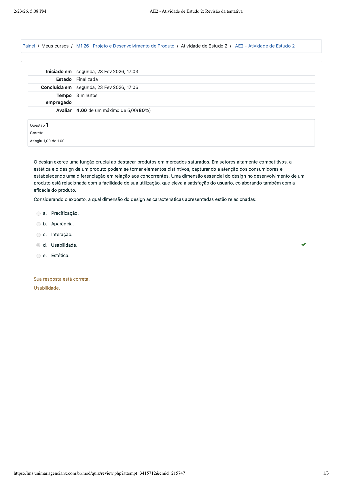 Iniciado em segunda, 23 Fev 2026, 17:03 Estado Finalizada Concluída em segunda, 23 Fev 2026, 17:06 Tempo empregado 3 minutos Avaliar 4,00 de um máximo de 5,00(80%) Questão 1 Correto Atingiu 1,00 de 1,00 Painel / Meus cursos / M1.26 | Projeto e Desenvolvimento de Produto / Atividade de Estudo 2 / AE2 - Atividade de Estudo 2 O design exerce uma função crucial ao destacar produtos em mercados saturados. Em setores altamente competitivos, a estética e o design de um produto podem se tornar elementos distintivos, capturando a atenção dos consumidores e estabelecendo uma diferenciação em relação aos concorrentes. Uma dimensão essencial do design no desenvolvimento de um produto está relacionada com a facilidade de sua utilização, que eleva a satisfação do usuário, colaborando também com a eficácia do produto. Considerando o exposto, a qual dimensão do design as características apresentadas estão relacionadas: a. Precificação. b. Aparência. c. Interação. d. Usabilidade. e. Estética. Sua resposta está correta. Usabilidade. 2/23/26, 5:08 PM AE2 - Atividade de Estudo 2: Revisão da tentativa https://lms.unimar.agencianx.com.br/mod/quiz/review.php?attempt=3415712&cmid=215747 1/3 https://lms.unimar.agencianx.com.br/my/ https://lms.unimar.agencianx.com.br/course/view.php?id=7265 https://lms.unimar.agencianx.com.br/mod/quiz/view.php?id=215747 Questão 2 Correto Atingiu 1,00 de 1,00 Questão 3 Incorreto Atingiu 0,00 de 1,00 O planejamento estratégico de produtos desempenha um papel vital no êxito de qualquer organização, visto que proporciona uma visão abrangente e direcionada para o desenvolvimento, lançamento e gerenciamento contínuo de produtos. Neste contexto, assinale a alternativa que apresente qual o primeiro passo que deve ser dado para o planejamento estratégico de produtos: a. Definir as estratégias de preços. b. Identificação do público-alvo. c. Análise competitiva. d. Análise detalhada do ambiente mercadológico. e. Definir a estratégia de marketing. Sua resposta está correta. Análise detalhada do ambiente mercadológico. Existem, na atualidade diferentes critérios de competitividade no desenvolvimento de um produto, que abrangem aspectos essenciais, que se integram para promover o sucesso e a competitividade sustentável no cenário empresarial. Considerando os diferentes critérios de competitividade relacionados ao desenvolvimento, qual está relacionado as preferencias individuais, envolvendo fatores sociais culturais e comerciais de um grupo? a. Estilo. b. Criatividade. c. Design. d. Envolvimento. e. Inovação. Sua resposta está incorreta. Estilo. 2/23/26, 5:08 PM AE2 - Atividade de Estudo 2: Revisão da tentativa https://lms.unimar.agencianx.com.br/mod/quiz/review.php?attempt=3415712&cmid=215747 2/3 Questão 4 Correto Atingiu 1,00 de 1,00 Questão 5 Correto Atingiu 1,00 de 1,00 O modelo integrado de Desenvolvimento de Produto (PDP) fragmenta o ciclo de desenvolvimento de um produto em grandes fases, as quais são subsequentemente subdivididas em estágios e atividades específicas. As fases macro delineadas pelo modelo compreendem o pré-desenvolvimento, desenvolvimento e pós-desenvolvimento. Importante notar que o modelo também destaca atividades comuns executadas em todas as fases, incluindo a Macrofase de pré-desenvolvimento. Considerando as diferentes fases de um modelo integrado, como pode ser dividido o pré-desenvolvimento? a. Desenvolvimento de produto e modelagem. b. Planejamento tático e planejamento operacional. c. Preparação para a fabricação e projeto tático. d. Planejamento estratégico de produtos e planejamento de projetos e. Desenvolvimento de projeto e lançamento de produto. Sua resposta está correta. d) Planejamento estratégico de produtos e planejamento de projetos Em meio aos inúmeros processos que envolvem o desenvolvimento de um produto, um assertivo processo de tomada de decisão, funciona como uma bússola estratégica, guiando os líderes na procura por soluções que harmonizem visão e eficiência, impulsionando o crescimento sustentável da empresa. Neste contexto, um processo, em especial, pode ser de grande valia para as tomadas de decisão no desenvolvimento de um novo produto. Muito utilizado na criação de aviões, por sua produção em escala e altos custos, sua engenharia precisa garantis um bom desempenho, além de segurança operacional. Considerando o contexto, qual processo, dentro do desenvolvimento de um produto, as características apresentadas podem ser relacionadas? a. Avaliação de conceito. b. Aperfeiçoamento. c. Modelagem. d. Teste de complexidade. e. Manufatura. Sua resposta está correta. c) Modelagem. ◀ Aula Digital 8 Seguir para... AE3 - Atividade de Estudo 3 ▶ 2/23/26, 5:08 PM AE2 - Atividade de Estudo 2: Revisão da tentativa https://lms.unimar.agencianx.com.br/mod/quiz/review.php?attempt=3415712&cmid=215747 3/3 https://lms.unimar.agencianx.com.br/mod/url/view.php?id=215746&forceview=1 https://lms.unimar.agencianx.com.br/mod/quiz/view.php?id=215752&forceview=1