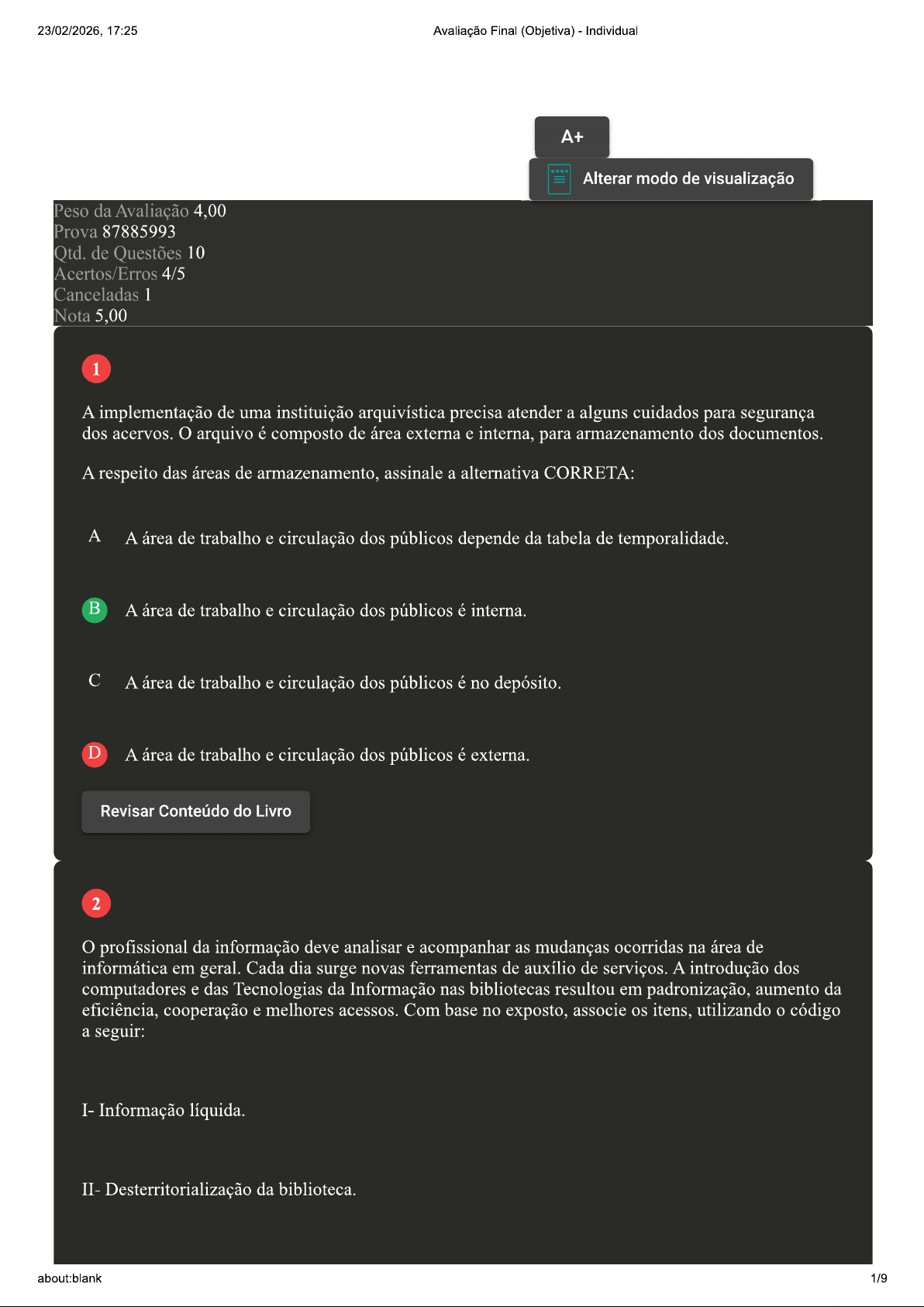 23/02/2026, 17:25 Avaliação Final (Objetiva) Individual A+ Alterar modo de visualização Peso da Avaliação 4,00 Prova 87885993 Qtd. de Questões 10 Acertos/Erros 4/5 Canceladas 1 Nota 5,00 1 A implementação de uma instituição arquivística precisa atender a alguns cuidados para segurança dos acervos. arquivo é composto de área externa e interna, para armazenamento dos documentos. A respeito das áreas de armazenamento, assinale a alternativa CORRETA: A A área de trabalho e circulação dos públicos depende da tabela de temporalidade. A área de trabalho e circulação dos públicos é interna. A área de trabalho e circulação dos públicos é no depósito. D A área de trabalho e circulação dos públicos é externa. Revisar Conteúdo do Livro 2 profissional da informação deve analisar e acompanhar as mudanças ocorridas na área de informática em geral. Cada dia surge novas ferramentas de auxílio de serviços. A introdução dos computadores e das Tecnologias da Informação nas bibliotecas resultou em padronização, aumento da eficiência, cooperação e melhores acessos. Com base no exposto, associe os itens, utilizando o código a seguir: I- Informação líquida. II- Desterritorialização da biblioteca. about:blank 1/923/02/2026, 17:25 Avaliação Final (Objetiva) Individual III- Comunicação assíncrona. IV- Informação colaborativa. ( ) Conceito produzido por Levy, na qual a informação se encontra no hipertexto, no espaço virtual e a biblioteca sendo reconhecida no contexto digital. A ideia é oriunda das publicações do sociólogo Baumam, onde o suporte dos dados, com ampla disponibilidade, é feito digitalmente, de modo atemporal e desmaterializada. Proporciona a interconexão em rede de troca de informações entre vários indivíduos ou equipe, no intuito de auxílio e compartilhamento. Não exige a presença de comunicantes envolvidos em tempo real, conectados a uma rede. Assinale a alternativa que apresenta a sequência CORRETA: A IV II III I. B III I - IV II. II I IV III. D I - III - II IV. Revisar Conteúdo do Livro 3 Os museus são tão antigos quanto a história ocidental. Muitos confundem a edificação com o processo museológico e a própria função da instituição. Neste sentido, a arquitetura tem contribuído para modificar essa noção universal de que museu se resume ao seu prédio e à exposição. Sobre o papel da arquitetura dos museus, assinale a alternativa CORRETA: A arquitetura dos museus, na atualidade, possibilita perceber a comunicação que a instituição visa desenvolver com os seus públicos, mais tradicional ou inovadora. about:blank 2/923/02/2026, 17:25 Avaliação Final (Objetiva) Individual B A arquitetura do museu, nos projetos novos, entende a instituição como uma oportunidade de compreender o classicismo e o preservacionismo. A arquitetura do museu justifica o pensamento local e regional, erigindo sobre a instituição museu a noção de que guarda tesouros num templo consagrado. D A arquitetura dos museus exige solidez, simetria, regularidade, como a própria definição de museu. Revisar Conteúdo do Livro 4 Valentim (2002) apresenta sete passos do processo de inteligência competitiva. Lembramos que inteligência competitiva segundo o que define o autor: "investiga o ambiente externo à organização, bem como diagnostica o ambiente interno organizacional, com o propósito de descobrir oportunidades e reduzir os riscos, visando ao estabelecimento de estratégias de ação a curto, médio e longo prazo". Fonte: VALENTIM, M. L. Inteligência competitiva em organizações: dado, informação e conhecimento. DataGramaZero: Revista de Ciência da Informação, Rio de Janeiro, V. 3 n. 4, ago. 2002. Sobre o assunto inteligência competitiva, ordene os itens a seguir: I- A inteligência competitiva dissemina e transfere os dados, informações e conhecimentos por meio de serviços e produtos para o desenvolvimento competitivo. II- A inteligência competitiva armazena por meio de TI, dados, informações e conhecimentos. III- A inteligência competitiva seleciona e filtra dados, informações e conhecimentos relevantes para as pessoas e organizações. IV- A inteligência competitiva identifica os nichos internos e externos à organização. V- A inteligência competitiva prospecta, acessa e coleta dados, informações e conhecimentos, internos e externos à organização. about:blank 3/923/02/2026, 17:25 Avaliação Final (Objetiva) Individual Assinale a alternativa que apresenta a sequência CORRETA: A IV - V III II I. V III - IV I II. I III V II IV. D III I II IV V. 5 A expressão arquivo é referenciada pela função e pela instituição. No caso da definição institucional, se entende por arquivo um local de custódia e tratamento de documentos em qualquer suporte, recebidos e acumulados em decorrência das atividades-meio e atividades-fim da instituição. A respeito da funcionalidade dos arquivos, assinale a alternativa CORRETA: A Responsáveis pela conservação, preservação e restauro de arquivos permanentes. B Responsáveis pela guarda, preservação e gestão de documentos. Responsáveis pela organização e difusão de peças documentais físicas. D Responsáveis pela aquisição, pesquisa e conservação de arquivos textuais. 6 A derivação de recursos no projeto museológico e museográfico é de extrema relevância para o sucesso do museu. A organização da unidade museológica requer recursos financeiros, materiais e recursos humanos. Sobre os recursos, avalie as asserções a seguir e a relação proposta entre elas: I-O principal impedimento da realização de ações e programas nos museus é a carência de destinação de recursos financeiros, about:blank 4/923/02/2026, 17:25 Avaliação Final (Objetiva) Individual PORQUE II- Segundo o levantamento do IBRAM, a grande maioria dos museus são públicos e não têm verbas próprias, no entanto essa organização administrativa não impede os mus