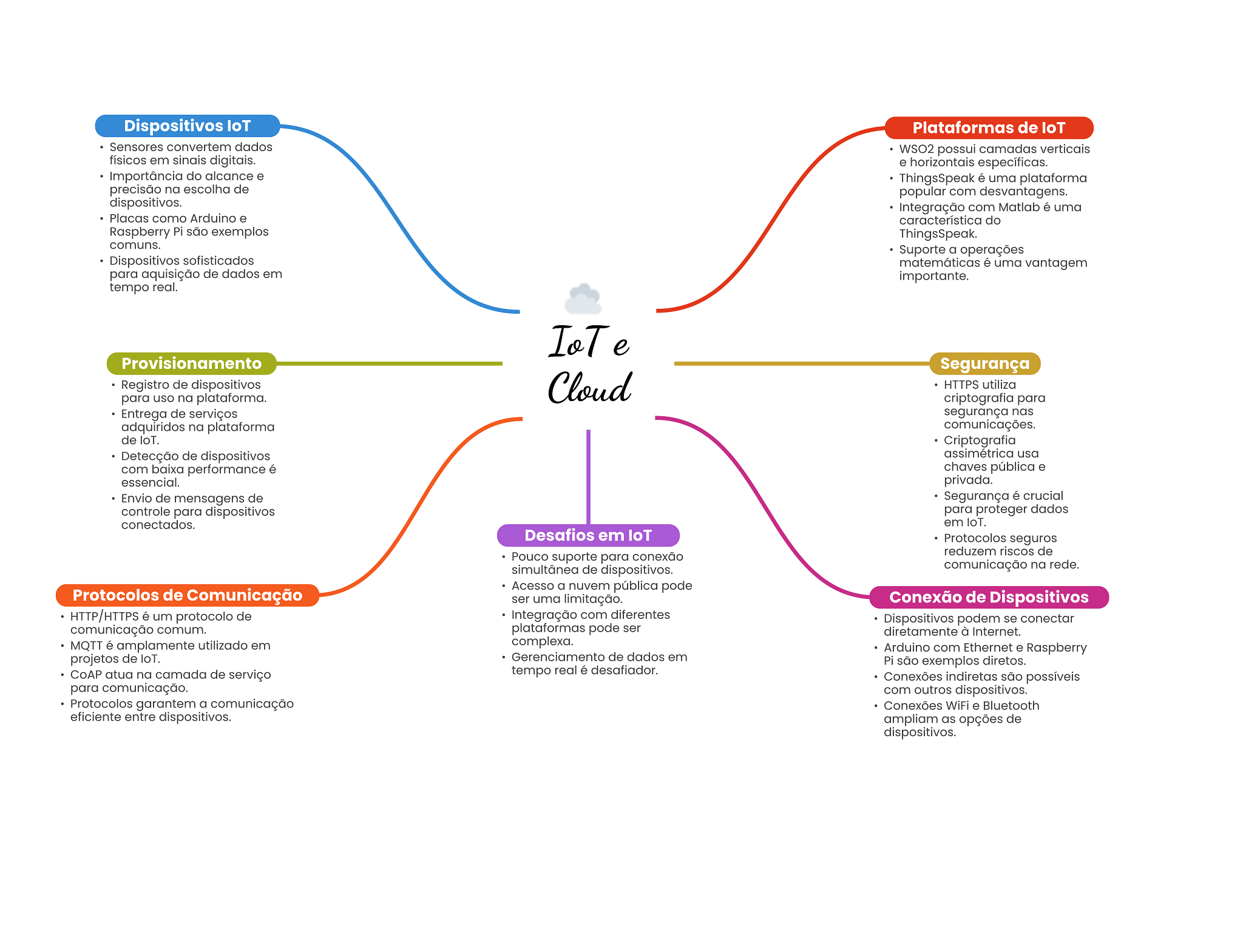 Dispositivos loT Plataformas de loT Sensores convertem dados WSO2 possui camadas verticais físicos em sinais digitais. e horizontais específicas. Importância do alcance e ThingsSpeak é uma plataforma precisão na escolha de popular com desvantagens. dispositivos. Integração com Matlab é uma Placas como Arduino e característica do Raspberry Pi são exemplos ThingsSpeak. comuns. Suporte a operações Dispositivos sofisticados matemáticas é uma vantagem para aquisição de dados em importante. tempo real. IoTe Provisionamento Segurança Registro de dispositivos Cloud HTTPS utiliza para uso na plataforma. criptografia para Entrega de serviços segurança nas adquiridos na plataforma comunicações. de loT. Criptografia Detecção de dispositivos assimétrica usa com baixa performance é chaves pública e essencial. privada. Envio de mensagens de Segurança é crucial controle para dispositivos para proteger dados conectados. em loT. Desafios em loT Protocolos seguros reduzem riscos de Pouco suporte para conexão simultânea de dispositivos. comunicação na rede. Acesso a nuvem pública pode Protocolos de Comunicação ser uma limitação. Conexão de Dispositivos HTTP/HTTPS é um protocolo de Integração com diferentes Dispositivos podem se conectar comunicação comum. plataformas pode ser diretamente à Internet. MQTT é amplamente utilizado em complexa. Arduino com Ethernet e Raspberry projetos de loT. Gerenciamento de dados em Pi são exemplos diretos. CoAP atua na camada de serviço tempo real é desafiador. Conexões indiretas são possíveis para comunicação. com outros dispositivos. Protocolos garantem a comunicação Conexões WiFi e Bluetooth eficiente entre dispositivos. ampliam as opções de dispositivos.