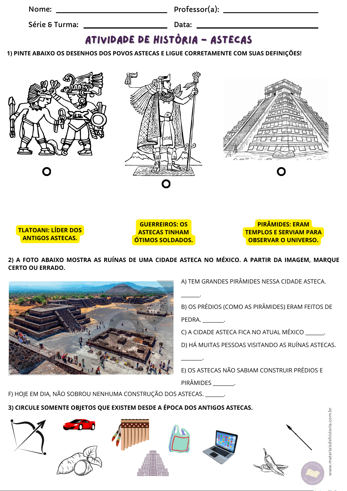 Nome: Série & Turma: Professor(a): Data: 1) PINTE ABAIXO OS DESENHOS DOS POVOS ASTECAS E LIGUE CORRETAMENTE COM SUAS DEFINIÇÕES! A) TEM GRANDES PIRÂMIDES NESSA CIDADE ASTECA. _______. B) OS PRÉDIOS (COMO AS PIRÂMIDES) ERAM FEITOS DE PEDRA. ________. C) A CIDADE ASTECA FICA NO ATUAL MÉXICO _______. D) HÁ MUITAS PESSOAS VISITANDO AS RUÍNAS ASTECAS. ________. E) OS ASTECAS NÃO SABIAM CONSTRUIR PRÉDIOS E PIRÂMIDES ________. 2) A FOTO ABAIXO MOSTRA AS RUÍNAS DE UMA CIDADE ASTECA NO MÉXICO. A PARTIR DA IMAGEM, MARQUE CERTO OU ERRADO. 3) CIRCULE SOMENTE OBJETOS QUE EXISTEM DESDE A ÉPOCA DOS ANTIGOS ASTECAS. F) HOJE EM DIA, NÃO SOBROU NENHUMA CONSTRUÇÃO DOS ASTECAS. _______. TLATOANI: LÍDER DOS ANTIGOS ASTECAS. GUERREIROS: OS ASTECAS TINHAM ÓTIMOS SOLDADOS. PIRÂMIDES: ERAM TEMPLOS E SERVIAM PARA OBSERVAR O UNIVERSO. ATIVIDADE DE HISTÓRIA - ASTECASATIVIDADE DE HISTÓRIA - ASTECAS w w w .m at er ia is d eh is to ri a. co m .b r