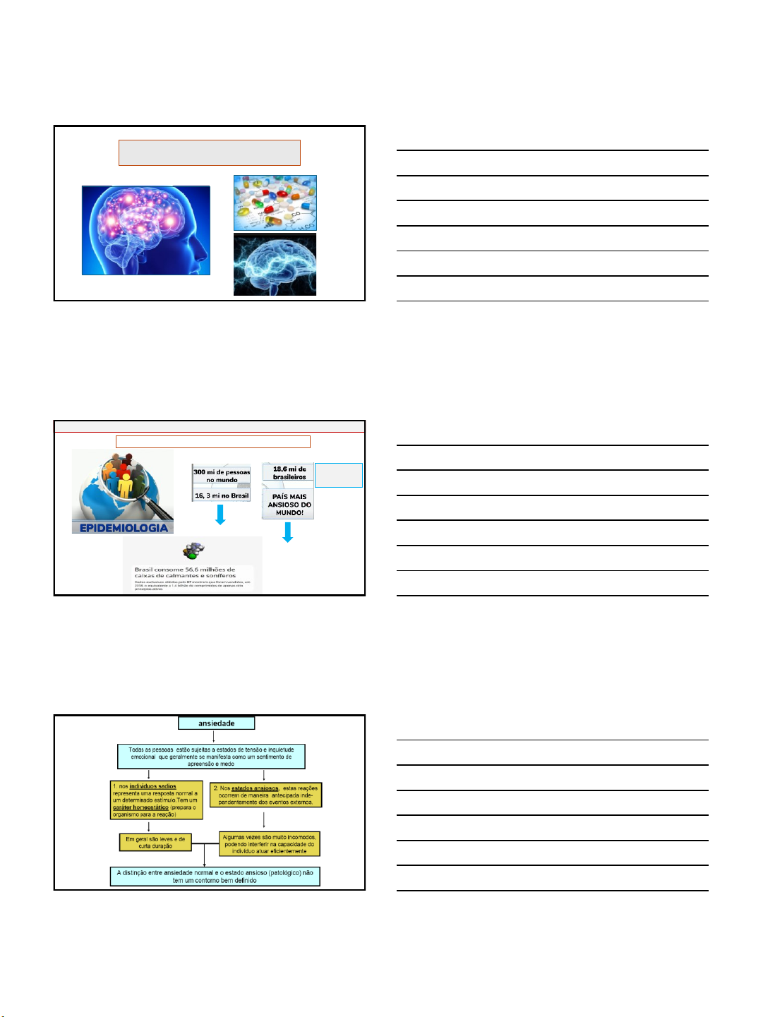 30/03/2025 1 FARMACOLOGIA DO SNC ANSIOLÍTICOS E HIPNÓTICOS Depressão TRANSTORNOS DE ANSIEDADE Ansiedade (OMS, 2021) 264 mi de pessoas no mundo FARMACOLOGIA DO SNC – ANSIOLÍTICOS E HIPNÓTICOS 1 2 3 30/03/2025 2 TRANSTORNO DO PÂNICO ➢ crises súbitas de medo incontrolável associados a sintomas somáticos como sudorese, taquicardia, dores no peito, tremores e sensação de asfixia TRANSTORNOS DE ANSIEDADE TRANSTORNO DA ANSIEDADE GENERALIZADA ➢ Estado constante de ansiedade excessiva que não possui razão ou foco claro FARMACOLOGIA DO SNC – ANSIOLÍTICOS E HIPNÓTICOS FOBIAS ESPECÍFICAS ➢ Temor específico e persistente relacionado a um determinado objeto ou situação, que não seja situação de exposição pública ou medo de ter um ataque de pânico ➢ Os tipos mais comuns são: medo desencadeado por animais, ambiente natural como tempestades, situacional por medo de voar, e medo de agulhas, de ver sangue TRANSTORNOS DE ANSIEDADE FARMACOLOGIA DO SNC – ANSIOLÍTICOS E HIPNÓTICOS FOBIA SOCIAL ➢ Os sintomas de ansiedade ocorrem em situações nas quais a pessoa é observada pelos outros. ➢ Situações típicas compreendem: escrever, assinar, comer e fazer uma apresentação na presença dos outros TRANSTORNOS DE ANSIEDADE AGORAFOBIA ➢ Grave ansiedade com respeito a estar em situações das quais parece difícil ou embaraçoso escapar em caso de mal-estar ou crise de pânico. ➢ O paciente passa a evitar determinadas situações ou locais por causa do medo de sofrer um ataque FARMACOLOGIA DO SNC – ANSIOLÍTICOS E HIPNÓTICOS 4 5 6 30/03/2025 3 TRANSTORNO OBSESSIVO- COMPULSIVO ➢ Comportamentos com rituais compulsivos dominado por ansiedade irracional, p. ex. medo de contaminação, lavar as mãos repetidamente, contar/verificar) TRANSTORNOS DE ANSIEDADE TRANSTORNO DO ESTRESSE PÓS-TRAUMÁTICO ➢ Ansiedade desencadeada por lembrança de experiências estressantes passadas FARMACOLOGIA DO SNC – ANSIOLÍTICOS E HIPNÓTICOS SINTOMAS TRANSTORNOS DE ANSIEDADE FARMACOLOGIA DO SNC – ANSIOLÍTICOS E HIPNÓTICOS Estabilizadores do Humor Lítio (Carbolitium®) FARMACOLOGIA DO SNC – ANSIOLÍTICOS E HIPNÓTICOS 7 8 9 30/03/2025 4 REGULAÇÃO DA RESPOSTA AO ESTRESSE • Na ansiedade, há hiperativação da amígdala e de estruturas por esta inervadas (hipotálamo, córtex pré- frontal e hipocampo). • Tal disfunção acarreta a hiperatividade do eixo hipotálamo-hipófise-suprarrenal. ETIOPATOGENIA DA ANSIEDADE Fatores psicossociais + ambientais + pré-disposição genética + disfunções neurobiológicas. ✓ Deficiência na transmissão da sinapse gabaérgica (GABA); ✓ Hiperatividade dos sistemas adrenérgicos (NA); ✓ Desregulação dos sistemas serotoninérgicos (5-HT). TRANSTORNOS DE ANSIEDADE FARMACOLOGIA DO SNC – ANSIOLÍTICOS ABORDAGEM TERAPÊUTICA ➢ Benzodiazepínicos ➢ Antidepressivos: ISRS E IRSN ➢ Buspirona ➢ Beta-bloqueadores TRANSTORNOS DE ANSIEDADE FARMACOLOGIA DO SNC – ANSIOLÍTICOS 10 11 12 30/03/2025 5 GABA (ÁCIDO GAMA AMINOBUTÍRICO) FARMACOLOGIA DO SNC – ANSIOLÍTICOS GABA (ÁCIDO GAMA AMINOBUTÍRICO) • Principal neurotransmissor inibitório do SNC • Receptores GABAA (IONOTRÓPICO) e GABAB (METABOTRÓPICO) • Receptor GABAA – (família de receptores) pós-sinápticos e medeiam inibição pós-sináptica o Associados a canais de Cl- hiperpolarização o Participa dos efeitos dos benzodiazepínicos (ansiedade) e barbitúricos (epilepsia). FARMACOLOGIA DO SNC – ANSIOLÍTICOS BENZODIAZEPÍNICOS FARMACOLOGIA DO SNC – ANSIOLÍTICOS 13 14 15 30/03/2025 6 BENZODIAZEPÍNICOS FARMACOLOGIA DO SNC – ANSIOLÍTICOS BENZODIAZEPÍNICOS MODULADORES ALOSTÉRICOS POSITIVOS DOS RECEPTORES GABA-A Fonte: https://repositorio.ul.pt/bitstream/10451/43304/1/MICF_Francisco_Lopes.pdf DIAZEPAM OXAZEPAM LORAZEPAM ALPRAZOLAM TRIAZOLAM CLORDIAZPÓXIDO FARMACOLOGIA DO SNC – ANSIOLÍTICOS Atuam em sítios alostéricos dos receptores GABAA do SNC, aumentando a afinidade do GABA pelo receptor e facilitando a abertura dos canais de Cl- HIPERPOLARIZAÇÃO PPSIReceptor ionotrópico BENZODIAZEPÍNICOS – MECANISMO DE AÇÃO FARMACOLOGIA DO SNC – ANSIOLÍTICOS 16 17 18 30/03/2025 7 BENZODIAZEPÍNICOS – FARMACOCINÉTICA • Bem absorvidos por via oral; • Altamente lipossolúveis; • Alta taxa de ligação às proteínas plasmáticas; • Biotransformação: principalmente no fígado, através da atividade das enzimas da família do Citocromo P450 (CYP450), PRINCIPALMENTE A isoforma CYP3A4; • Metabólitos ativos. FARMACOLOGIA DO SNC – ANSIOLÍTICOS MIDAZOLAM BENZODIAZEPÍNICOS – FARMACOCINÉTICA FARMACOLOGIA DO SNC – ANSIOLÍTICOS INJETÁVEL COMPRIMIDOS BENZODIAZEPÍNICOS - FARMACOCINÉTICA METABOLISMO FARMACOLOGIA DO SNC – ANSIOLÍTICOS 19 20 21 30/03/2025 8 BENZODIAZEPÍNICOS - FARMACOCINÉTICA FARMACOLOGIA DO SNC – ANSIOLÍTICOS Fonte: Adaptado de Rang & Dale: Farmacologia / H. P. Rang ... [et. al.]. 8. ed. - Rio de Janeiro : Elsevier, 2016. BENZODIAZEPÍNICOS Fonte: https://repositorio.ul.pt/bitstream/10451/43304/1/MICF_Francisco_Lopes.pdf FARMACOLOGIA DO SNC – ANSIOLÍTICOS • Sedativo-hipnótico • Tranquilizante-ansiolítico ( agressividade) • Relaxante muscular ( tônus e coordenação) • Anticonvulsivante • Indução de amnésia anterógrada BENZODIAZEPÍNICOS – EFEITOS FARMACOLÓGICOS FARMACOLOGIA DO SNC – ANSIOLÍTICOS 22 23 24 30/03/2025 9 • Todos apresentam atividade anticonvulsivante. • Há evidências de que o Clonazepam é relativamente mais eficaz como anticonvulsivante. • O Diazepam intravenoso é eficaz no bloqueio das convulsões. BENZODIAZEPÍNICOS – EFEITOS FARMACOLÓGICOS FARMACOLOGIA DO SNC – ANSIOLÍTICOS • Hipnóticos: fármacos cuja ação principal é induzir o sono e manter o sono. • Induzem a um estado de consciência semelhante, mas não idêntico ao sono fisiológico, do qual o indivíduo pode ser acordado. BENZODIAZEPÍNICOS – EFEITOS FARMACOLÓGICOS FARMACOLOGIA DO SNC 