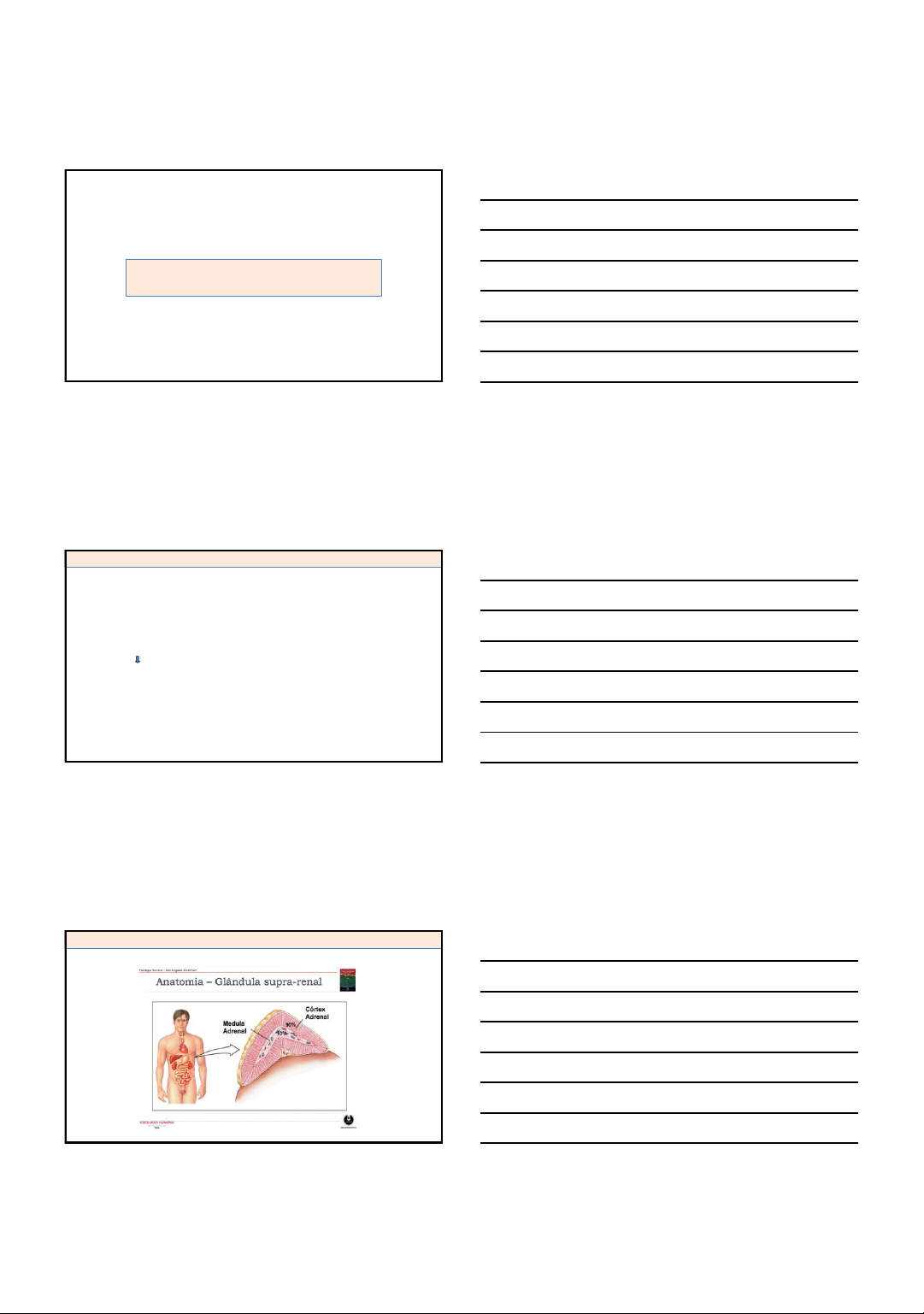 03/03/2025 1 ANTI-INFLAMATÓRIOS ESTEROIDES GLICOCORTICOIDES ➢ Potentes anti-inflamatórios e imunossupressores ➢ Respostas autoimune, alérgicas, rejeição do enxerto ➢ Derivados dos hormônios esteroides ANTI-INFLAMATÓRIOS ESTEROIDAIS (AIEs) ANTI-INFLAMATÓRIOS ESTEROIDAIS (AIEs) 1 2 3 03/03/2025 2 • Córtex adrenal: secreta os esteroides da suprarrenal: glicocorticoides, mineralocorticoides e androgênios • Medula adrenal: secreta catecolaminas (adrenalina/epinefrina) GLÂNDULAS SUPRARRENAIS OU ADRENAIS ANTI-INFLAMATÓRIOS ESTEROIDAIS (AIEs) HORMÔNIOS ESTEROIDES • Glicocorticoides (principal hormônio Cortisol): afeta metabolismo de carboidratos e proteínas, regula reações endógenas de defesa, tem ação anti-inflamatória e imunossupressora • Mineralocorticoides (principal hormônio Aldosterona): regula balanço hídrico e eletrolítico (retenção de Na+ pelos rins retenção de água no corpo e pressão arterial • Esteroides sexuais (andrógenos) ANTI-INFLAMATÓRIOS ESTEROIDAIS (AIEs) • Regulam a transcrição gênica • fatores de transcrição ativados por ligantes • Traduzem os sinais através da modificação da transcrição gênica ANTI-INFLAMATÓRIOS ESTEROIDAIS (AIEs) HORMÔNIOS ESTEROIDES 4 5 6 03/03/2025 3 • CORTISOL: muito potente - 95% da atividade glicocorticóide • CORTICOSTERONA (4% da atividade glicocorticóide total - menos potente que o cortisol) HORMÔNIOS GLICOCORTICOIDES ANTI-INFLAMATÓRIOS ESTEROIDAIS (AIEs) GLICOCORTICÓIDES • São sintetizados e liberados de acordo com as necessidades, sob influência do ACTH (hormônio adrenocorticotrófico ou corticotrofina), secretado pela adeno-hipófise • O fator liberador de corticotrofina (CRF) do hipotálamo regula liberação de ACTH • Efeito de retroalimentação (feedback) negativa dos glicocorticoides plasmáticos Taxa de cortisol: inibe liberação Taxa de cortisol: ativa liberação HORMÔNIOS GLICOCORTICOIDES - SÍNTESE E LIBERAÇÃO ANTI-INFLAMATÓRIOS ESTEROIDAIS (AIEs) • Estresse físico e emocional, fome, dor, calor ou frio excessivo, lesão, infecção: estimulam a liberação de cortisol • Ritmo circadiano: concentração sanguínea mais elevada no início da manhã ANTI-INFLAMATÓRIOS ESTEROIDAIS (AIEs) HORMÔNIOS GLICOCORTICOIDES - SÍNTESE E LIBERAÇÃO 7 8 9 03/03/2025 4 ANTI-INFLAMATÓRIOS ESTEROIDAIS (AIEs) ANTI-INFLAMATÓRIOS ESTEROIDAIS (AIEs) CÓRTEX ADRENAL TECIDO ADIPOSO TRIGLICERÍDEOS MÚSCULOS PROTEÍNAS FÍGADO ÁCIDOS GRAXOS LIVRES ACETIL -CoA ÁCIDO PIRÚVICO AMINOÁCIDOS AMINO ÁCIDOS GLICOSECORPOS CETÔNIC OS ÁCIDOS GRAXOS LIVRES SANGUE GLICOSECORPOS CETÔNICOS GLICOCORTICOIDES (CORTISOL) GLICOCORTICOIDES E METABOLISMO 10 11 12 03/03/2025 5 • Adaptação ao jejum prolongado ➢ Sua presença é crítica para a sobrevivência durante ao jejum prolongado ➢ Aumenta a ingestão de alimento ➢ Estimula a liberação de NPY-AgRP por neurônios do núcleo arqueado do hipotálamo GLICOCORTICOIDES – AÇÕES FISIOLÓGICAS ANTI-INFLAMATÓRIOS ESTEROIDAIS (AIEs) FOSFOLIPÍDEOS DE MEMBRANAS ÁCIDO ARAQUIDÔNICO FOSFOLIPASE A2 Prostaglandinas Tromboxano (TXA2) Prostaciclina (PGI2) Leucotrienos (LTB4, LTC4, LTD4, LTE4) CICLOXIGENASE LIPOXIGENASE ANTI-INFLAMATÓRIOS ESTEROIDAIS (AIEs) GLICOCORTICOIDES - INFLAMAÇÃO • Síntese e liberação aumentada de lipocortina (anexina-1), que tem efeitos anti- inflamatórios potentes nas células e na liberação de mediadores • Inibição da transcrição dos genes da COX-2 (produção reduzida de prostanóides),citocinas (IL e TNF) • expressão de moléculas de adesão (inibe migração de células inflamatórias) • da liberação de histamina • redução da produção de Ig ANTI-INFLAMATÓRIOS ESTEROIDAIS (AIEs) GLICOCORTICOIDES - INFLAMAÇÃO 13 14 15 03/03/2025 6 ➢ Estabilização de lisossomos ➢ Inibição da diferenciação e proliferação de mastócitos ➢ Inibição do recrutamento de leucócitos circulantes ANTI-INFLAMATÓRIOS ESTEROIDAIS (AIEs) GLICOCORTICOIDES – SISTEMA IMUNOLÓGICO ➢ Reduz a aderência dos leucócitos ao endotélio capilar ➢ Inibe a produção e a ligação dos peptídeos quimiotáticos aos seus receptores ➢ Reduz a atividade fagocítica e bactericida dos neutrófilos ➢ Inibe a proliferação de fibroblastos e a síntese e deposição de fibrilas ANTI-INFLAMATÓRIOS ESTEROIDAIS (AIEs) GLICOCORTICOIDES – INFLAMAÇÃO E SISTEMA IMUNOLÓGICO • Suprime as respostas do sistema imune a substâncias estranhas ➢ Reduz a produção de citocinas primárias IL-1Beta e TNF-alfa ➢ Reduz por apoptose o número de linfócitos circulantes derivados do timo (células T), especialmente os linfócitos T helper tipo 1 ANTI-INFLAMATÓRIOS ESTEROIDAIS (AIEs) GLICOCORTICOIDES – INFLAMAÇÃO E SISTEMA IMUNOLÓGICO 16 17 18 03/03/2025 7 • Exposição prévia ao cortisol é requerida para permitir o efeito vasoconstritor das catecolaminas e angiotensina II. • Na ausências de cortisol pode acontecer o choque circulatório. • O cortisol é necessário para a manutenção da pressão arterial normal. ANTI-INFLAMATÓRIOS ESTEROIDAIS (AIEs) GLICOCORTICOIDES - RESPOSTA VASCULAR ÀS CATECOLAMINAS • Estímulos estressores causam um aumento na secreção de CRH, ACTH e cortisol • Quando não ocorre a elevação nos níveis plasmáticos de cortisol em reposta ao estímulo nocivo a sobrevivência fica ameaçada ANTI-INFLAMATÓRIOS ESTEROIDAIS (AIEs) GLICOCORTICOIDES – ESTRESSE ➢ Suprime síntese protéica e de colágeno ➢ Estimula a produção de fibronectina e elastina ANTI-INFLAMATÓRIOS ESTEROIDAIS (AIEs) GLICOCORTICOIDES – TECIDO CONJUNTIVO 19 20 21 03/03/2025 8 • Modulação de : ➢ Sono ➢ Humor ➢ Cognição ➢ Sensibilidade ANTI-INFLAMATÓRIOS ESTEROIDAIS (AIEs) GLICOCORTICOIDES – SISTEMA NERVOSO CENTRAL ANTI-INFLAMATÓRIOS ESTEROIDAIS (AIEs) GLICOCORTICOIDES – SÍNDROME DE CUSHING AIEs – Mecanismo de Ação Induzem a anexina-1 22 23 24 03/03/202
