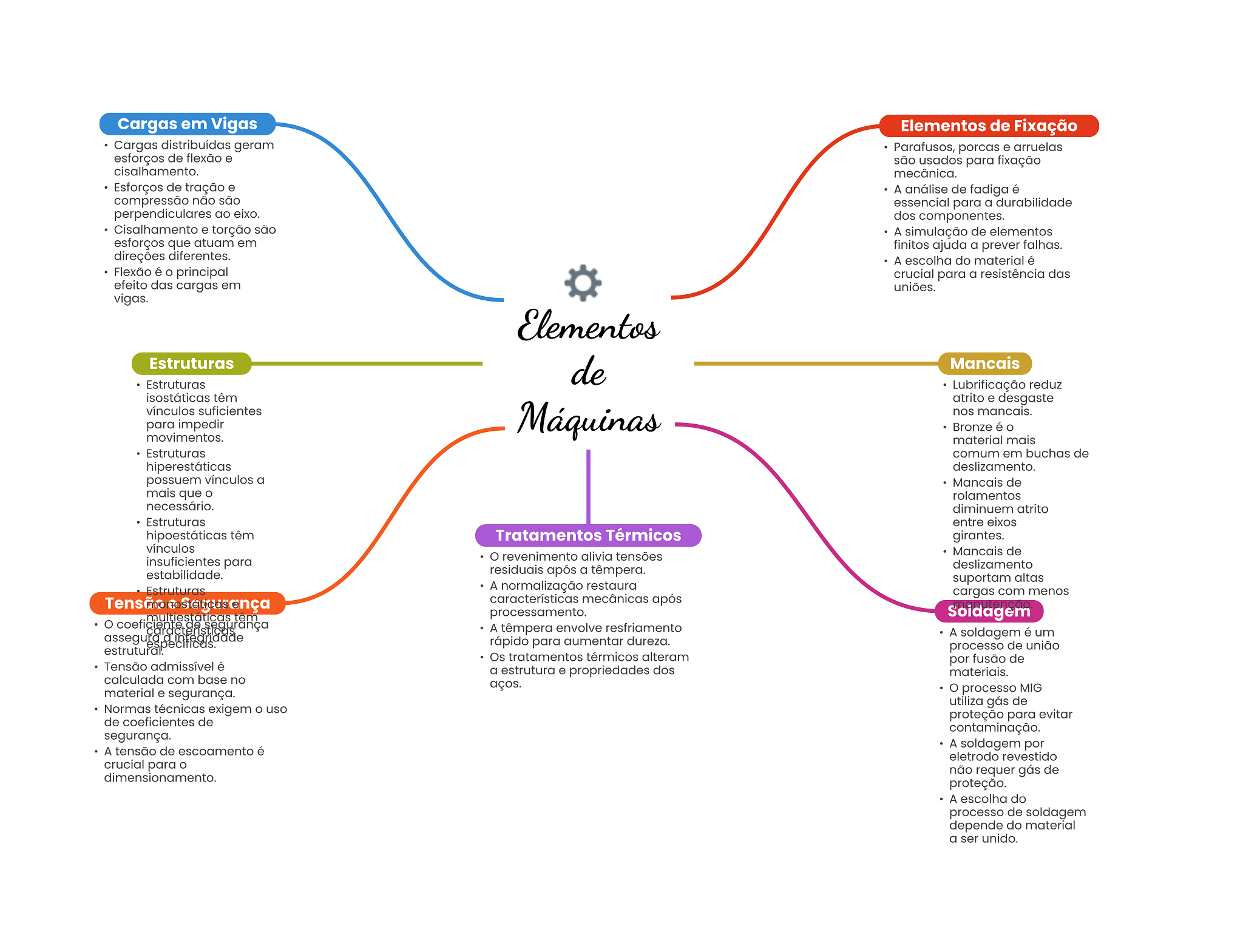 Cargas em Vigas Elementos de Fixação Cargas distribuídas geram Parafusos, porcas e arruelas esforços de flexão e são usados para fixação cisalhamento. mecânica. Esforços de tração e A análise de fadiga é compressão não são essencial para a durabilidade perpendiculares ao eixo. dos componentes. Cisalhamento e torção são A simulação de elementos esforços que atuam em finitos ajuda a prever falhas. direções diferentes. A escolha do material é Flexão é O principal crucial para a resistência das efeito das cargas em uniões. vigas. Elementos Estruturas de Mancais Estruturas Lubrificação reduz isostáticas têm atrito e desgaste vínculos suficientes para impedir Máquinas nos mancais. Bronze é o movimentos. material mais Estruturas comum em buchas de hiperestáticas deslizamento. possuem vínculos a Mancais de mais que rolamentos necessário. diminuem atrito Estruturas entre eixos hipoestáticas têm Tratamentos Térmicos girantes. vínculos revenimento alivia tensões Mancais de insuficientes para estabilidade. residuais após a têmpera. deslizamento suportam altas Estruturas A normalização restaura cargas com menos Tensão características mecânicas após multiestáticas têm processamento. Soidagem A têmpera envolve resfriamento assegura integridade A soldagem é um rápido para aumentar dureza. estrutural. processo de união Os tratamentos térmicos alteram por fusão de Tensão admissível é a estrutura e propriedades dos materiais. calculada com base no aços. material e segurança. processo MIG utiliza gás de Normas técnicas exigem uso proteção para evitar de coeficientes de contaminação. segurança. A soldagem por A tensão de escoamento é eletrodo revestido crucial para dimensionamento. não requer gás de proteção. A escolha do processo de soldagem depende do material a ser unido.