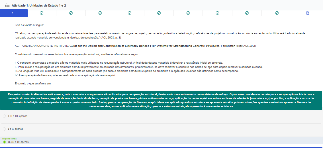 Atividade 1: Unidades de Estudo 1 e 2 1 Leia excerto a seguir: "O reforço ou recuperação de estruturas de concreto existentes para resistir aumento de cargas de projeto, perda de força devido a deterioração, deficiências de projeto ou construção, ou ainda aumentar a ductilidade é tradicionalmente realizado usando materiais convencionais e técnicas de construção." (ACI, p. 3) ACI AMERICAN CONCRETE INSTITUTE Guide for the Design and Construction of Externally Bonded FRP Systems for Strengthening Concrete Farmington 2008. Considerando excerto apresentado sobre a recuperação estrutural, analise as afirmativas a seguir: concreto, argamassa e madeira são os materiais mais utilizados na recuperação estrutural. A finalidade desses materiais devolver a resistência inicial ao 11. Para iniciar a recuperação de um elemento estrutural proveniente da corrosão das se deve remover concreto nas barras de aço para depois remover a camada Ao longo da vida a medida e comportamento de cada produto (no caso elemento estrutural) exposto ao ambiente e a ação dos usuários são definidos como desempenho. IV. A recuperação de fissuras pode ser realizada com a aplicação de resina É correto que se afirma em: Resposta correta. A alternativa está correta, pois concreto e a argamassa são utilizados para recuperação estrutural, destacando encamisamento como sistema de reforço. processo considerado correto para a recuperação se inicia com a remoção do concreto nas barras, seguida da remoção do oxido de ferro, remoção da poeira nas barras, pintura anticorrosiva no aço, aplicação da resina em ambas as faces de (concreto e aço) e, por fim, a aplicação e a cura do concreto. A definição de desempenho como exposta no enunciado. Assim, para a recuperação de fissuras, epoxi deve ser aplicado quando a estrutura se apresenta retraida, pois em situações quentes a estrutura apresenta fissuras de menores escalas, ao ser aplicada nessa situação, quando a estrutura retrair, ela apresentará novamente as trincas. II I II, apenas. Resposta correta apenas.