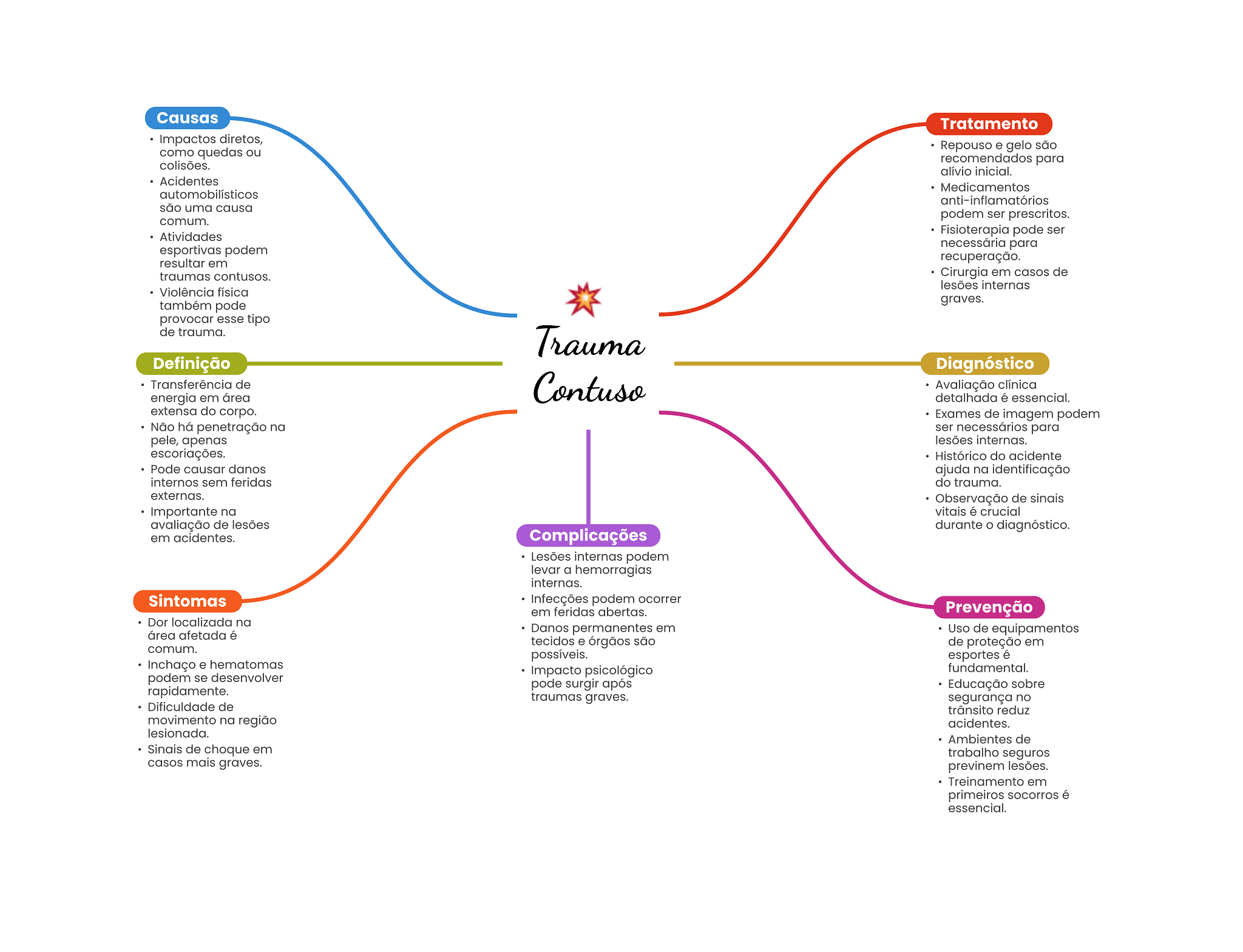 Causas Tratamento Impactos diretos, como quedas ou Repouso e gelo são colisões. recomendados para alívio inicial. Acidentes Medicamentos automobilísticos anti-inflamatórios são uma causa podem ser prescritos. comum. Atividades Fisioterapia pode ser esportivas podem necessária para resultar em recuperação. traumas contusos. Cirurgia em casos de lesões internas Violência física também pode graves. provocar esse tipo de trauma. Trauma Definição Diagnóstico Transferência de energia em área Contuso Avaliação clínica detalhada é essencial. extensa do corpo. Exames de imagem podem Não há penetração na ser necessários para pele, apenas lesões internas. escoriações. Histórico do acidente Pode causar danos ajuda na identificação internos sem feridas do trauma. externas. Observação de sinais Importante na vitais é crucial avaliação de lesões durante diagnóstico. em acidentes. Complicações Lesões internas podem levar a hemorragias internas. Sintomas Infecções podem ocorrer em feridas abertas. Prevenção Dor localizada na área afetada é Danos permanentes em Uso de equipamentos tecidos e órgãos são de proteção em comum. possíveis. esportes é Inchaço e hematomas Impacto psicológico fundamental. podem se desenvolver rapidamente. pode surgir após Educação sobre traumas graves. segurança no Dificuldade de trânsito reduz movimento na região acidentes. lesionada. Ambientes de de choque em trabalho seguros casos mais graves. previnem lesões. Treinamento em primeiros socorros é essencial.