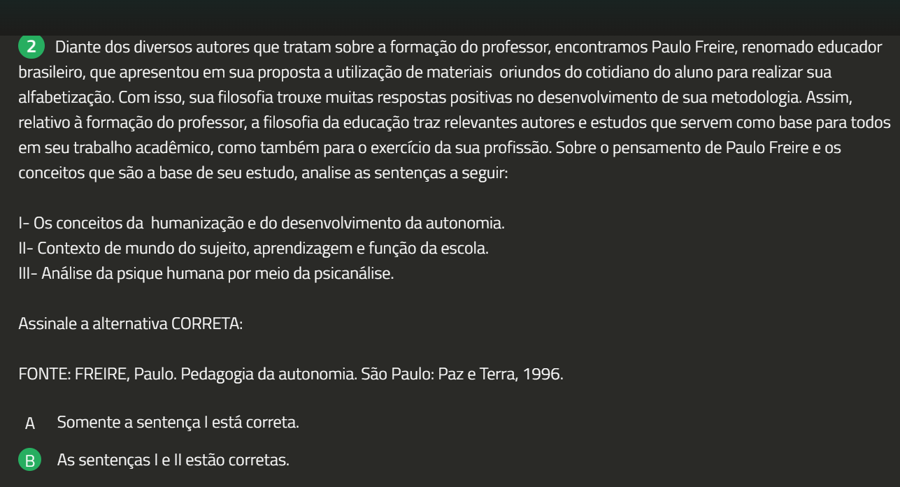 2 Diante dos diversos autores que tratam sobre a formação do professor, encontramos Paulo Freire, renomado educador brasileiro, que apresentou em sua proposta a utilização de materiais oriundos do cotidiano do aluno para realizar sua alfabetização. Com isso, sua filosofia trouxe muitas respostas positivas no desenvolvimento de sua metodologia. Assim, relativo à formação do professor, a filosofia da educação traz relevantes autores e estudos que servem como base para todos em seu trabalho acadêmico, como também para 0 exercício da sua profissão. Sobre 0 pensamento de Paulo Freire e conceitos que são a base de seu estudo, analise as sentenças a seguir: I- Os conceitos da humanização e do desenvolvimento da autonomia. II- Contexto de mundo do sujeito, aprendizagem e função da escola. III- Análise da psique humana por meio da psicanálise. Assinale a alternativa CORRETA: FONTE: FREIRE, Paulo. Pedagogia da autonomia. São Paulo: Paz e Terra, 1996. A Somente a sentença está correta. As sentenças e estão corretas.