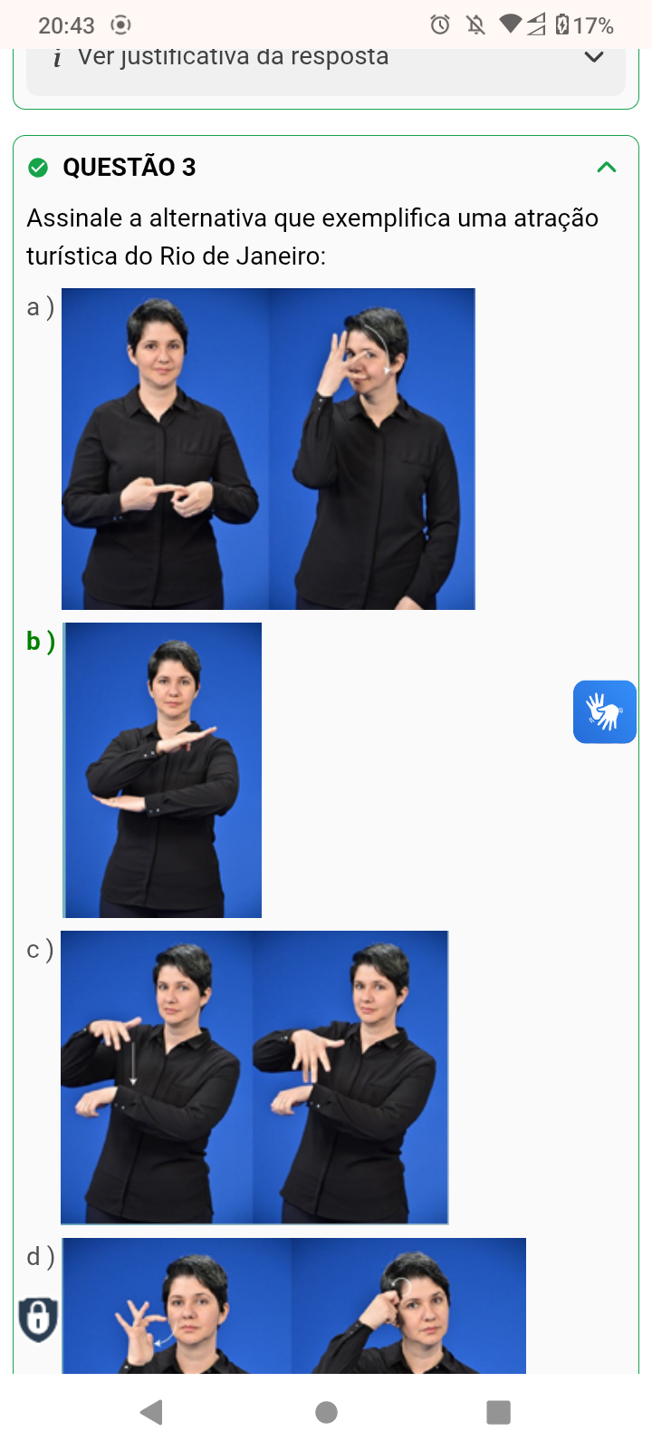 20:43 i justificativa da resposta QUESTÃO 3 Assinale a alternativa que exemplifica uma atração turística do Rio de Janeiro: a) b) c) d)