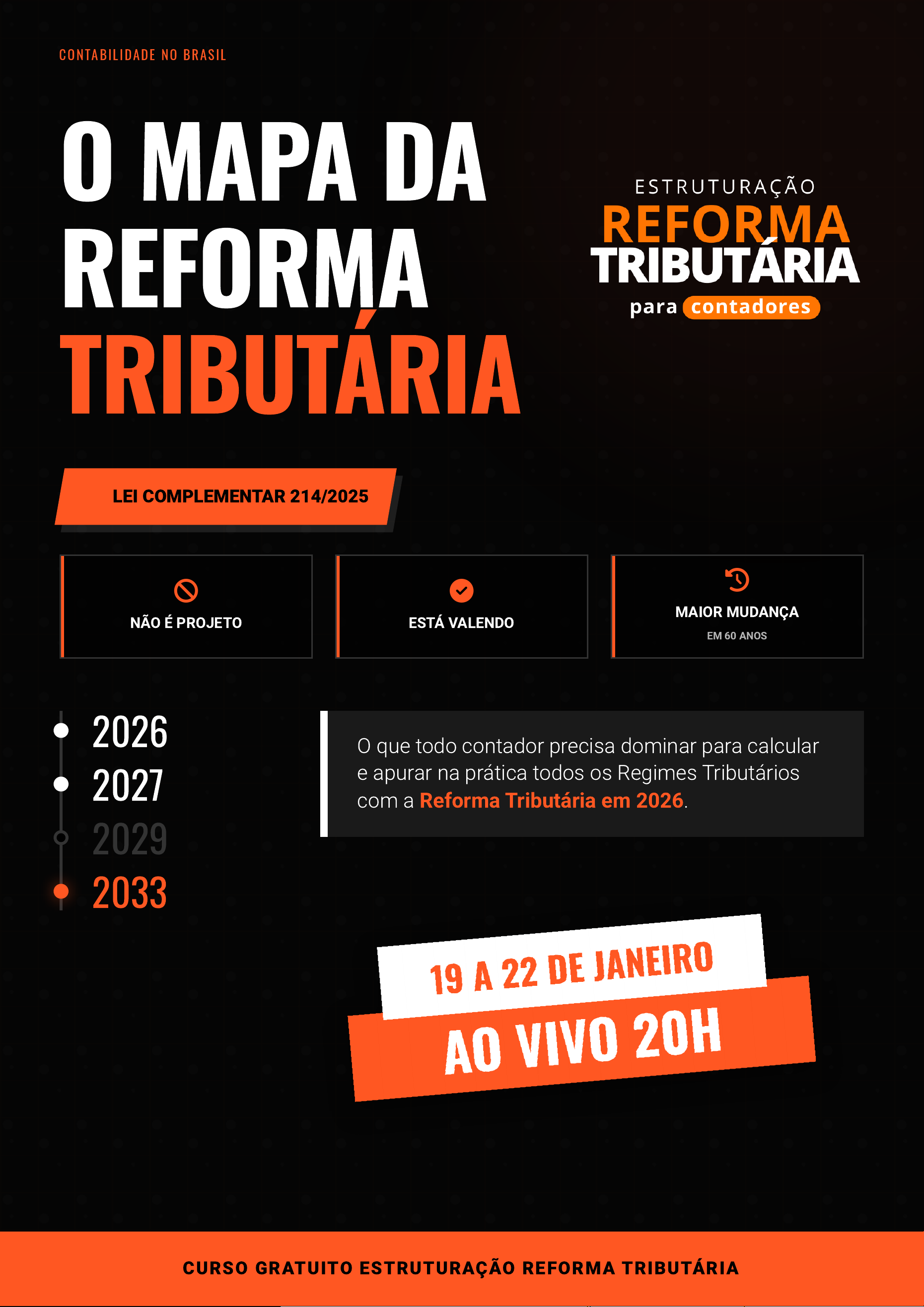 ⚠ LEI COMPLEMENTAR 214/2025 NÃO É PROJETO ESTÁ VALENDO MAIOR MUDANÇA EM 60 ANOS O que todo contador precisa dominar para calcular e apurar na prática todos os Regimes Tributários com a Reforma Tributária em 2026. 2026 2027 2029 2033 O MAPA DA REFORMA TRIBUTÁRIA CONTABIL IDADE NO BRAS IL CURSO GRATUITO ESTRUTURAÇÃO REFORMA TRIBUTÁRIA CONTABILIDADE NO BRASIL O MAPA DA REFORMA TRIBUTÁRIA O que todo contador precisa saber antes que 2026 vire 2027 E enquanto você lê isso, a maior mudança tributária dos últimos 60 anos já começou a rodar. O sistema que você conhece — ICMS, ISS, PIS, COFINS — tem data pra morrer. E junto com ele, morre um jeito inteiro de fazer contabilidade. Você pode achar a reforma boa. Pode achar ruim. Pode ter votado em quem aprovou ou em quem criticou. Nada disso importa. O que importa é o que você vai fazer com essa informação. LC 214/2025 A Lei Complementar 214/2025 foi publicada. Não é projeto. Não é proposta. Não é "pode ser que aconteça". Está valendo. ARTHUR GONÇALVES “ ESTE É O MAPA. Ele mostra o terreno. Mostra onde estão os perigos. Mostra o que você precisa saber que ainda não sabe. E se ao terminar de ler você sentir que está atrasado... respira. A diferença é que agora você tem um mapa na mão. VAMOS? → "Eu sei que tem contador lendo isso agora pensando: 'Isso é exagero. Todo ano tem mudança. Eu me viro.' Eu entendo, mas dessa vez é diferente. Não é uma nova obrigação acessória. Não é ajuste de alíquota. É o sistema inteiro sendo substituído. E o contador que tratar isso como 'mais uma mudança' vai descobrir tarde demais que era A mudança." E TA PA 1 : D I A G N Ó S T I C O O QUE VOCÊ PRECISA SABER FAZER EM 2026 Antes de entrar no mapa, um teste rápido. Olha essa lista. Seja honesto consigo mesmo. já i ê d h d á i CCLASSTRIB Classificar todos os produtos e serviços dos seus clientes na nova codificação tributária. Sem isso, não existe cálculo correto de IBS e CBS. REPRECIFICAÇÃO E CÁLCULO DE MARKUP Ajudar seu cliente a recalcular a formação de preço. A estrutura de custos muda com a reforma. O markup que funcionava antes pode não funcionar mais. DIAGNÓSTICO DE IMPACTOS Mapear, cliente por cliente, onde ele ganha e onde ele perde com o novo sistema. PLANEJAMENTO TRIBUTÁRIO Avaliar se o regime atual (Simples, Presumido, Real) ainda faz sentido depois da reforma — ou se a conta mudou. ANÁLISE DE IMPACTOS (B2B VS B2C) Empresas do Simples que vendem para outras empresas vão sofrer pressão. O cliente PJ vai querer comprar de quem gera crédito. SIMULAÇÃO DE FLUXO DE CAIXA (SPLIT PAYMENT) Mostrar ao cliente que o dinheiro do imposto não passa mais pela conta dele. O caixa que ele conhece vai mudar. QUANTOS DESSES VOCÊ DOMINA DE VERDADE? Se a resposta te incomodou, significa que você não é do tipo que finge que está tudo bem. Significa que você quer ser referência, não ser apenas mais um. SUA JORNADA PELA REFORMA TRIBUTÁRIA LEI COMPLEMENTAR 214/2025 LAT: -23.55 LON: -46.63 ESTRUTURAÇÃO REFORMA TRIBUTÁRIA, AO VIVO DOS DIAS 19 AO DIA 22 DE JANEIRO ÀS 20H SIMPLES NAC. 12 LUCRO PRESUMIDO 13 LUCRO REAL 14 TRIBUTAÇÃO LUCROS 15 LEGENDA DO MAPA Conceito Base Mecanismo Setor Específico Impacto Pessoal CHECKLIST 1 IBS E CBS ⚖ 2 TRIB. POR FORA 3 NÃO CUMULATIVIDADE 4 LOCAL OPERAÇÃO 5 SPLIT PAYMENT 6 ALÍQUOTAS % 7 PRODUTOR RURAL 8 IMÓVEIS 9 TRANSPORTADORA ⛟ 10 AUTÔNOMO 11 ESTRUTURAÇÃO DA REFORMA TRIBUTÁRIA E TA PA 2 : C O N C E I T O S B A S E IBS E CBS: O NOVO SISTEMA "Se você ainda está esperando pra ver se 'isso vai pegar', deixa eu te contar: a CBS começa a ser cobrada em 2026. Não em 2027. Não em 2029. Em 2026. Com alíquota de teste, sim. Mas já exigindo que sua estrutura esteja pronta. O jogo já começou." ARTHUR GONÇALVES ” O Brasil adotou um modelo de IVA Dual. Na prática, são dois tributos novos que substituem cinco antigos. CBS FEDERAL Contribuição sobre Bens e Serviços. Substitui PIS e COFINS. IBS EST/MUN Imposto sobre Bens e Serviços. Substitui ICMS e ISS. Mesma base de cálculo. Mesmas regras. Duas guias. O QUE MUDA NA PRÁTICA Você vai deixar de calcular cinco tributos com regras diferentes para calcular dois tributos com regras iguais. Parece mais simples. Mas a transição é onde mora o perigo. ESTRUTURAÇÃO DA REFORMA TRIBUTÁRIA ESTRUTURAÇÃO REFORMA TRIBUTÁRIA, AO VIVO DOS DIAS 19 AO DIA 22 DE JANEIRO ÀS 20H E TA PA 3 : F O R M A Ç Ã O D E P R E Ç O TRIBUTAÇÃO POR FORA: A CONTA QUE NINGUÉM ESTÁ FAZENDO Hoje, PIS, COFINS, ICMS e ISS são calculados "por dentro". O imposto está embutido no preço. Você olha o valor do produto e o tributo já está ali, escondido. Com IBS e CBS, a lógica inverte. A tributação passa a ser "por fora". O imposto é calculado sobre o preço e somado a ele. Igual funciona nos Estados Unidos, na Europa, em quase todo lugar. → SISTEMA ATUAL Imposto EMBUTIDO (Por dentro) REFORMA (IBS/CBS) Preço + Imposto (Por fora) O QUE MUDA NA PRÁTICA O preço de venda que seu cliente pratica hoje vai parecer maior amanhã. Mesmo que a carga tributária seja igual. Isso afeta percepção de preço, negociação comercial e margem. ⚠ Parece simples? Isso aqui é só o conceito. Aplicar isso na formação de preço de cada tipo de negócio, em cada regime tributário, com cada estrutura de custo... é outro nível. ESTRUTURAÇÃO REFORMA TRIBUTÁRIA, AO VIVO DOS DIAS 19 AO DIA 22 DE JANEIRO ÀS 20H E TA PA 4 : M E C A N I S M O NÃO CUMULATIVIDADE PLENA: CRÉDITO DE VERDADE Sistema Atual PARCIAL O crédito de PIS e COFINS é cheio de restrições. Nem tudo dá direito. Nem tudo pode ser aproveitado. A não cumulatividade existe, mas é cheia de exceções e interpretações. Novo Sistema PLENA A não cumulatividade passa a ser plena. Tudo que é tributado na entrada gera crédito. Sem restrição por tipo de bem. Sem discussão se é insumo ou não. "Aqui tem camadas. Tem a regra geral. Tem a
