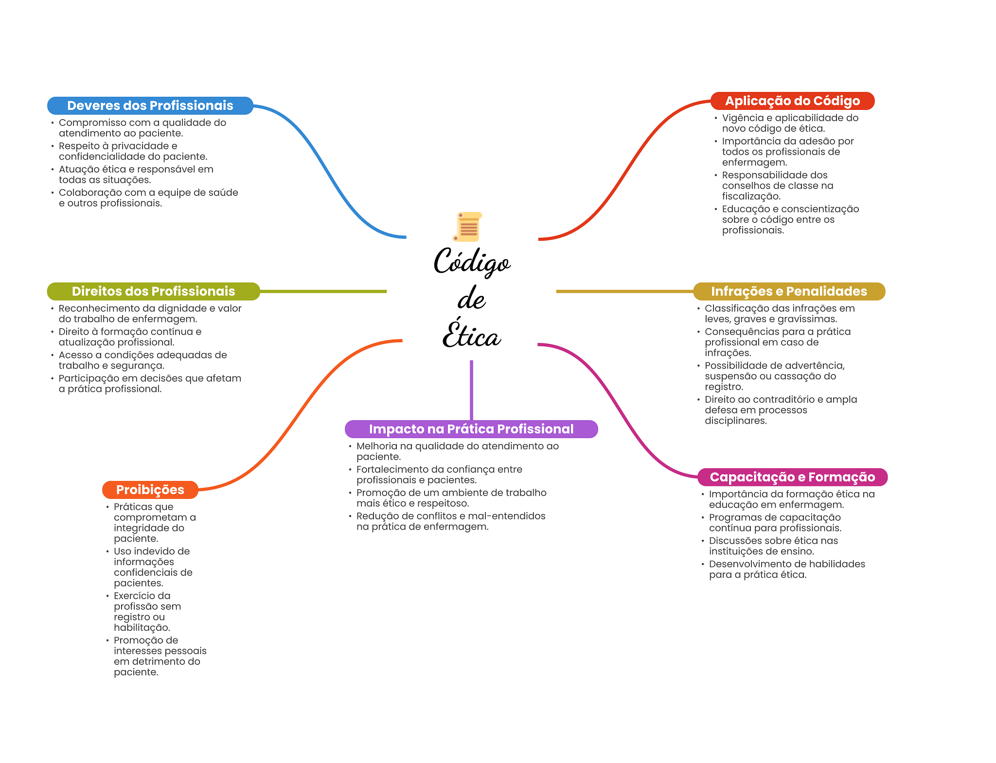 Deveres dos Profissionais Aplicação do Código Compromisso com a qualidade do Vigência e aplicabilidade do atendimento ao paciente. novo código de ética. Respeito à privacidade e Importância da adesão por confidencialidade do paciente. todos profissionais de enfermagem. Atuação ética e responsável em todas as situações. Responsabilidade dos conselhos de classe na Colaboração com a equipe de saúde fiscalização. e outros profissionais. Educação e conscientização sobre código entre os profissionais. Código Direitos dos Profissionais de Infrações e Penalidades Reconhecimento da dignidade e valor Classificação das infrações em do trabalho de enfermagem. atualização profissional. Ética leves, graves e gravíssimas. Direito à formação contínua e Consequências para a prática profissional em caso de Acesso a condições adequadas de infrações. trabalho e segurança. Possibilidade de advertência, Participação em decisões que afetam suspensão ou cassação do a prática profissional. registro. Direito ao contraditório e ampla defesa em processos disciplinares. Impacto na Prática Profissional Melhoria na qualidade do atendimento ao paciente. Fortalecimento da confiança entre profissionais e pacientes. Capacitação e Formação Proibições Promoção de um ambiente de trabalho Importância da formação ética na Práticas que mais ético e respeitoso. educação em enfermagem. comprometam a Redução de conflitos e mal-entendidos Programas de capacitação integridade do na prática de enfermagem. contínua para profissionais. paciente. Discussões sobre ética nas Uso indevido de instituições de ensino. informações Desenvolvimento de habilidades confidenciais de para a prática ética. pacientes. Exercício da profissão sem registro ou habilitação. Promoção de interesses pessoais em detrimento do paciente.