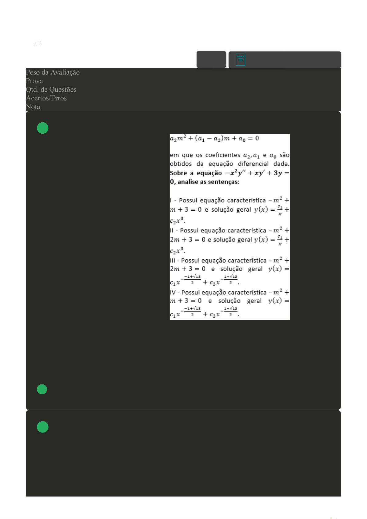 Prova Impressa GABARITO | Avaliação I - Individual (Cod.:1524008) Peso da Avaliação 2,00 Prova 108428611 Qtd. de Questões 10 Acertos/Erros 10/0 Nota 10,00 Para encontrar a solução das Equações de Cauchy-Euler homogêneas de segunda ordem, precisamos resolver a equação característica: A Somente a sentença III está correta. B Somente a sentença I está correta. C Somente a sentença IV está correta. D Somente a sentença II está correta. A solução geral de uma equação diferencial é uma família de funções que satisfazem a equação e estão ligadas por um ou mais parâmetros. A solução particular de uma equação diferencial é uma função que satisfaz a equação, neste caso, a função é única pois é livre de parâmetros. Sobre as soluções gerais e particulares, analise as sentenças a seguir: VOLTAR A+ Alterar modo de visualização 1 2 A As sentenças I e III estão corretas. B Somente a sentença II está correta. C Somente a sentença I está correta. D As sentenças II e III estão corretas. Para encontrar a solução geral de uma Equação Diferencial de ordem superior não homogênea, devemos encontrar a solução para equação homogênea associada e a solução particular yp. A solução geral é dada pela soma das soluções homogênea associada e particular. A As sentenças I e II estão corretas. B As sentenças II e III estão corretas. C As sentenças I e III estão corretas. D Somente a sentença IV está correta. 3 Resolver uma Equação Diferencial é encontrar uma função y(x) que ao ser substituída na equação, mantém a igualdade verdadeira. Essa função y(x) é chamada de solução da equação. Sobre a solução das Equações Diferencias, associe os itens, utilizando o código a seguir: A III - II - I. B II - I - III. C III - I - II. D I - II - III. A solução geral de Equações Diferenciais (ED) não é apenas uma função, são uma família de funções indexadas por um ou mais parâmetros. No entanto, o mesmo não acontece com os Problemas de Valor Inicial (PVIs). O Teorema da Existência e Unicidade das ED esclarece quando a solução existe e é única. Sobre o Teorema da Existência e Unicidade, analise as sentenças a seguir: I- O Teorema da Existência e Unicidade garante que com certas condições sobre a função, a solução de um PVI é única. II- O Teorema da Existência e Unicidade garante que a solução geral da Equação Diferencial é única e sempre existe. III- O Teorema da Existência e Unicidade garante a existência de solução para qualquer Equação Diferencial de forma que ela é única. Assinale a alternativa CORRETA: A Somente a sentença I está correta. B Somente a sentença II está correta. C As sentenças I e II estão corretas. D As sentenças II e III estão corretas. 4 5 Para encontrar a solução geral de uma Equação Diferencial linear homogênea com coeficientes constantes de ordem superior, basta utilizarmos a equação característica e a depender das raízes desta equação, teremos a solução para a Equação Diferencial. A As sentenças I e III estão corretas. B Somente a sentença II está correta. C As sentenças I e II estão corretas. D Somente a sentença III está correta. Geralmente, equações homogêneas são mais simples de serem resolvidas, em comparação com equações não homogêneas. Para verificar se uma função é homogênea, basta colocá-la na forma padrão: 6 7 A Somente a sentença III está correta. B As sentenças I, II e IV estão corretas. C Somente a sentença I está correta. D As sentenças II, III e IV estão corretas. A solução geral de Equações Diferenciais homogêneas de segunda ordem é dada pela combinação linear de duas funções Linearmente Independentes y1 e y2. Para verificar se duas funções são Linearmente Independentes, calculamos o Wronskiano dessas duas funções. A V - V - F. B F - F - F. C F - V - V. D V - V - V. O método dos coeficientes indeterminados é utilizado para encontrar a solução particular de Equações Diferenciais não homogêneas. O método baseia-se em supor que a função solução yp possui uma forma semelhante à função g(x), retirada de equações do tipo: 8 9 A Somente a sentença I está correta. B Somente a sentença IV está correta. C Somente a sentença III está correta. D Somente a sentença II está correta. Existem diversos métodos para encontrar a solução de Equações Diferenciais, cada método é útil para certo tipo de equação, geralmente, decidimos qual método utilizar por meio da classificação das equações. Sobre a classificação de Equações Diferenciais, classifique V para as sentenças verdadeiras e F para as falsas: ( ) Podem ser classificadas como Lineares (não possuem derivadas), Ordinárias (possuem derivadas ordinárias) ou Parciais (possuem derivadas parciais). ( ) Podem ser classificadas de acordo com a derivada de maior ordem da equação. ( ) Podem ser classificadas como lineares sempre que y e suas derivadas são de primeiro grau, ou seja, y e suas derivadas estão sendo elevados à primeira potência. ( ) Podem ser denominadas como lineares quando satisfazem duas condições: os coeficientes de y e suas derivadas dependem no máximo de uma variável; a função y e suas derivadas são de primeiro grau, ou seja, y e suas derivadas estão sendo elevados à primeira potência. Assinale a alternativa que apresenta a sequência CORRETA: A F - V - V - V. B F - V - F - V. 10 C V - F - V - F. D V - F - F - V. Imprimir