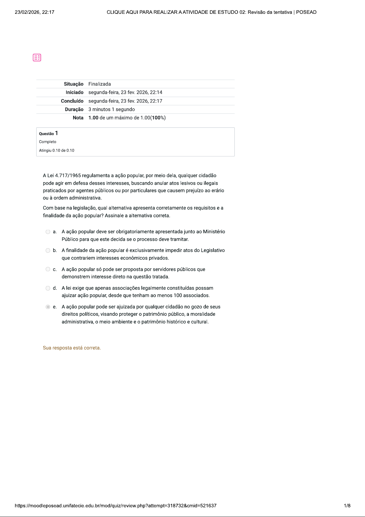 23/02/2026, 22:17 CLIQUE AQUI PARA REALIZAR AATIVIDADE DE ESTUDO 02: Revisão da tentativa POSEAD Situação Finalizada Iniciado segunda-feira, 23 fev. 2026, 22:14 Concluído segunda-feira, 23 fev. 2026, 22:17 Duração 3 minutos 1 segundo Nota 1.00 de um máximo de 1.00(100%) Questão 1 Completo Atingiu 0.10 de 0.10 A Lei 4.717/1965 regulamenta a ação popular, por meio dela, qualquer cidadão pode agir em defesa desses interesses, buscando anular atos lesivos ou ilegais praticados por agentes públicos ou por particulares que causem prejuízo ao erário ou à ordem administrativa. Com base na legislação, qual alternativa apresenta corretamente os requisitos e a finalidade da ação popular? Assinale a alternativa correta. a. A ação popular deve ser obrigatoriamente apresentada junto ao Ministério Público para que este decida se o processo deve tramitar. b. A finalidade da ação popular é exclusivamente impedir atos do Legislativo que contrariem interesses econômicos privados. A ação popular só pode ser proposta por servidores públicos que demonstrem interesse direto na questão tratada. d. A lei exige que apenas associações legalmente constituídas possam ajuizar ação popular, desde que tenham ao menos 100 associados. e. A ação popular pode ser ajuizada por qualquer cidadão no gozo de seus direitos políticos, visando proteger o patrimônio público, a moralidade administrativa, o meio ambiente e o patrimônio histórico e cultural. Sua resposta está correta. 1/823/02/2026, 22:17 CLIQUE AQUI PARA REALIZAR AATIVIDADE DE ESTUDO 02: Revisão da tentativa POSEAD Questão 2 Completo Atingiu 0.10 de 0.10 A Ação Civil Pública é um instrumento processual previsto pela Lei 7.347/1985 e pela Constituição Federal. Por meio dela, é possível exigir que empresas ou indivíduos cumpram com suas obrigações legais, reponham danos causados à coletividade e adotem medidas para prevenir novas violações. Com base nessa definição, qual alternativa descreve corretamente a Ação Civil Pública? Assinale a alternativa correta. a. Ação destinada exclusivamente à fiscalização de contratos administrativos. b. Mecanismo de defesa exclusivamente de interesses individuais de associações. Instrumento destinado à proteção de interesses difusos, coletivos e individuais homogêneos, como meio ambiente e direitos do consumidor. d. Recurso utilizado por particulares para pleitear indenizações por danos morais. e. Procedimento aplicável apenas a relações entre servidores e a administração pública. Sua resposta está correta. 2/823/02/2026, 22:17 CLIQUE AQUI PARA REALIZAR AATIVIDADE DE ESTUDO 02: Revisão da tentativa POSEAD Questão 3 Completo Atingiu 0.10 de 0.10 mandado de segurança é um remédio constitucional que tem como objetivo garantir a proteção de direitos fundamentais, sendo frequentemente utilizado para salvaguardar interesses que envolvem a atuação do poder público. Ele pode ser impetrado em situações que envolvem a violação de direitos individuais e coletivos, e sua análise se dá de forma célere, visando a efetividade da tutela jurisdicional. Entretanto, existem algumas situações em que o mandado de segurança não é cabível, conforme estabelecido pela legislação. Considerando o exposto, assinale a alternativa correta. a. mandado de segurança é cabível para proteger o direito de acesso à informação pública, conforme previsto na Lei de Acesso à Informação. b. 0 mandado de segurança não pode ser utilizado para contestar atos administrativos que criem obrigações ou penalidades, pois essas questões devem ser tratadas em esfera específica. mandado de segurança é cabível para proteger o direito de acesso à informação individual privada, conforme previsto na Lei de Acesso à Informação. d. mandado de segurança pode ser utilizado para impugnar decisões proferidas em sede de ações judiciais, independentemente de esgotamento de outras vias recursais. e. mandado de segurança é um remédio constitucional que não admite a concessão de liminar, pois todas as decisões devem ser proferidas em audiência. Sua resposta está correta. 3/823/02/2026, 22:17 CLIQUE AQUI PARA REALIZAR AATIVIDADE DE ESTUDO 02: Revisão da tentativa POSEAD Questão 4 Completo Atingiu 0.10 de 0.10 STJ exerce um papel central, assegurando que a aplicação dos remédios constitucionais ocorra de forma consistente e coerente em todas as regiões do Brasil. Esse trabalho é essencial para garantir a segurança jurídica e evitar divergências interpretativas que possam prejudicar a aplicação desses instrumentos em situações semelhantes. Qual alternativa reflete corretamente a atuação do STJ nesse contexto? Assinale a alternativa correta. a. As decisões do STJ sobre remédios constitucionais são apenas orientações e não vinculam os tribunais inferiores. b. STJ pode modificar livremente os textos legais relacionados aos remédios constitucionais para adaptá-los às realidades regionais. A atuação do STJ está limitada às causas de competência exclusiva da União, sem interferir em processos estaduais. d. STJ tem o papel de uniformizar a jurisprudência dos Tribunais de Justiça e dos Tribunais Regionais Federais, garantindo a aplicação coerente dos remédios constitucionais em todo o território nacional. e. A uniformização das decisões pelo STJ se aplica apenas aos processos envolvendo mandado de segurança individual. Sua resposta está correta. Questão 5 Completo Atingiu 0.10 de 0.10 A Ação Civil Pública busca reparar danos que afetam interesses coletivos e difusos, e a responsabilidade pode envolver não apenas a reparação financeira, mas também medidas para cessar a prática ilícita e restaurar o bem lesado. Com base nisso, qual tipo de dano pode ser reparado por meio da Ação Civil Pública? Assinale a alternativa correta. a. Despesas processuais de um contrato mal-executado entre duas partes privadas. b. Danos es