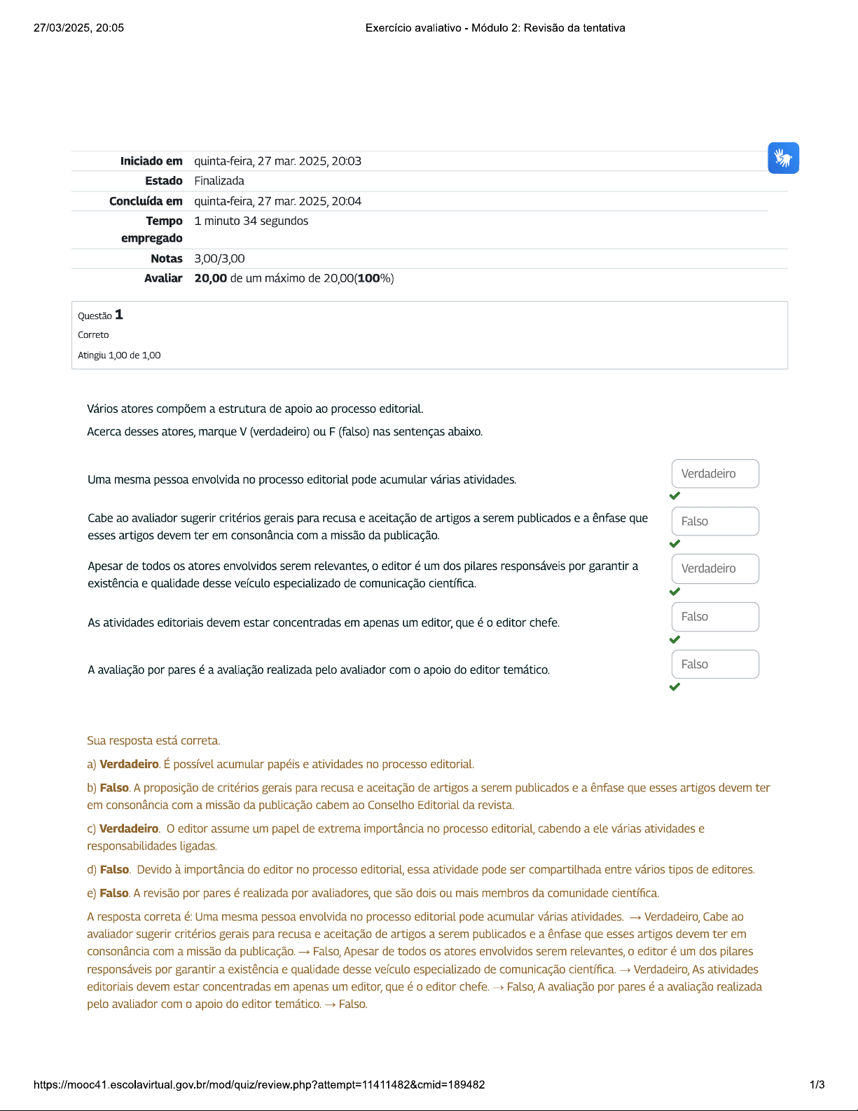 27/03/2025, 20:05 Exercício avaliativo Módulo 2: Revisão da tentativa Iniciado em quinta-feira, 27 mar. 2025, 20:03 Estado Finalizada Concluída em quinta-feira, 27 mar. 2025, 20:04 Tempo 1 minuto 34 segundos empregado Notas 3,00/3,00 Avaliar 20,00 de um máximo de 20,00(100%) Questão 1 Correto Atingiu 1,00 de 1,00 Vários atores compõem a estrutura de apoio ao processo editorial. Acerca desses atores, marque V (verdadeiro) ou F (falso) nas sentenças abaixo. Verdadeiro Uma mesma pessoa envolvida no processo editorial pode acumular várias atividades. Cabe ao avaliador sugerir critérios gerais para recusa e aceitação de artigos a serem publicados e a ênfase que Falso esses artigos devem ter em consonância com a missão da publicação. Apesar de todos os atores envolvidos serem relevantes, editor é um dos pilares responsáveis por garantir a Verdadeiro existência e qualidade desse veículo especializado de comunicação científica. Falso As atividades editoriais devem estar concentradas em apenas um editor, que é 0 editor chefe. Falso A avaliação por pares é a avaliação realizada pelo avaliador com 0 apoio do editor temático. Sua resposta está correta. a) Verdadeiro. É possível acumular papéis e atividades no processo editorial. b) Falso. A proposição de critérios gerais para recusa e aceitação de artigos a serem publicados e a ênfase que esses artigos devem ter em consonância com a missão da publicação cabem ao Conselho Editorial da revista. c) Verdadeiro. editor assume um papel de extrema importância no processo editorial, cabendo a ele várias atividades e responsabilidades ligadas. d) Falso. Devido à importância do editor no processo editorial, essa atividade pode ser compartilhada entre vários tipos de editores. e) Falso. A revisão por pares é realizada por avaliadores, que são dois ou mais membros da comunidade científica. A resposta correta é: Uma mesma pessoa envolvida no processo editorial pode acumular várias atividades. Verdadeiro, Cabe ao avaliador sugerir critérios gerais para recusa e aceitação de artigos a serem publicados e a ênfase que esses artigos devem ter em consonância com a missão da publicação. Falso, Apesar de todos atores envolvidos serem relevantes, editor é um dos pilares responsáveis por garantir a existência e qualidade desse veículo especializado de comunicação científica. Verdadeiro, As atividades editoriais devem estar concentradas em apenas um editor, que é editor chefe. Falso, A avaliação por pares é a avaliação realizada pelo avaliador com 0 apoio do editor temático. Falso. htps://mooc41.escolavirtual.gov.br/mod/quiz/review.php?attempt=114114828cmid=189482 1/327/03/2025, 20:05 Exercício avaliativo Módulo 2: Revisão da tentativa Questão 2 Correto Atingiu 1,00 de 1,00 fluxo de atividades do processo editorial envolve três momentos principais: pré-submissão, submissão e pós-submissão. Suponhamos que você deseja submeter seu artigo cientifico para avaliação. Contudo, algumas etapas precisam ser seguidas. Acerca da pré-submissão, da submissão e da pós-submissão do seu artigo, marque V (verdadeiro) ou F (falso) nas sentenças abaixo. Uma importante decisão da sua parte deve ser tomada na pré-submissão: a escolha da revista para onde Verdadeiro submeter artigo. Falso artigo não precisa seguir as diretrizes do periódico escolhido, pois a equipe da revista se encarrega das normas. idioma utilizado por você na redação do artigo traz poucos impactos significativos para a sua visibilidade junto Falso à comunidade científica. Para submeter seu artigo a um periódico, é preciso que você como autor concorde e aceite as condições do Verdadeiro periódico. Verdadeiro Algumas revistas podem cobrar uma taxa de submissão para auxiliar a administração editorial. Sua resposta está correta. a) Verdadeiro. Essa decisão irá influenciar todo 0 processo avaliativo já que 0 artigo deve estar alinhado com a linha editorial do periódico e pode ser recusado por não se enquadrar no escopo da publicação escolhida. b) Falso. autor deverá redigir seu artigo segundo diretrizes do periódico escolhido, desde a quantidade de páginas, tipo de letra e espaçamento, até a necessidade de seguir outros requisitos, como ser original e inédito. c) Falso. idioma utilizado na redação do artigo também é fator que impacta a sua visibilidade junto à comunidade científica. d) Verdadeiro. A submissão de um artigo a um periódico implica aceite e atendimento automático de algumas condições. e) Verdadeiro. Tanto as revistas de acesso restrito quanto as de acesso aberto podem cobrar uma taxa para a submissão do manuscrito com objetivo de auxiliar a financiar a administração editorial. A resposta correta é: Uma importante decisão da sua parte deve ser tomada na pré-submissão: a escolha da revista para onde submeter artigo. Verdadeiro, artigo não precisa seguir as diretrizes do periódico escolhido, pois a equipe da revista se encarrega das normas. Falso, idioma utilizado por você na redação do artigo traz poucos impactos significativos para a sua visibilidade junto à comunidade científica. Falso, Para submeter seu artigo a um periódico, é preciso que você como autor concorde e aceite as condições do periódico. Verdadeiro, Algumas revistas podem cobrar uma taxa de submissão para auxiliar a administração editorial. Verdadeiro. 2/327/03/2025, 20:05 Exercício avaliativo Módulo 2: Revisão da tentativa Questão Correto Atingiu 1,00 de 1,00 fluxo de atividades do processo editorial envolve três momentos principais: pré-submissão, submissão e pós-submissão. Acerca da pós-submissão, marque V (verdadeiro) ou F (falso) nas sentenças abaixo. Verdadeiro Assim que artigo é submetido, 0 editor faz uma avaliação inicial, que pode resultar na rejeição. Falso Após a triagem feita pelo editor na pós-submissão, artigo segue para publicação. Verdadeiro A etapa de 