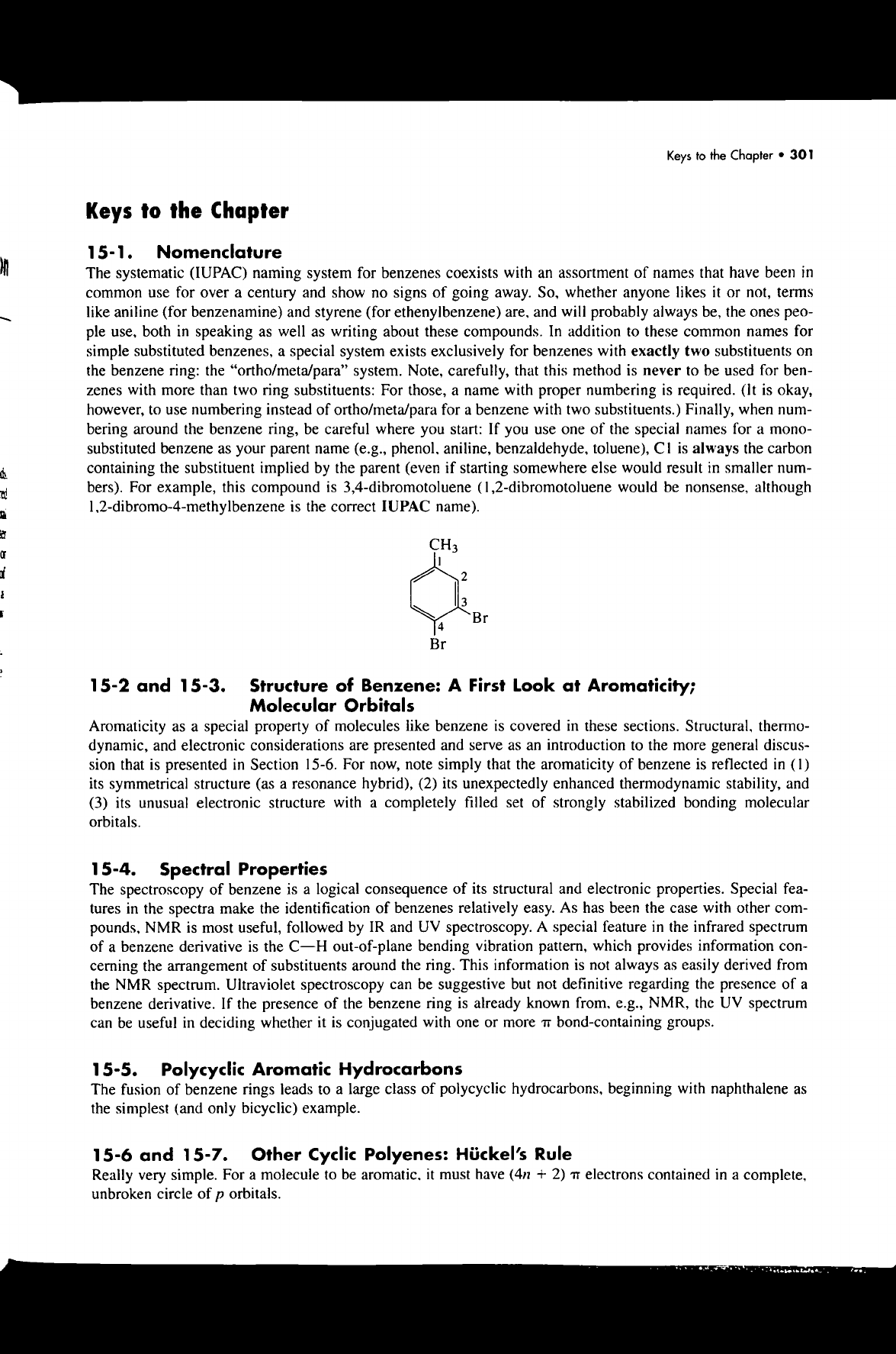 Keys to the Chapter 301 Keys to the Chapter 15-1. Nomenclature The systematic (IUPAC) naming system for benzenes coexists with an assortment of names that have been in common use for over a century and show no signs of going away. So, whether anyone likes it or not, terms like aniline (for benzenamine) and styrene (for ethenylbenzene) are, and will probably always be, the ones peo- ple use, both in speaking as well as writing about these compounds. In addition to these common names for simple substituted benzenes, a special system exists exclusively for benzenes with exactly two substituents on the benzene ring: the "ortho/meta/para" system. Note, carefully, that this method is never to be used for ben- zenes with more than two ring substituents: For those, a name with proper numbering is required. (It is okay, however, to use numbering instead of ortho/meta/para for a benzene with two substituents.) Finally, when num- bering around the benzene ring, be careful where you start: If you use one of the special names for a mono- substituted benzene as your parent name (e.g., phenol, aniline, benzaldehyde, toluene), CI is always the carbon containing the substituent implied by the parent (even if starting somewhere else would result in smaller num- bers). For example, this compound is 3,4-dibromotoluene (1,2-dibromotoluene would be nonsense, although 1,2-dibromo-4-methylbenzene is the correct IUPAC name). CH₃ 2 3 Br 4 Br 15-2 and 15-3. Structure of Benzene: A First Look at Aromaticity; Molecular Orbitals Aromaticity as a special property of molecules like benzene is covered in these sections. Structural, thermo- dynamic, and electronic considerations are presented and serve as an introduction to the more general discus- sion that is presented in Section 15-6. For now, note simply that the aromaticity of benzene is reflected in (1) its symmetrical structure (as a resonance hybrid), (2) its unexpectedly enhanced thermodynamic stability, and (3) its unusual electronic structure with a completely filled set of strongly stabilized bonding molecular orbitals. 15-4. Spectral Properties The spectroscopy of benzene is a logical consequence of its structural and electronic properties. Special fea- tures in the spectra make the identification of benzenes relatively easy. As has been the case with other com- pounds, NMR is most useful, followed by IR and UV spectroscopy. A special feature in the infrared spectrum of a benzene derivative is the C-H out-of-plane bending vibration pattern, which provides information con- cerning the arrangement of substituents around the ring. This information is not always as easily derived from the NMR spectrum. Ultraviolet spectroscopy can be suggestive but not definitive regarding the presence of a benzene derivative. If the presence of the benzene ring is already known from, e.g., NMR, the UV spectrum can be useful in deciding whether it is conjugated with one or more bond-containing groups. 15-5. Polycyclic Aromatic Hydrocarbons The fusion of benzene rings leads to a large class of polycyclic hydrocarbons, beginning with naphthalene as the simplest (and only bicyclic) example. 15-6 and 15-7. Other Cyclic Polyenes: Hückel's Rule Really very simple. For a molecule to be it must have (4n + 2) electrons contained in a complete, unbroken circle of p orbitals.